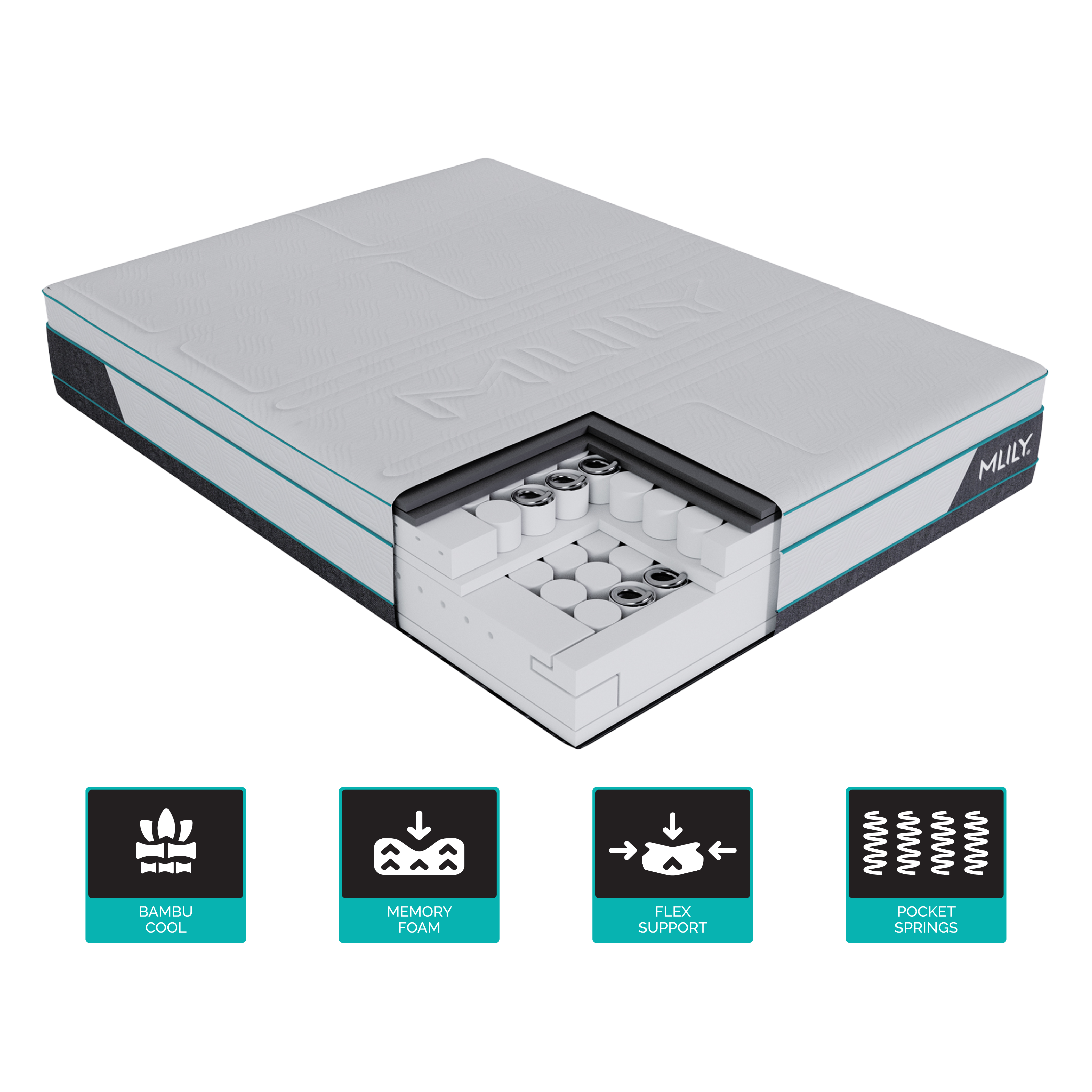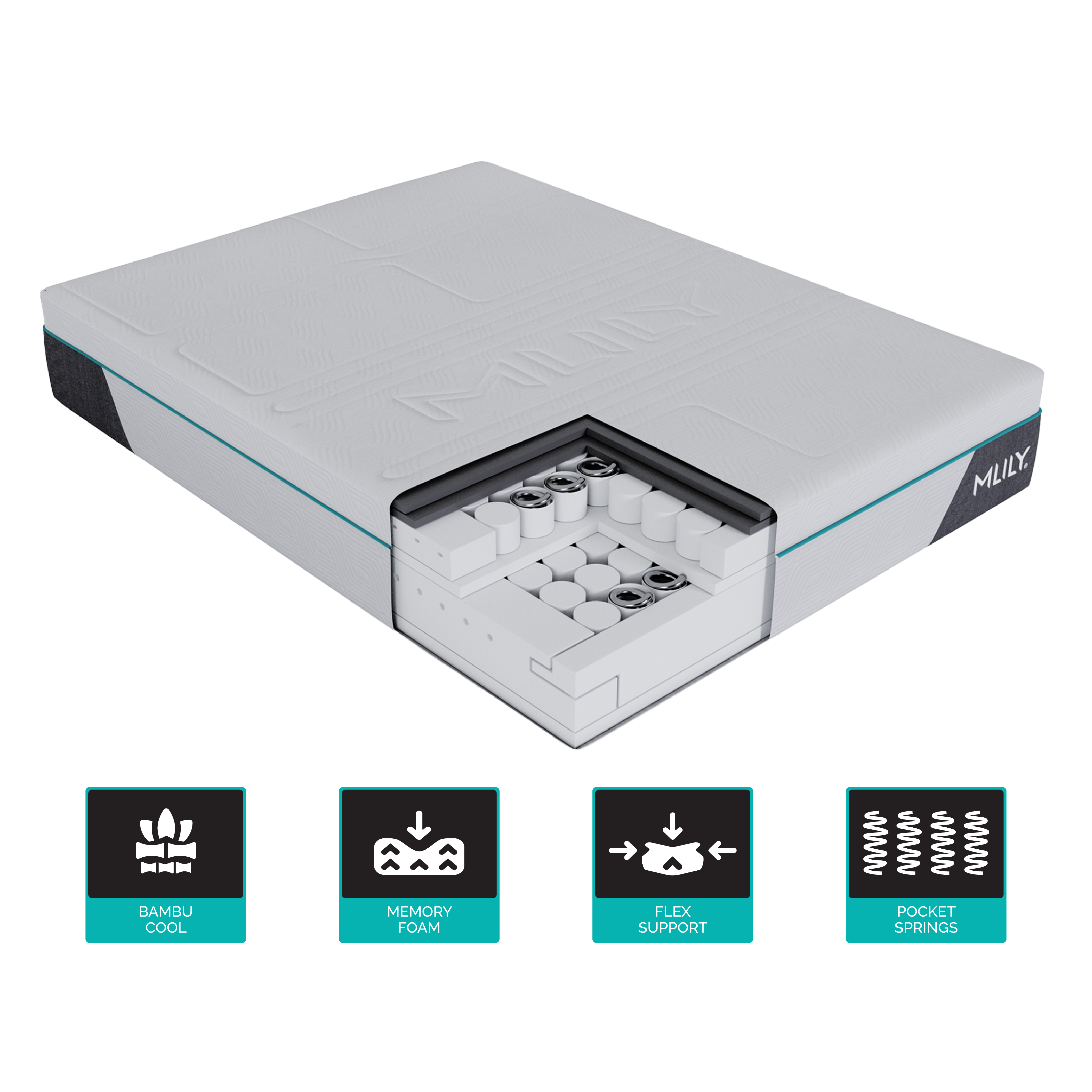 mattress, featuring a quilted BambuCool Memory Foam layer for optimal temperature control and pressure relief. This hypoallergenic and absorbent mattress includes 1000 Hybrid Deluxe Mini Springs and 3000 FlexDeluxe Pocket Springs for exceptional comfort and breathability. An innovative Flex Support Border ensures edge-to-edge stability, while added Flex Comfort Foam and a robust Flex Support Foam base provide luxurious support.