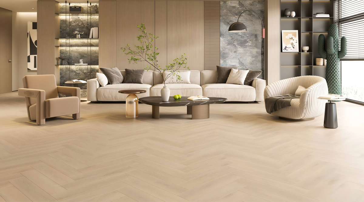 This 12mm Herringbone Domo Oak laminate combines the classic elegance of herringbone design with advanced durability, rated AC5 for high traffic areas. Its easy click installation system ensures a precise and secure fit without complications, while compatibility with underfloor heating provides efficient warmth. Ideal for both residential and commercial spaces seeking a sophisticated, resilient flooring solution.