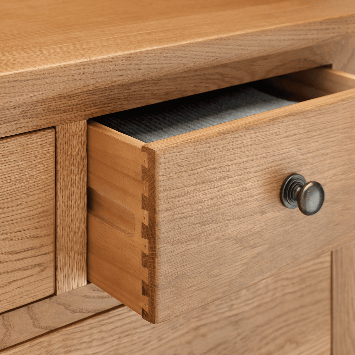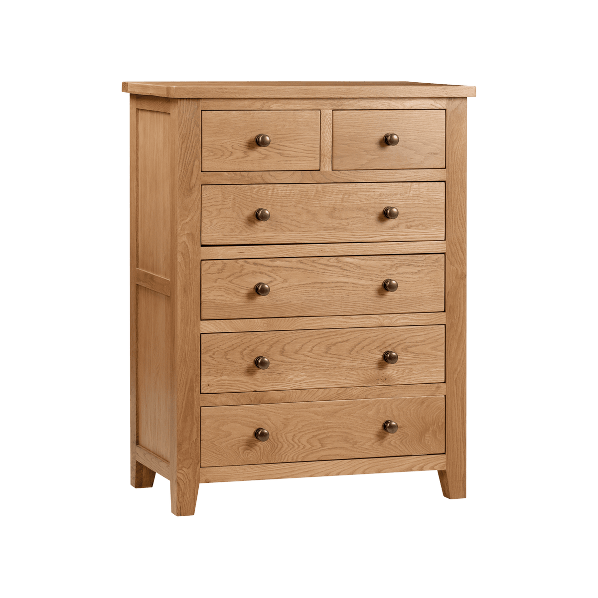 This elegant Adare oak chest of drawers features six spacious compartments, perfect for your storage needs. Crafted with precision, it showcases dovetail joints and a natural wood finish, adding a touch of timeless beauty to any room. The sturdy legs and classic design ensure durability and style that lasts.