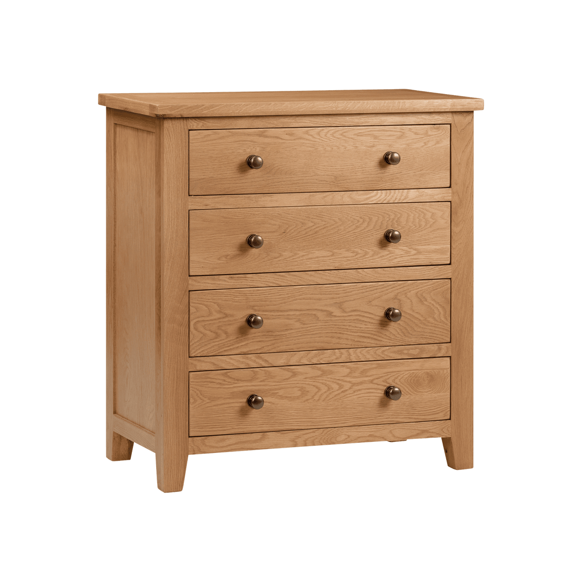 Introducing our exquisite Adare Oak Chest of Drawers, crafted with premium solid oak and finished with a clear lacquer for enhanced durability and a natural look. Featuring four spacious drawers with antique-style metal knobs, this piece effortlessly combines functionality and timeless elegance. Perfect for any bedroom or living space, it adds a touch of classic charm and ample storage to your home decor.