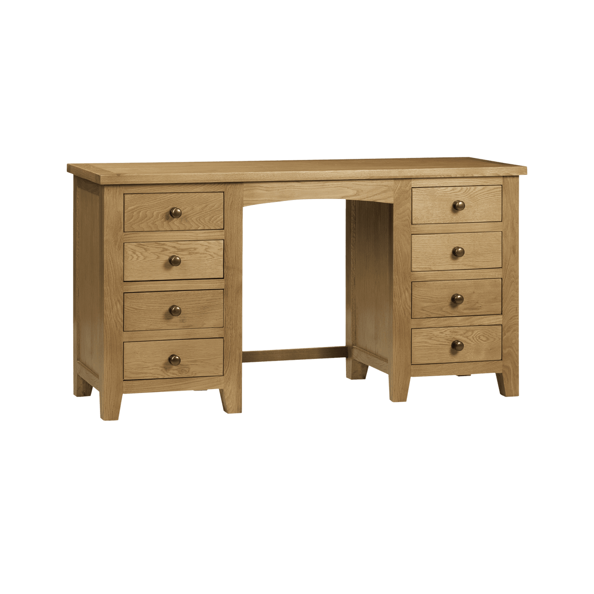 Introducing our elegantly crafted Adare dressing table set, featuring a spacious tabletop and ample storage with eight smoothly gliding drawers. This set includes a comfortable, padded stool with a durable wooden frame. Made from high-quality oak, it boasts a timeless design and sturdy build, perfect for enhancing the functionality and aesthetics of any bedroom.