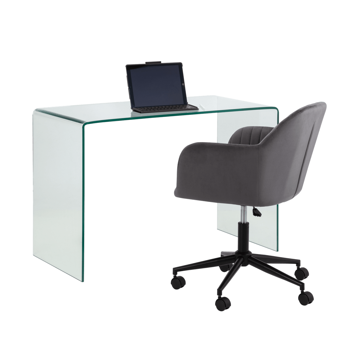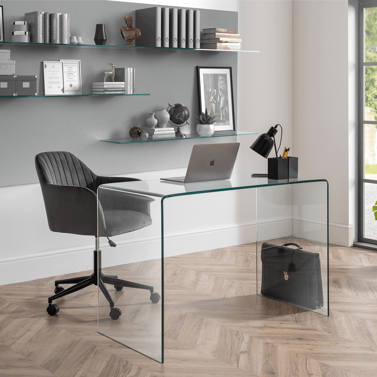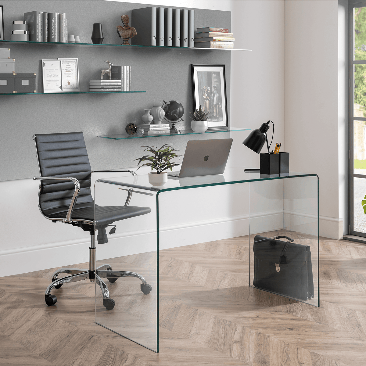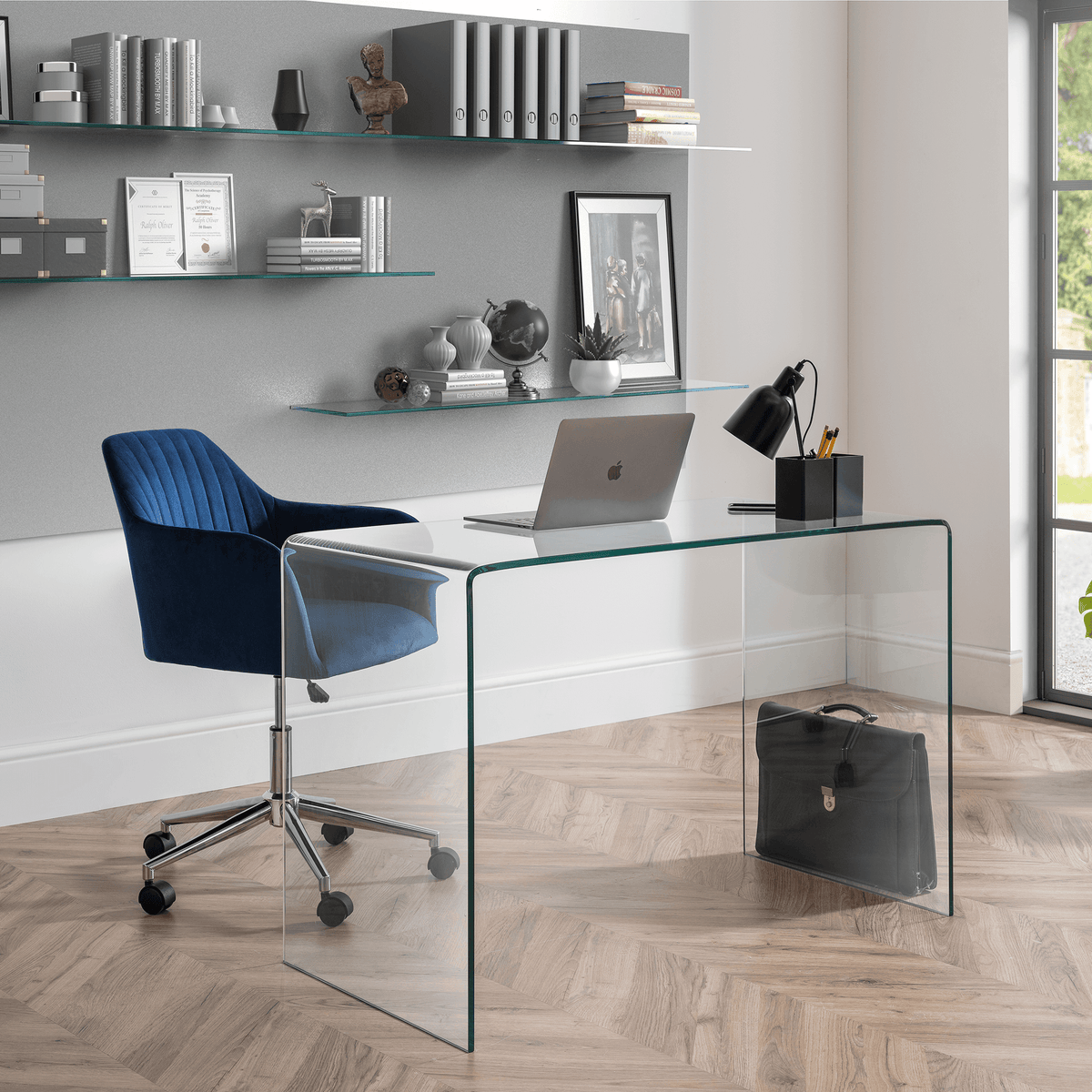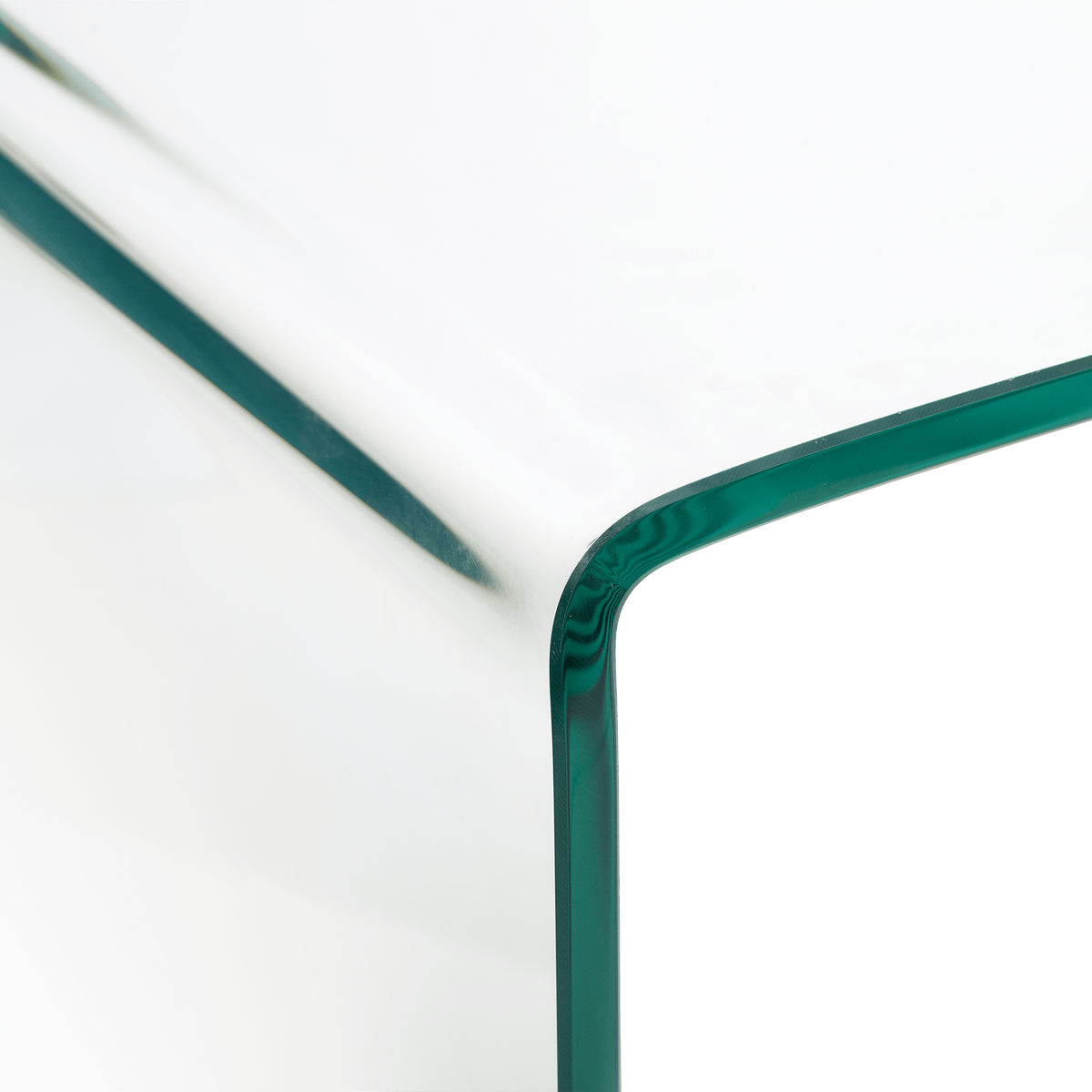 The Alfie Bent Glass Desk combines modern aesthetics with exceptional craftsmanship. Made from high-quality glass, its sleek lines and smooth curves offer a sophisticated workspace. Perfect for home offices or study areas, this desk embodies contemporary elegance and functionality.