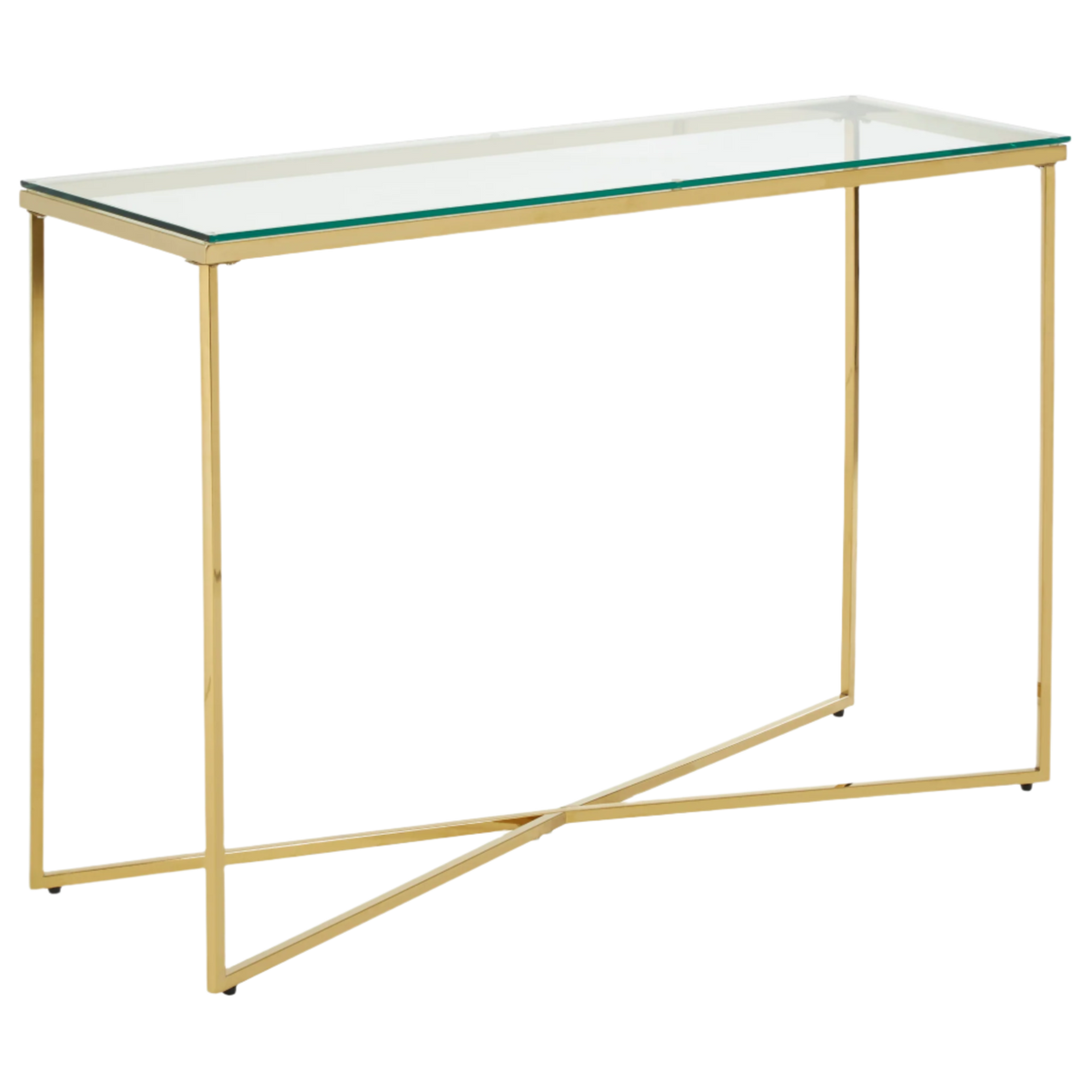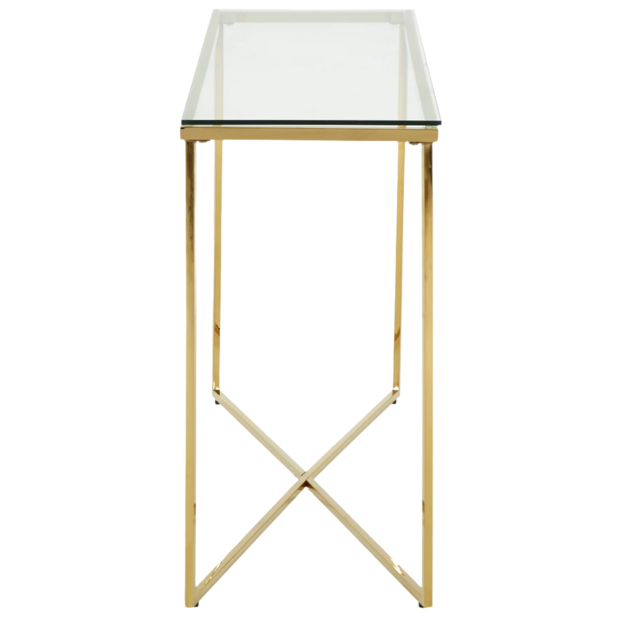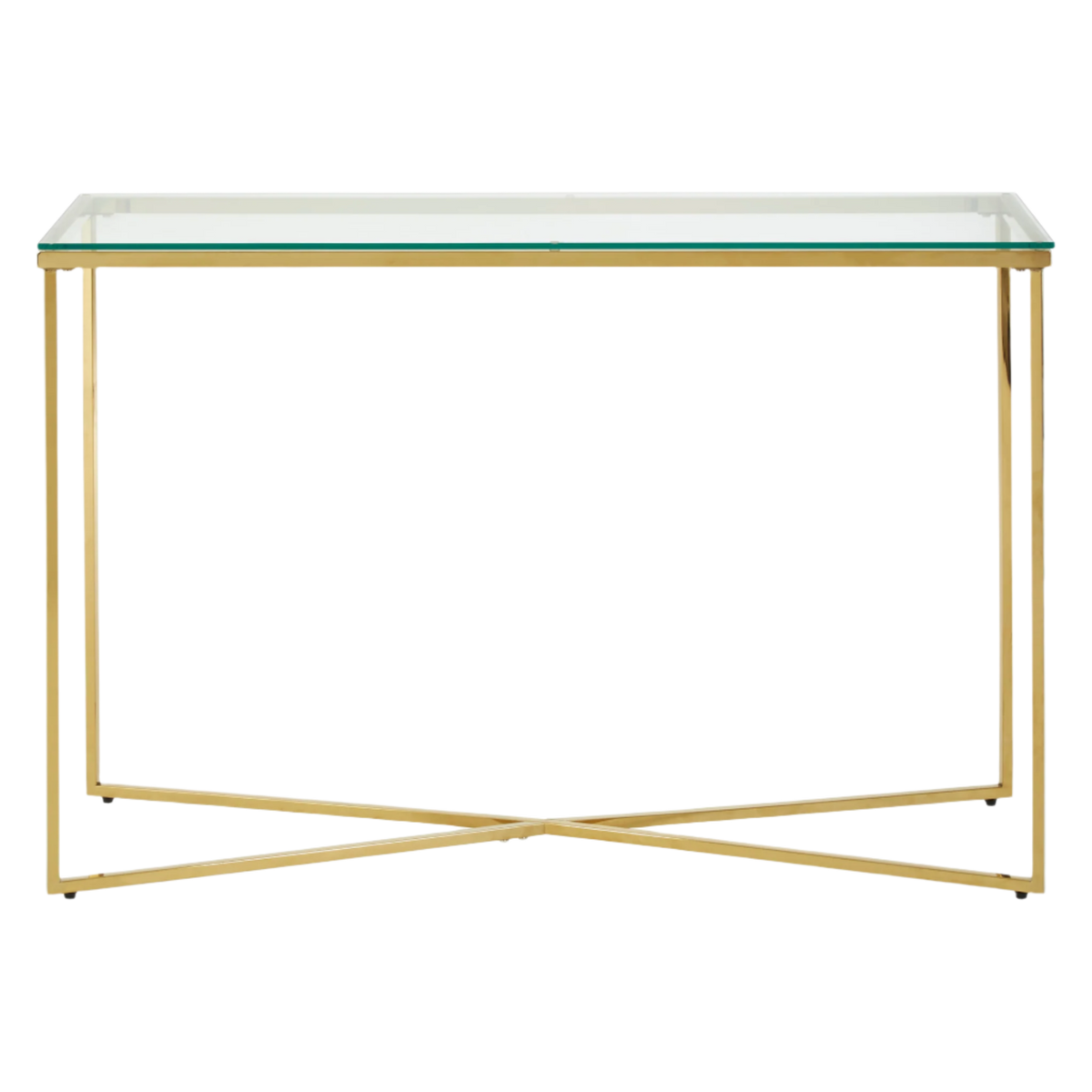 This console table makes a sophisticate impression thanks to its minimal-style frame, with an intersecting base for a subtle design flourish. The frame is finished in gold for a luxurious look and is reflective. The gold creates the perfect partner for the sleek clear tempered glass top. Pair it with luxe furniture.