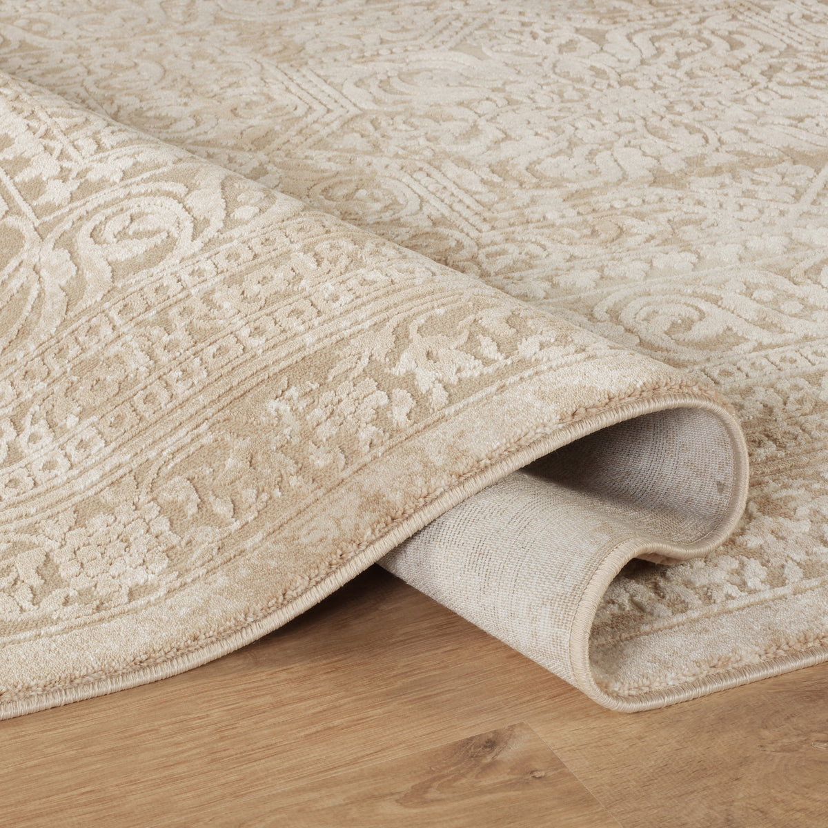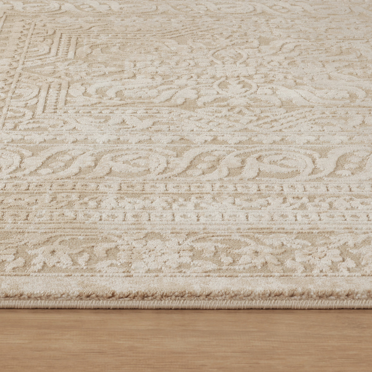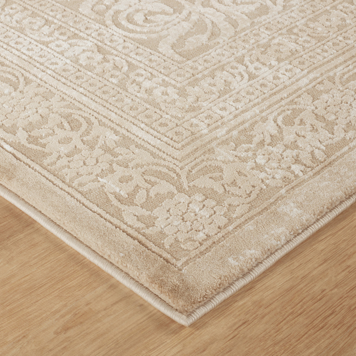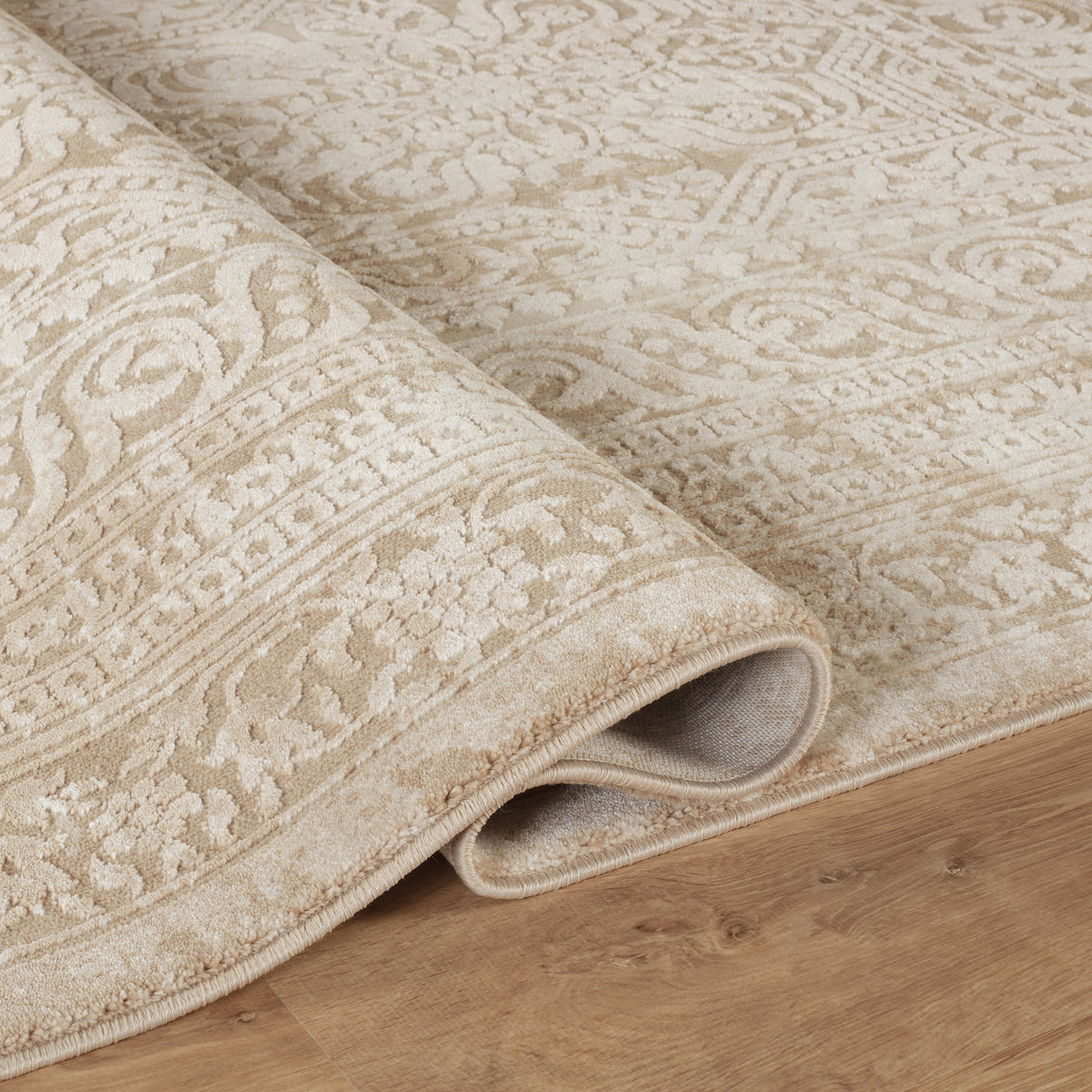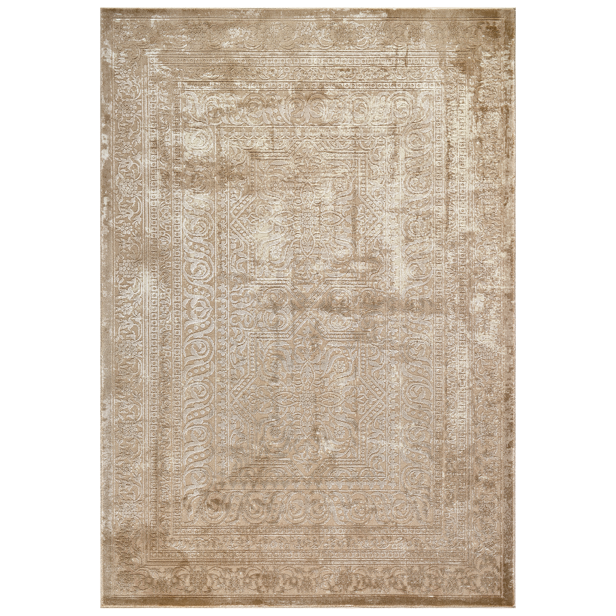 The Alvita Plus Morocco Rug features a distressed, vintage-inspired design dominated by neutral tones. The design includes ornate scrolls, florals, and geometric shapes that frame the central part of the rug, which itself has a faded look, adding to the aged, elegant appearance.