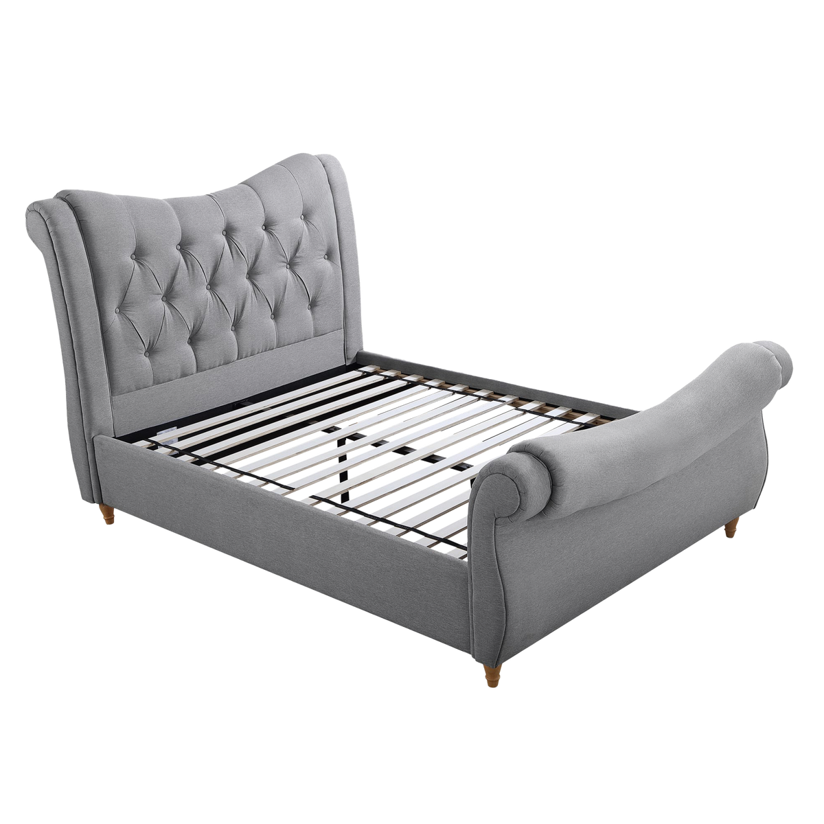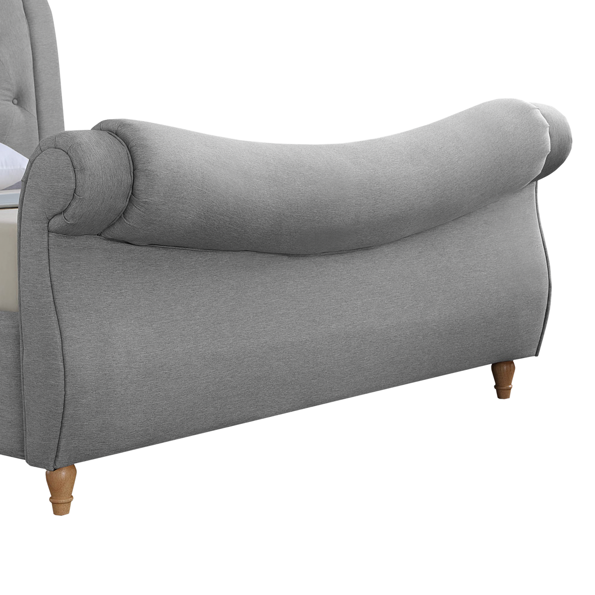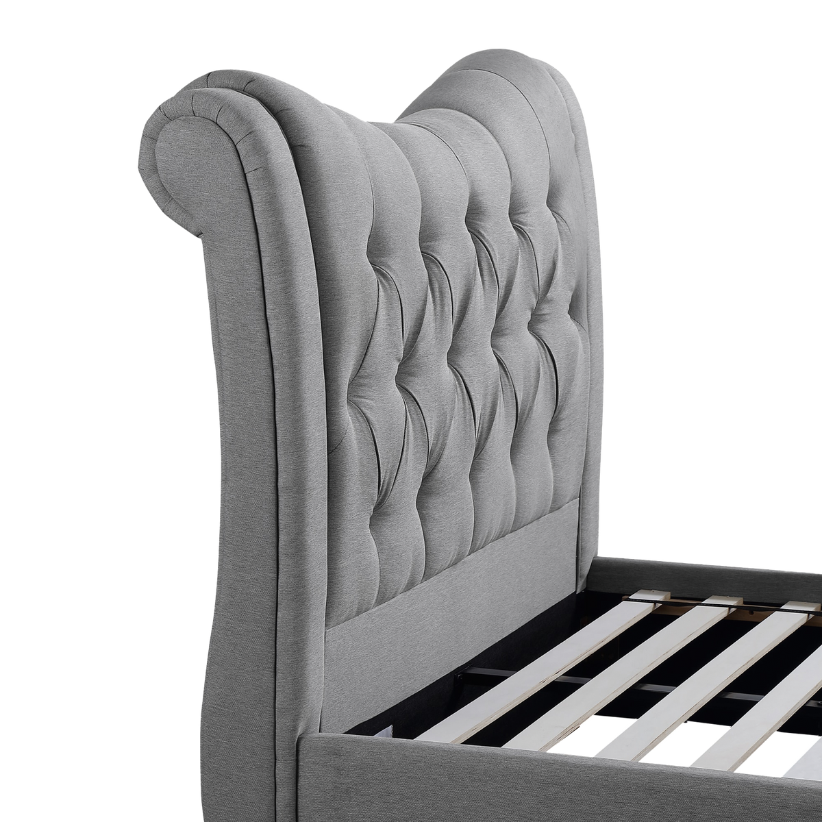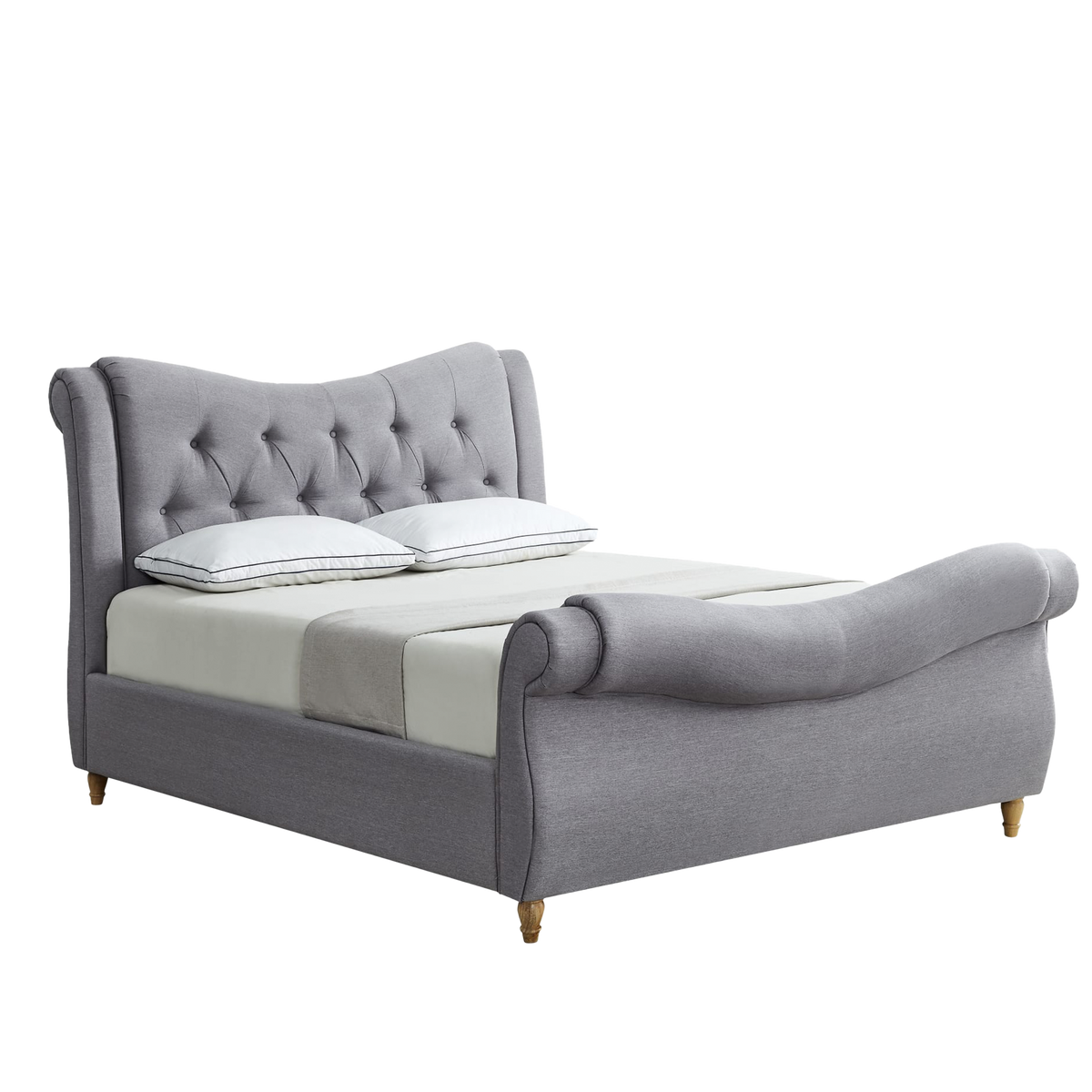 Upholstered in high-quality grey linen and featuring classic button-tufted detailing, this bed adds a touch of timeless charm. The bed showcases a distinctive curved dip design in both the headboard and footboard, creating a graceful and refined silhouette.
