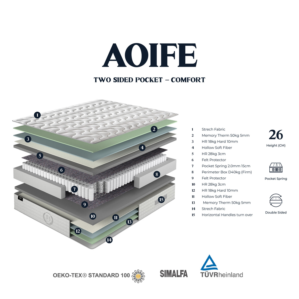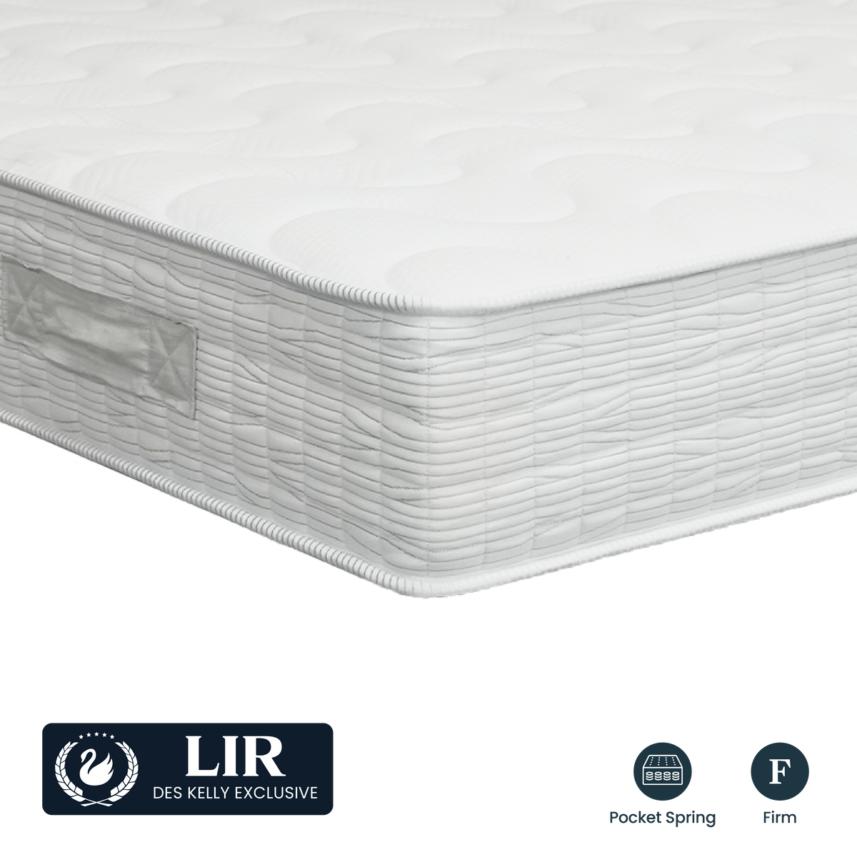 Experience ultimate comfort with the Aoife Mattress from our Lir Collection. This double-sided mattress features a robust pocket spring system, ensuring independent movement for each spring, which provides excellent contouring to your body. Enhanced with a felt protector, this mattress is built for durability, protecting the inner layers while providing long-lasting performance and comfort.