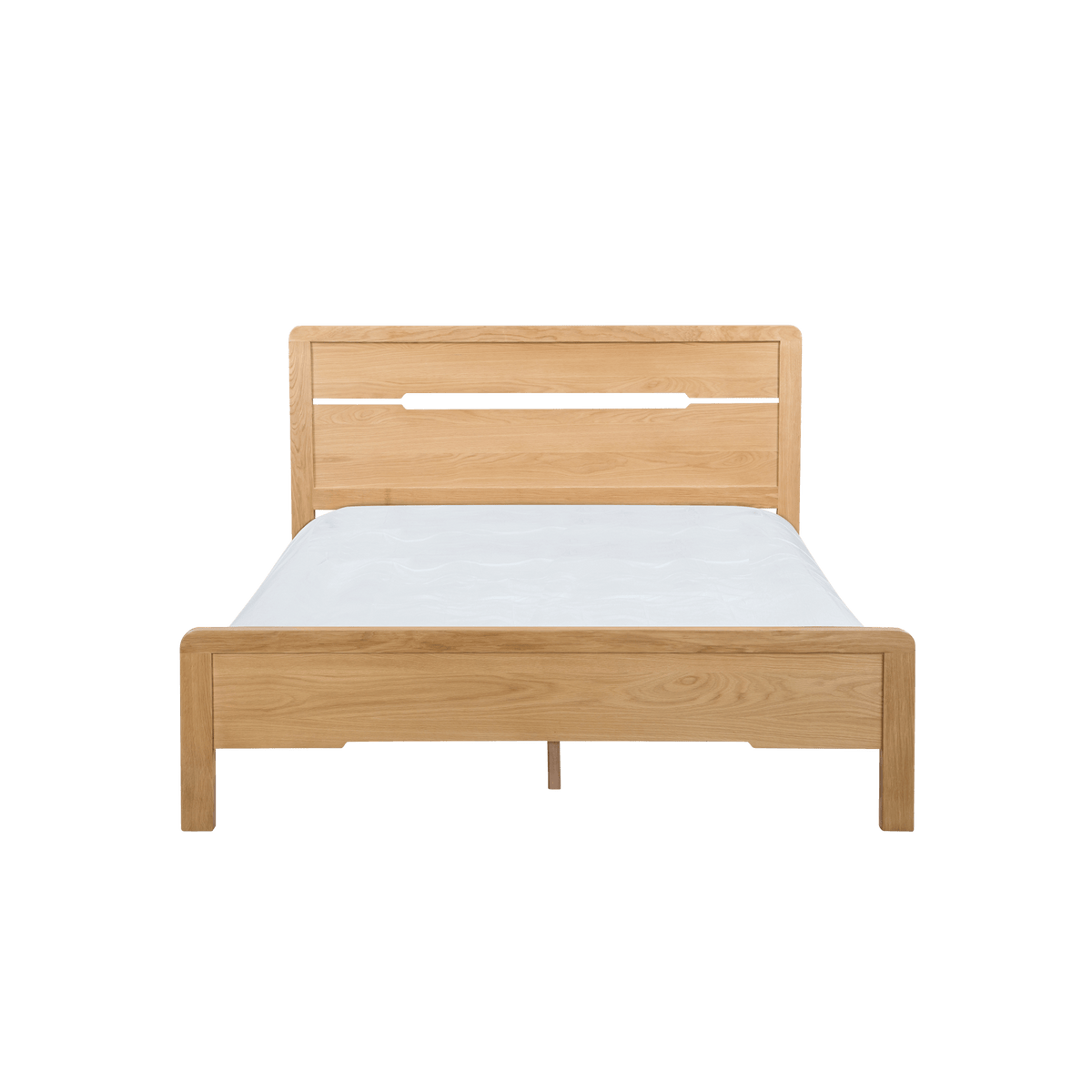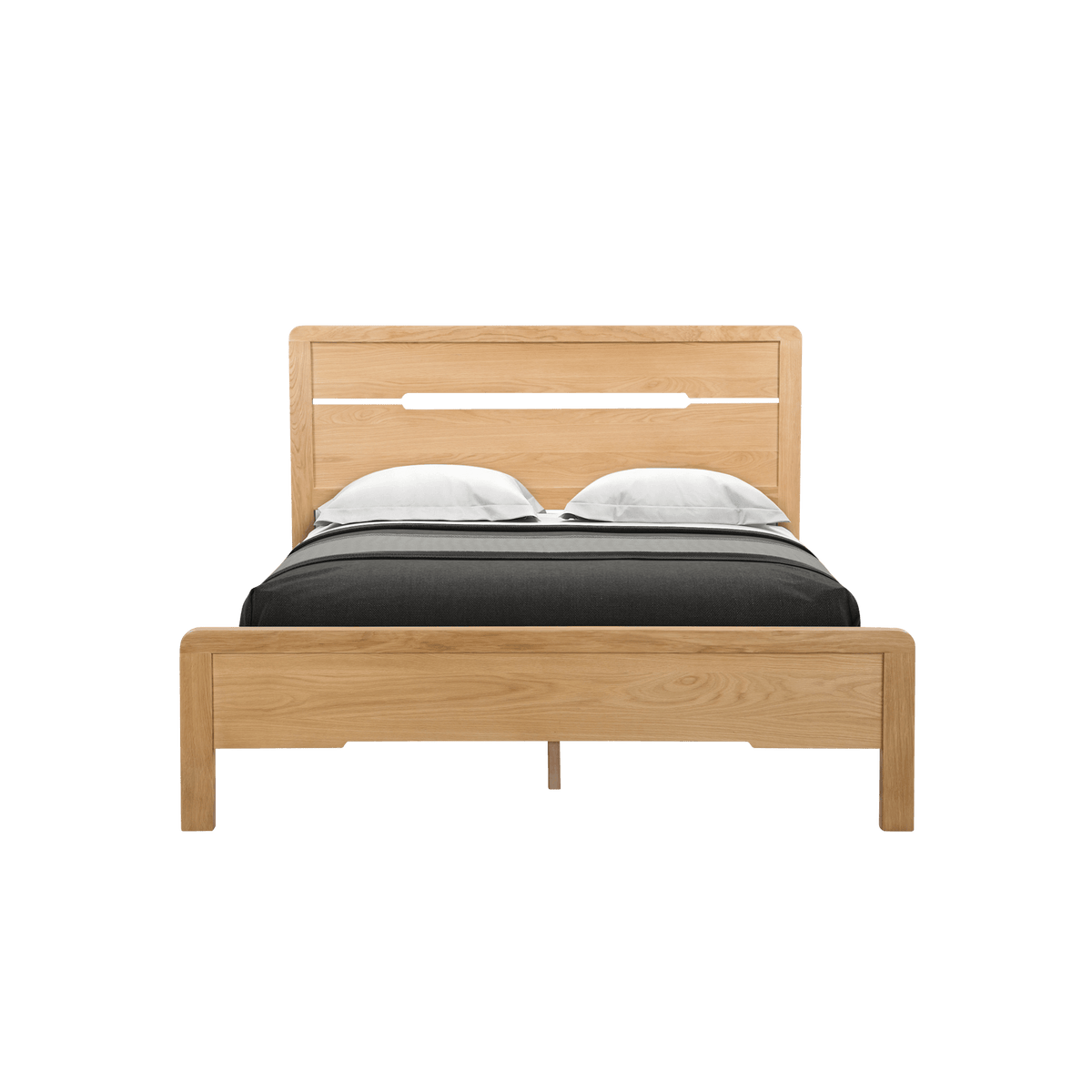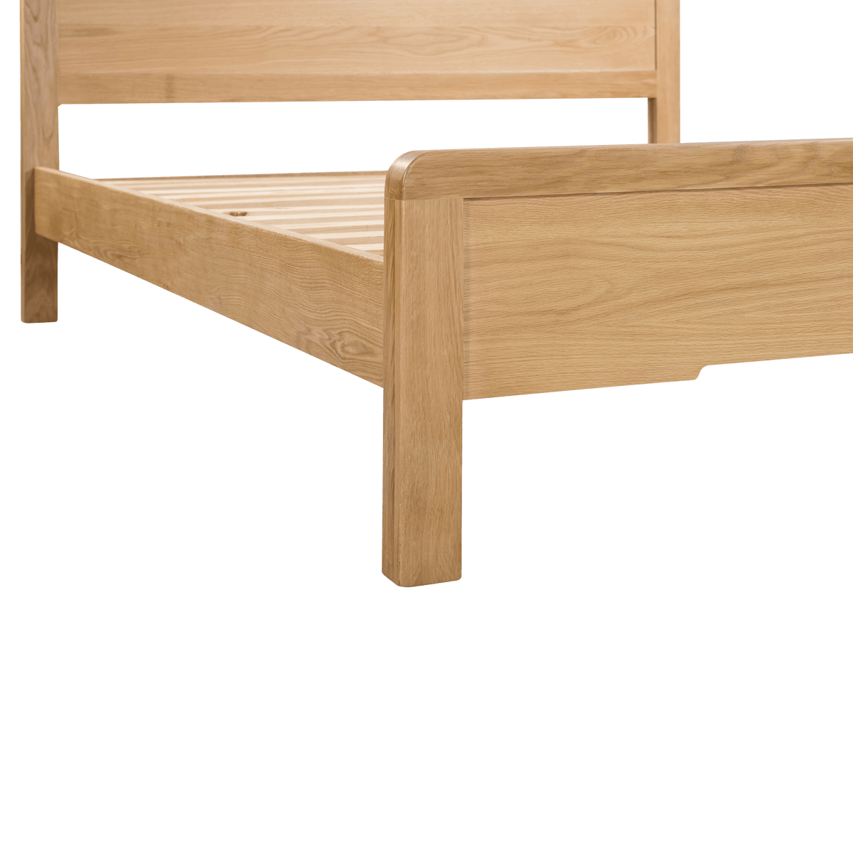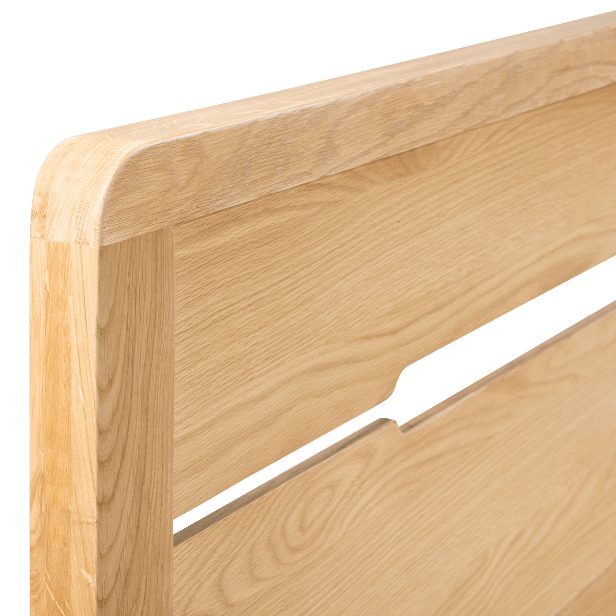 Made from solid white oak and oak veneers, it offers both strength and a warm, natural wood finish that enhances any bedroom decor. The headboard features a recessed handle design, adding a touch of sophistication and subtle detail to its clean, modern look. Its solid wooden slatted base provides reliable mattress support, ensuring both comfort and longevity.