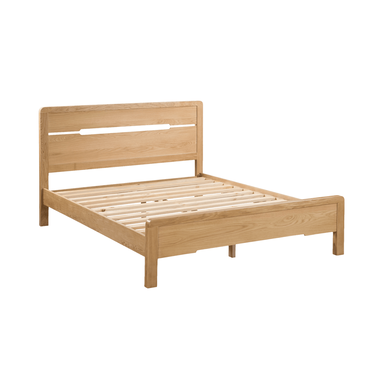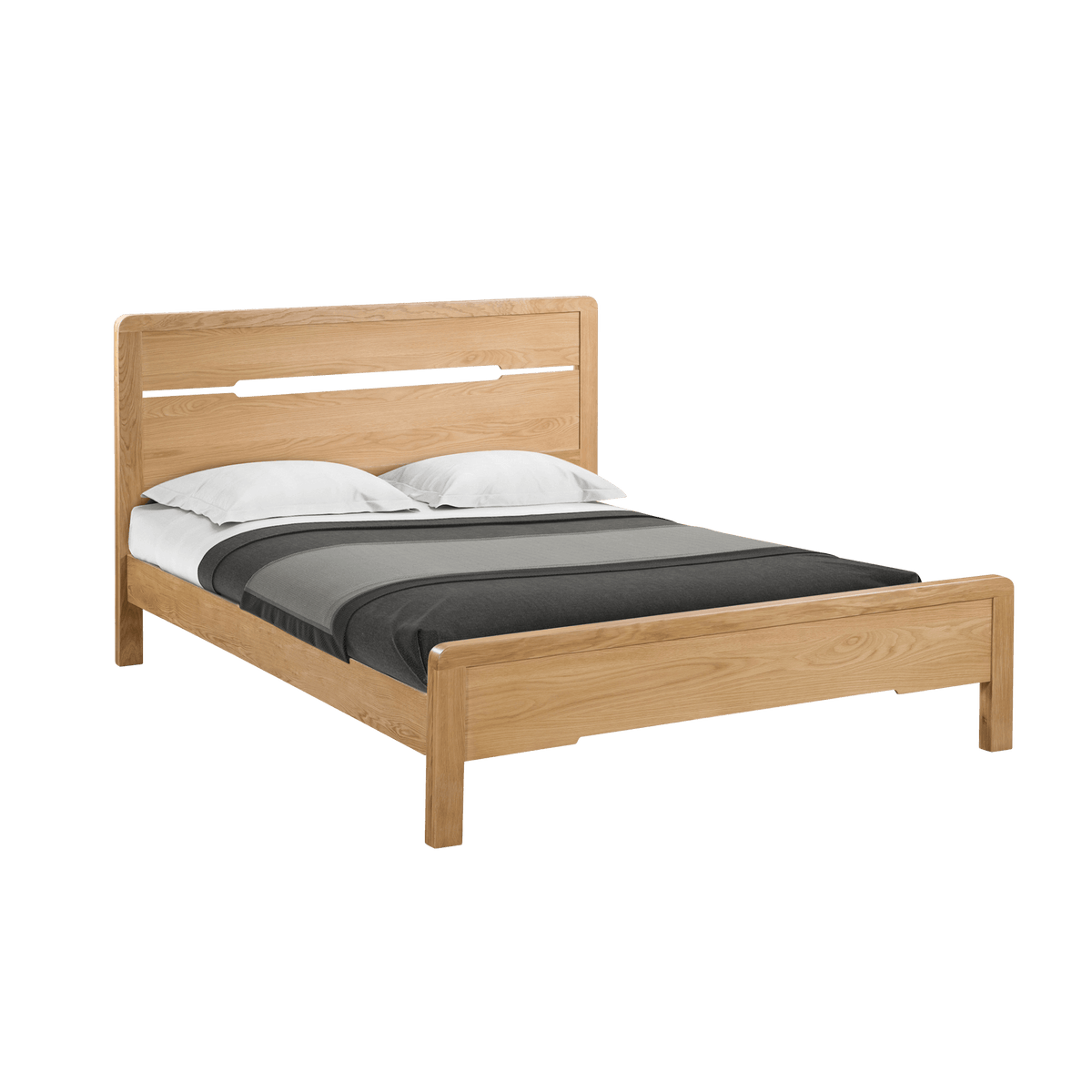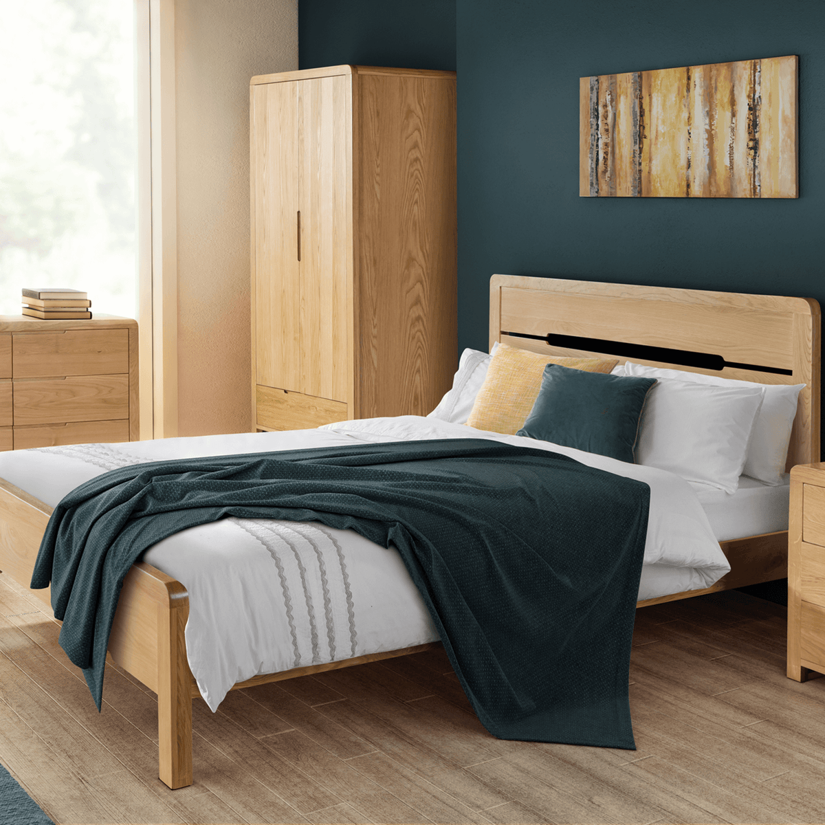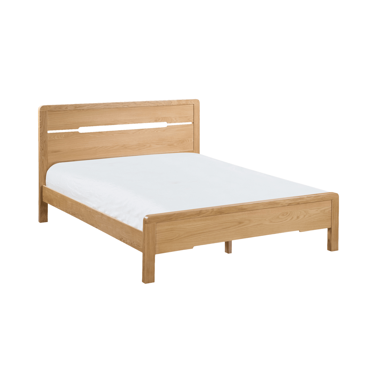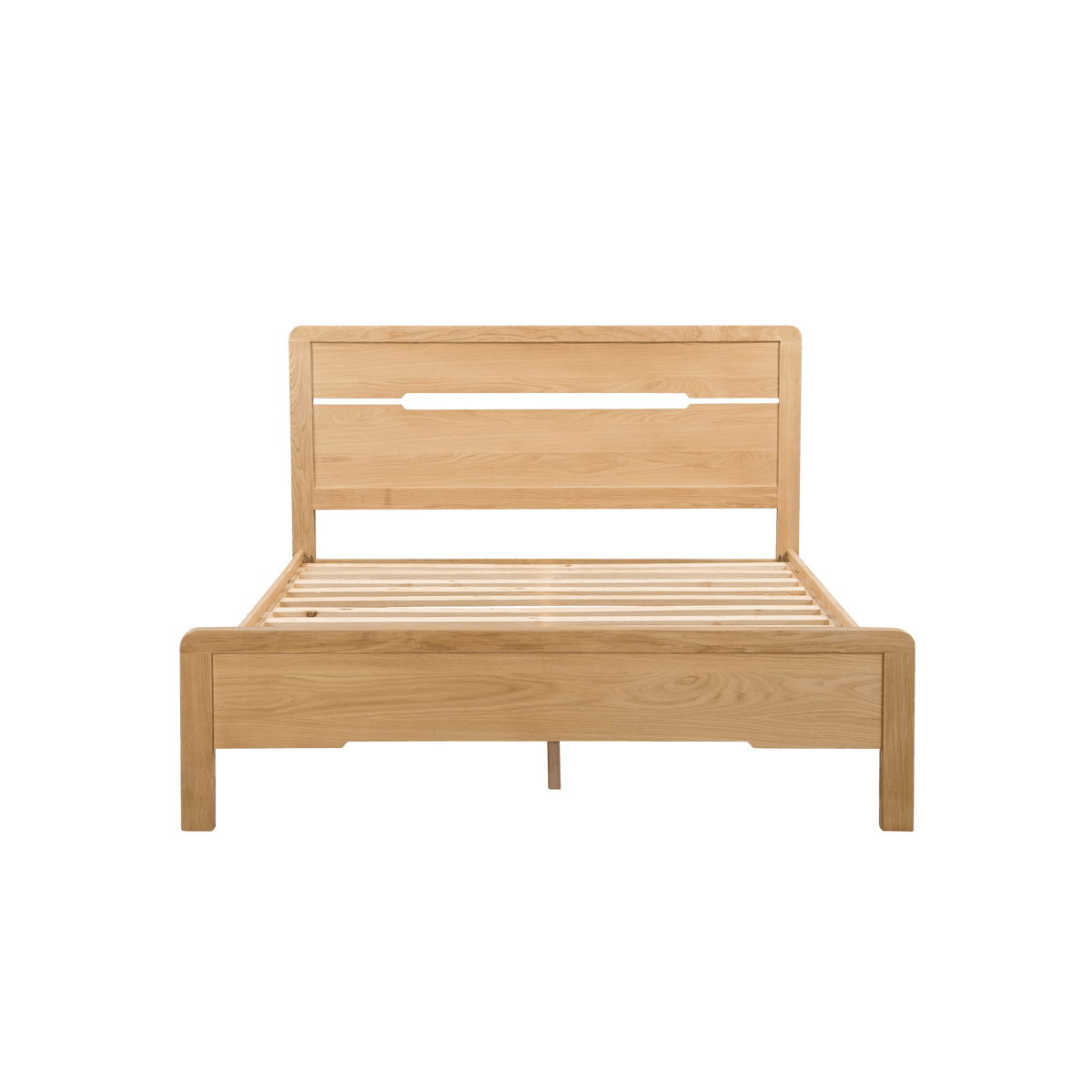 Made from solid white oak and oak veneers, it offers both strength and a warm, natural wood finish that enhances any bedroom decor. The headboard features a recessed handle design, adding a touch of sophistication and subtle detail to its clean, modern look. Its solid wooden slatted base provides reliable mattress support, ensuring both comfort and longevity.