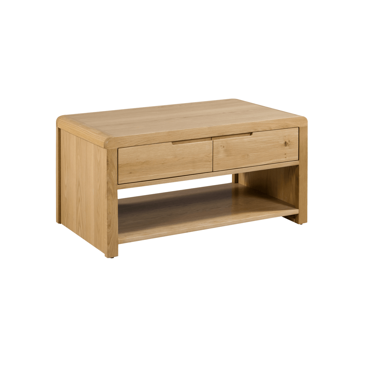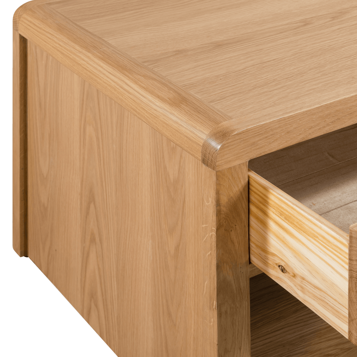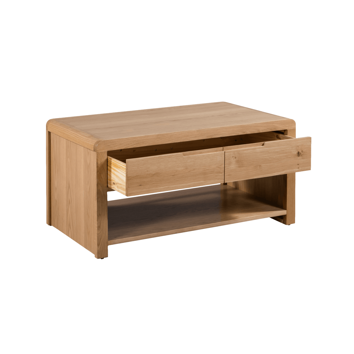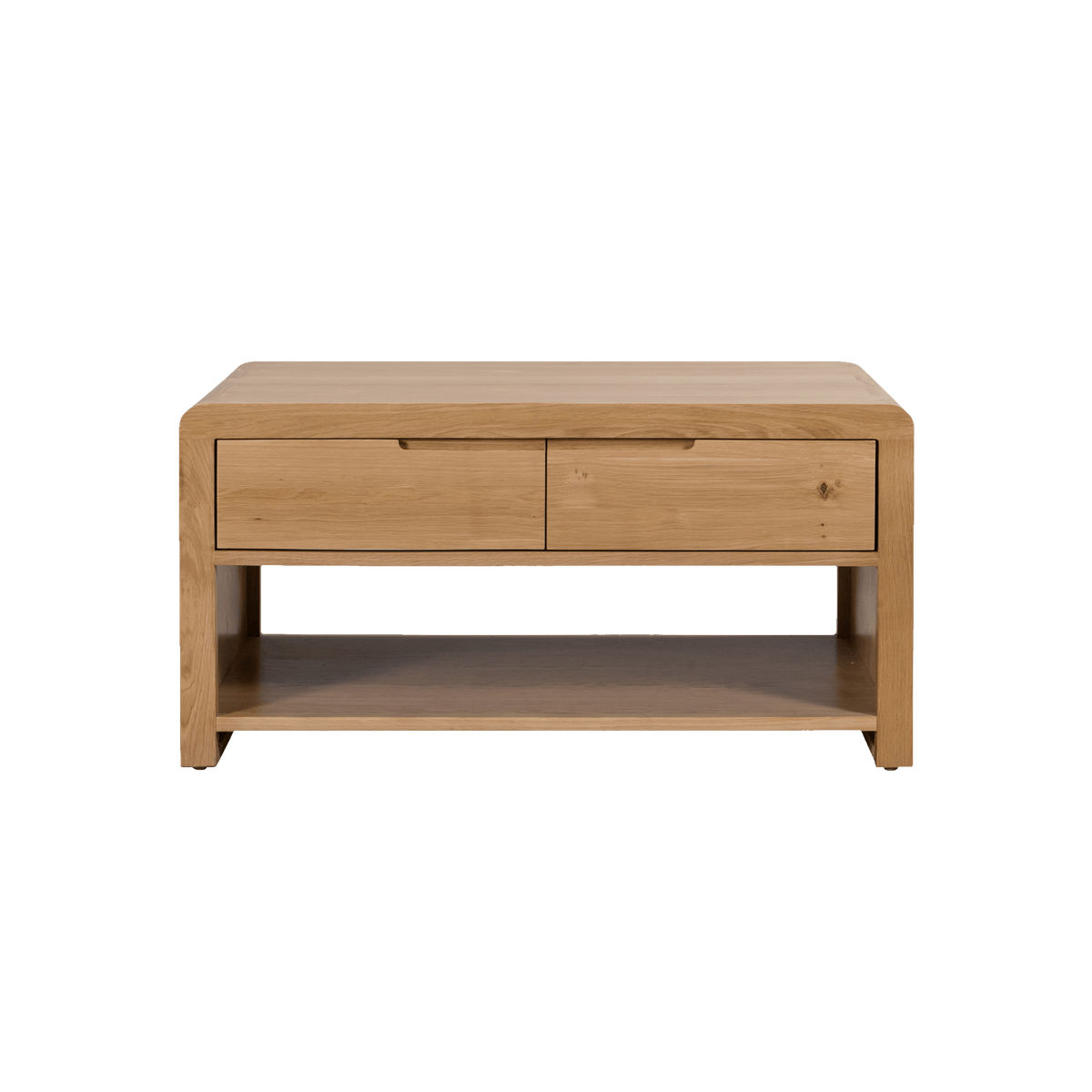 Introducing the Arizona Oak Coffee Table, a pinnacle of sophistication and craftsmanship. Crafted from solid oak and oak veneers, the Arizona combines clean lines with a gentle edging, adding a modern, retro feel to any home. The Arizona Coffee Table features one large spacious drawer, with the vision of two on the outside, along with a shelf for extra storage.