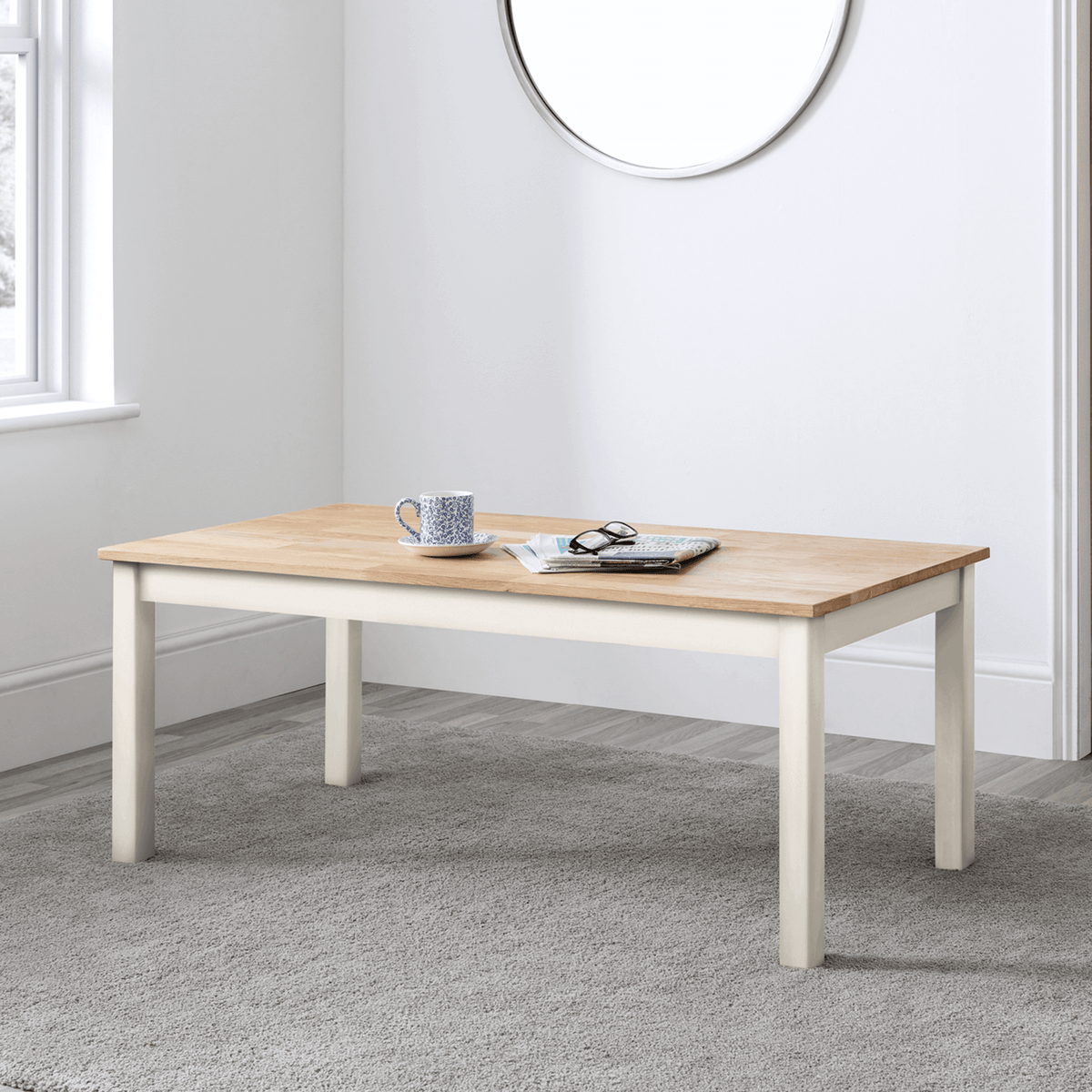 Enhance your living space with our elegant Austin coffee table, featuring a natural oak top and sturdy ivory-painted legs. Available in two distinct finishes: Oak and Ivory & Oak, this table blends style and functionality seamlessly. Perfect for any modern or traditional décor, it offers ample space for your coffee, books, and décor items.