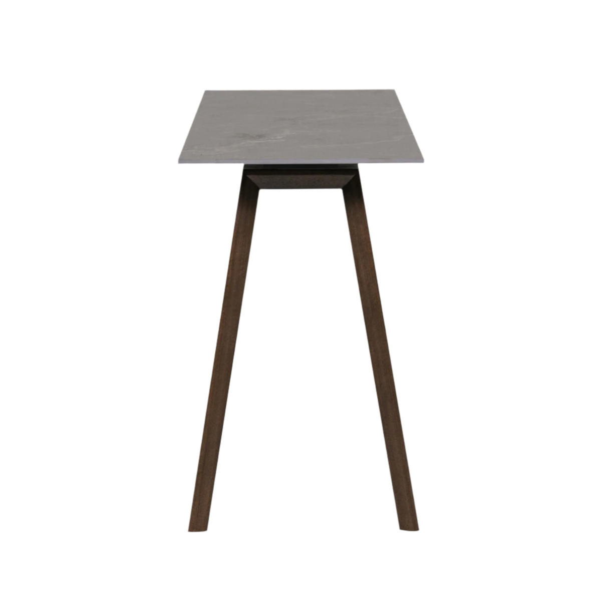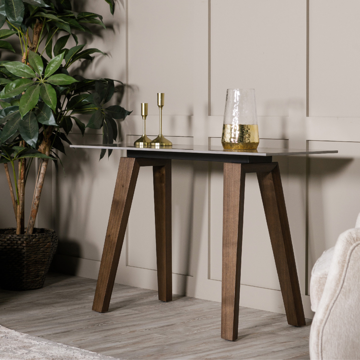The Axton Console Table in Latte combines elegance with practicality. Crafted from bird wood with a dark brown walnut veneer, it exudes natural charm. Its sintered stone tabletop is heat and cold-resistant, waterproof, scratch-resistant, and stain-proof, making it easy to maintain and clean.