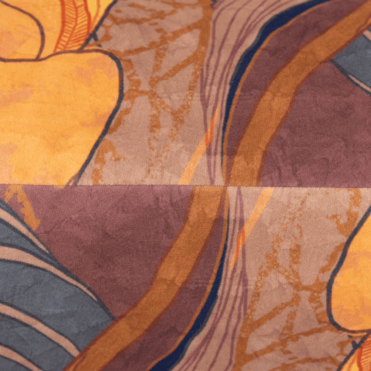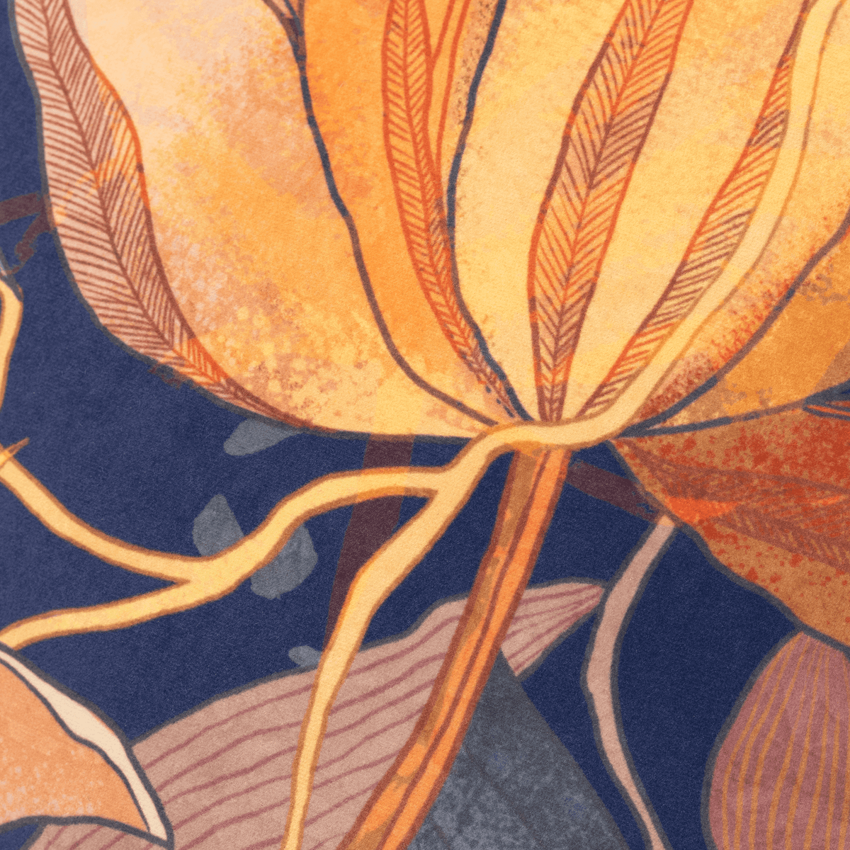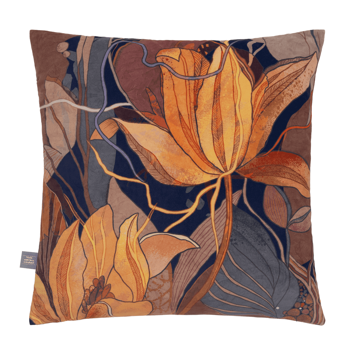 Printed with a verdant botanical design, the Azalea cushion is a maximalist moment. Saturated tones of amber are punched up with a warm palette of navy and bronze. Featuring a knife edge finish on a velvet fabric, this cushion will add a luxurious pop of colour to your living space.