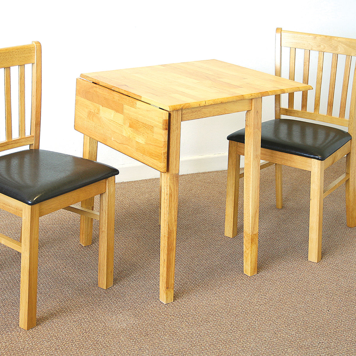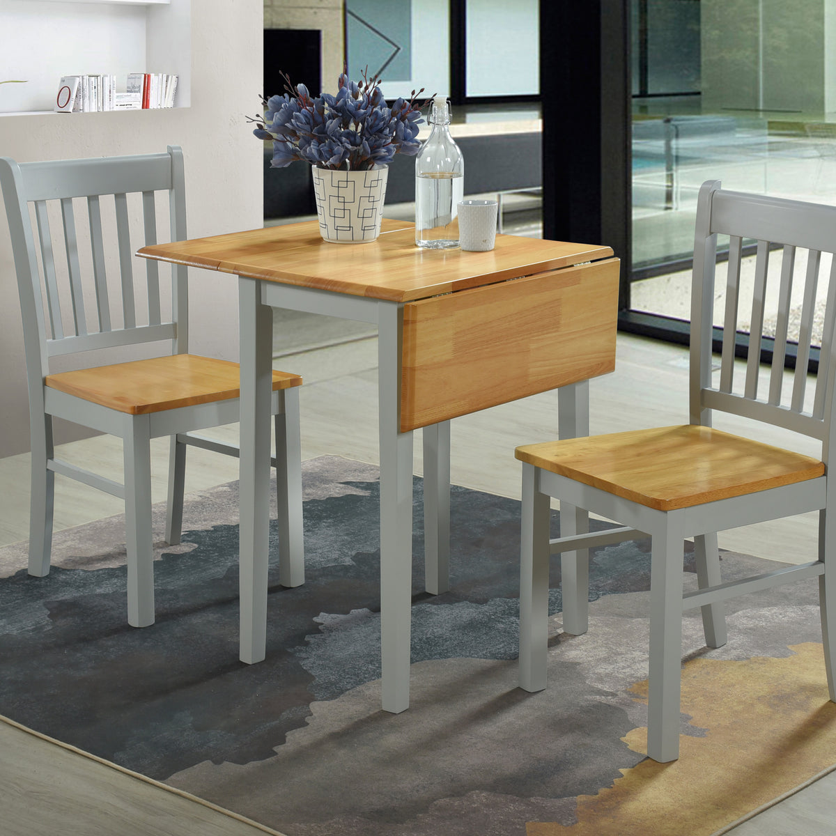 This space-saving dining set features a square, drop-leaf table and two chairs. The table's innovative design allows it to be expanded when needed, making it ideal for small spaces or when hosting guests. The chairs feature a classic slatted back design. The set's finish provides a warm and inviting atmosphere, making it a suitable addition to various home decor styles.