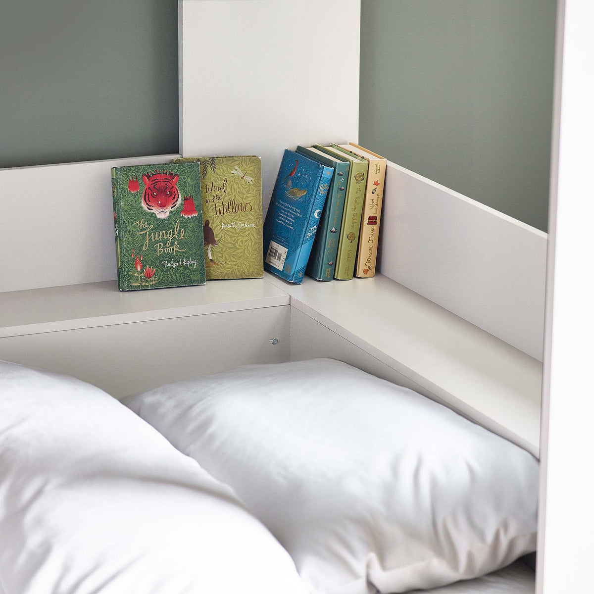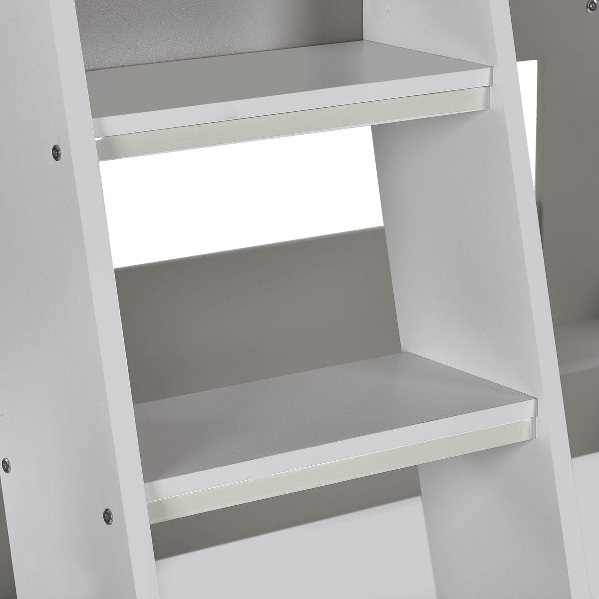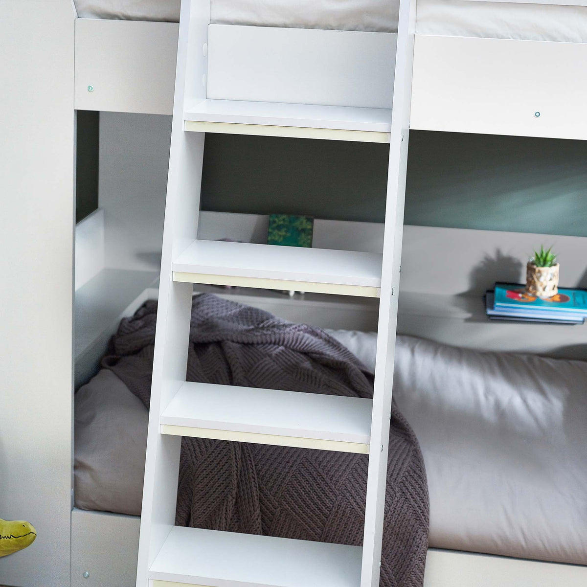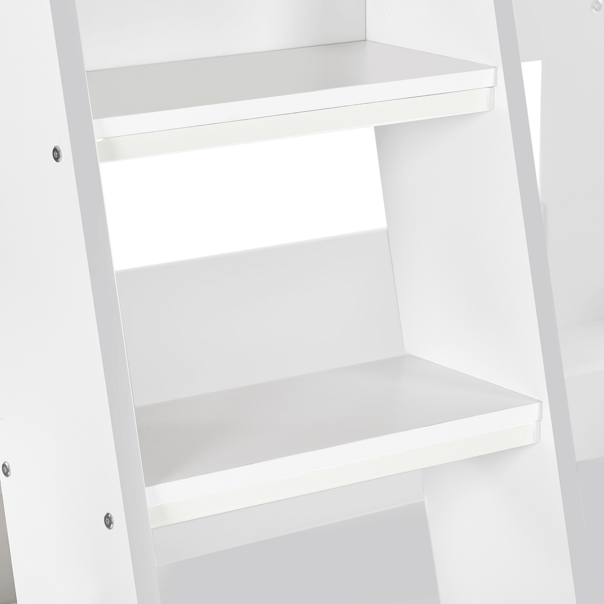 This bunk bed includes built-in shelving, offering a convenient space for storing books, toys, and other bedtime essentials within easy reach. The robust, angled ladder not only ensures safe access to the top bunk but also features glow-in-the-dark steps for added visibility and a touch of playful charm.