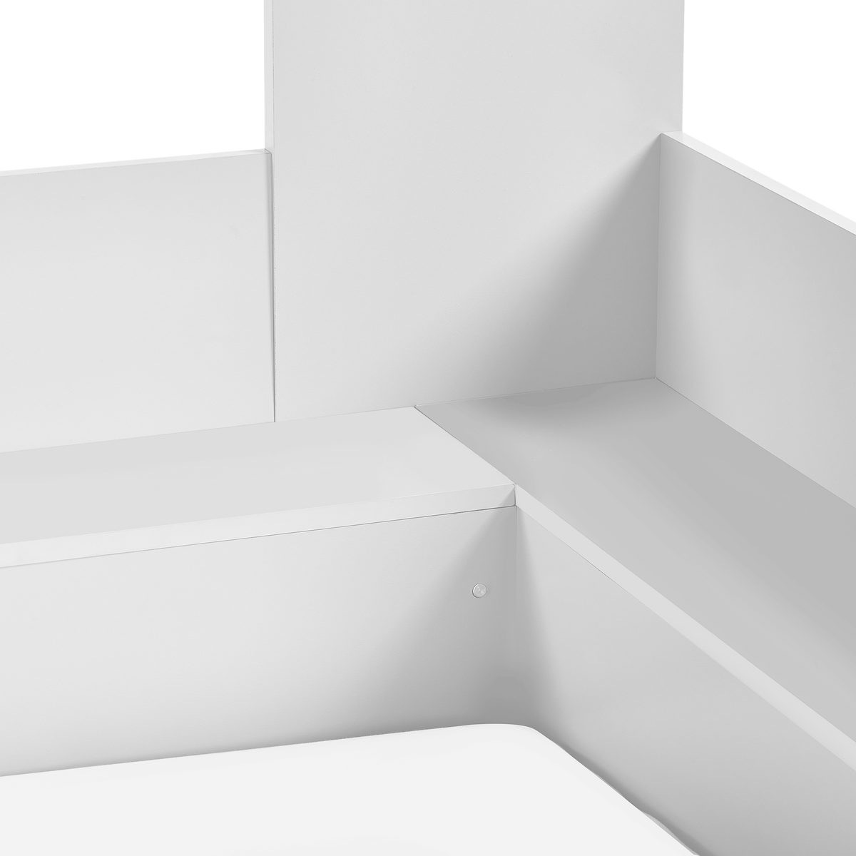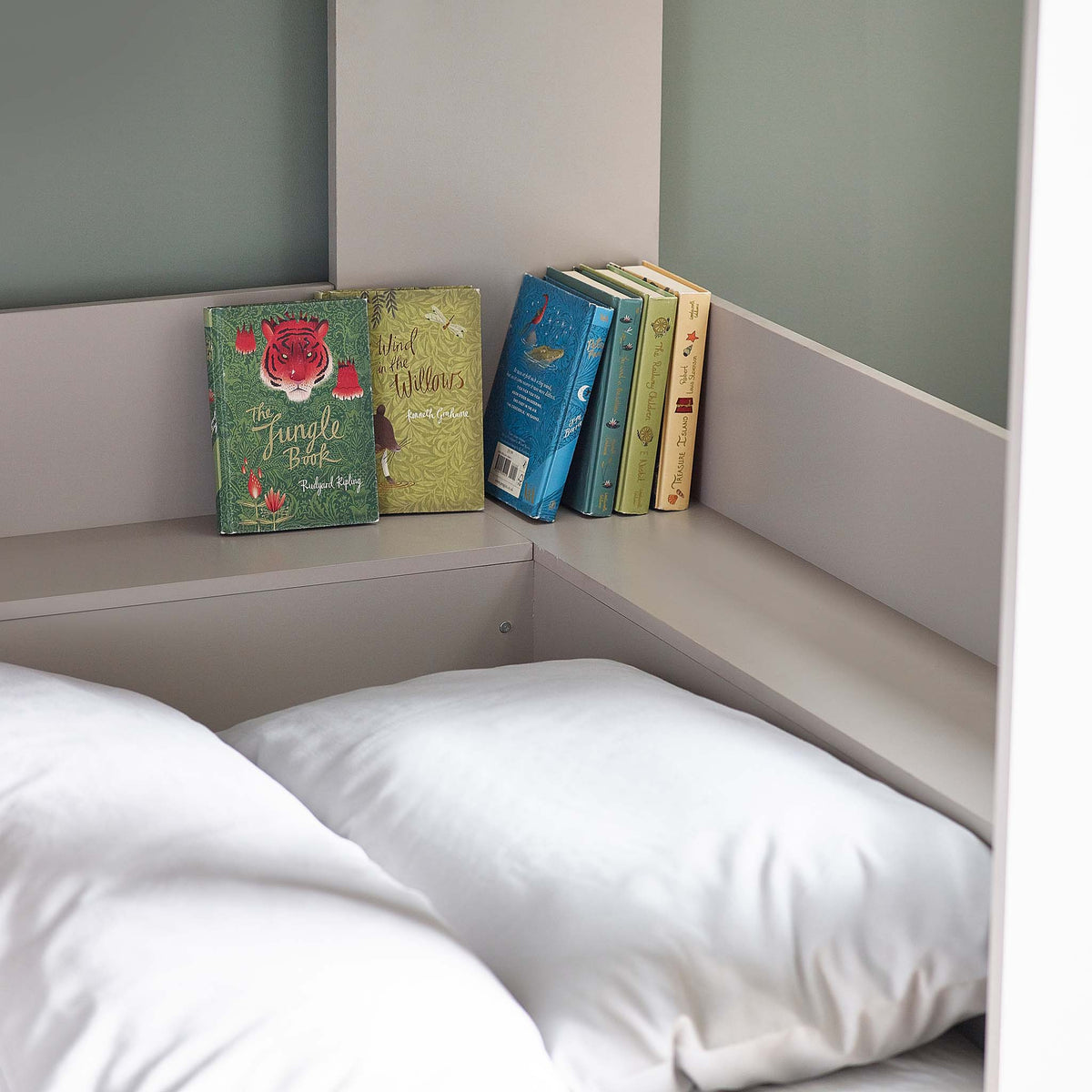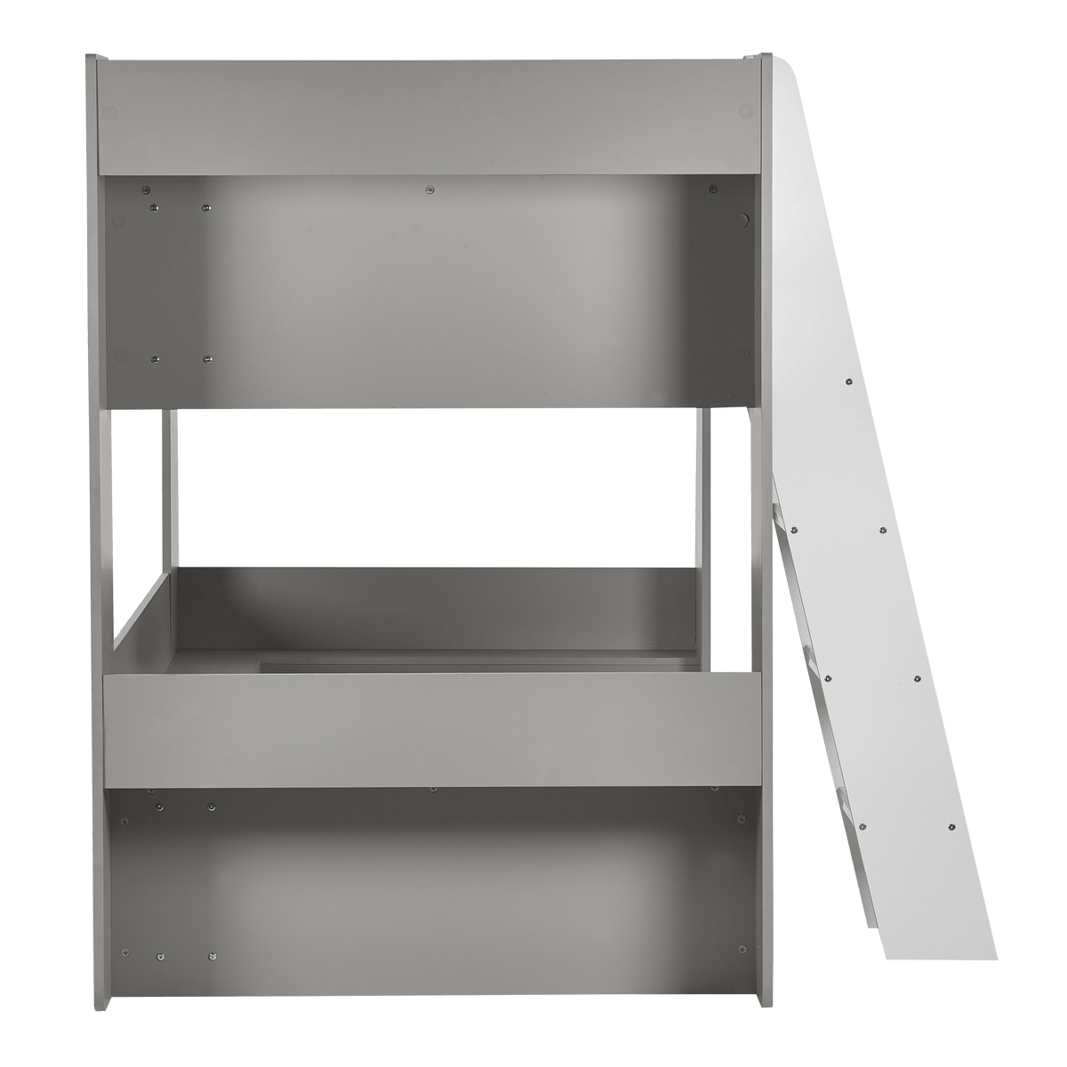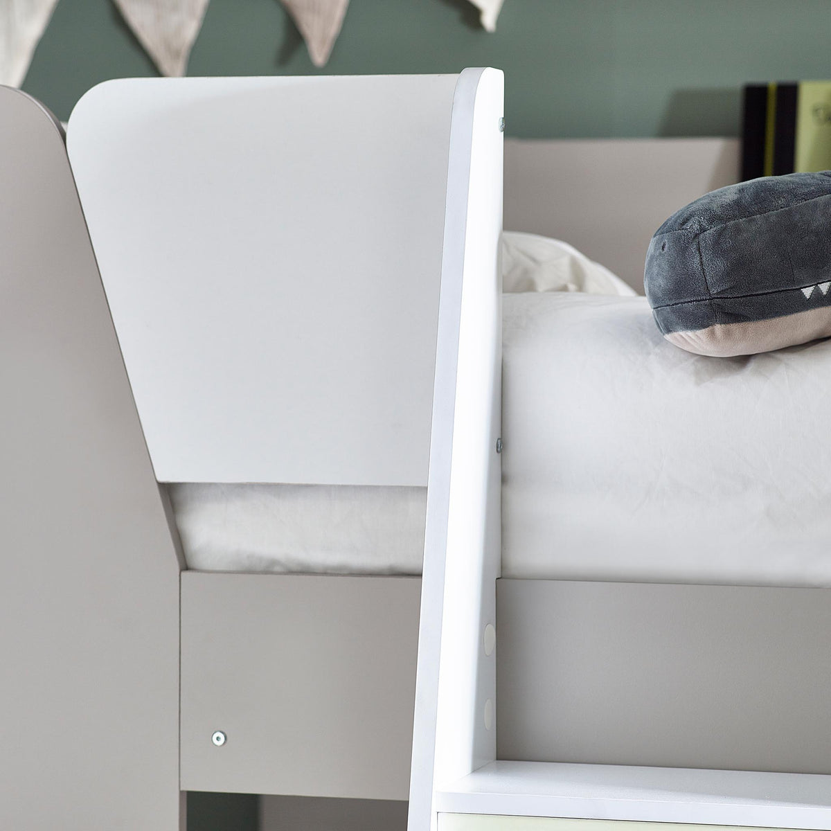 This bunk bed includes built-in shelving, offering a convenient space for storing books, toys, and other bedtime essentials within easy reach. The robust, angled ladder not only ensures safe access to the top bunk but also features glow-in-the-dark steps for added visibility and a touch of playful charm.