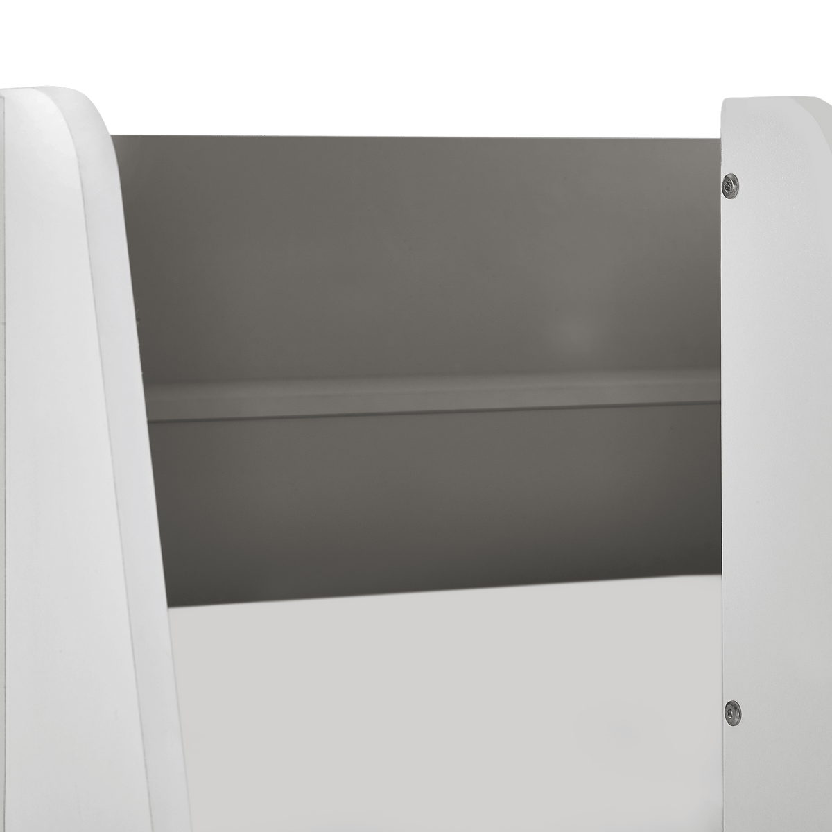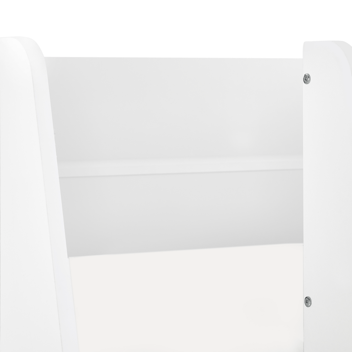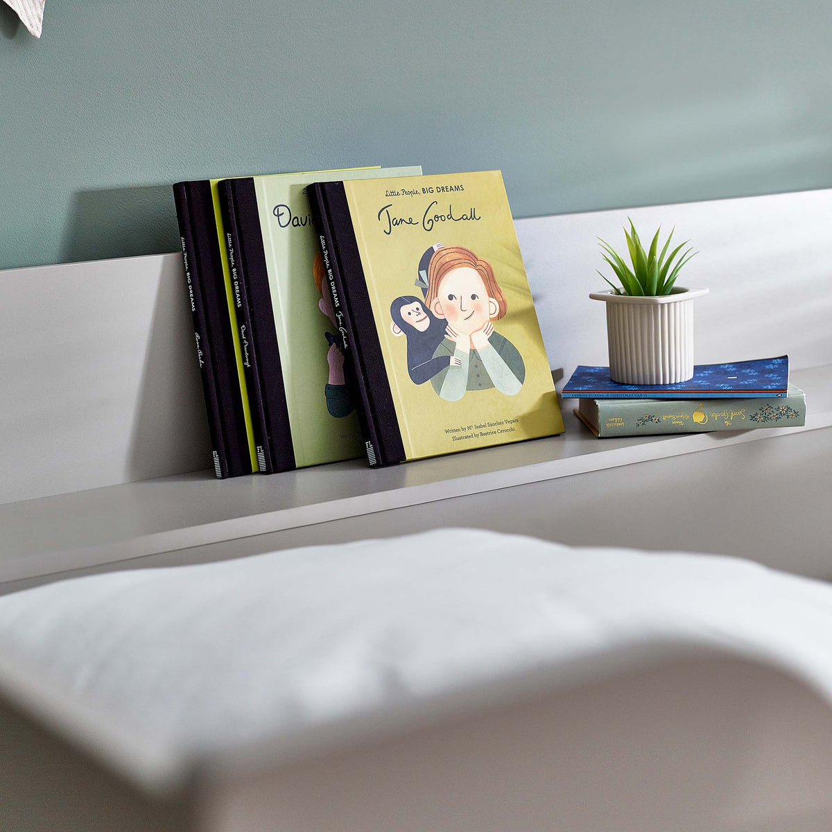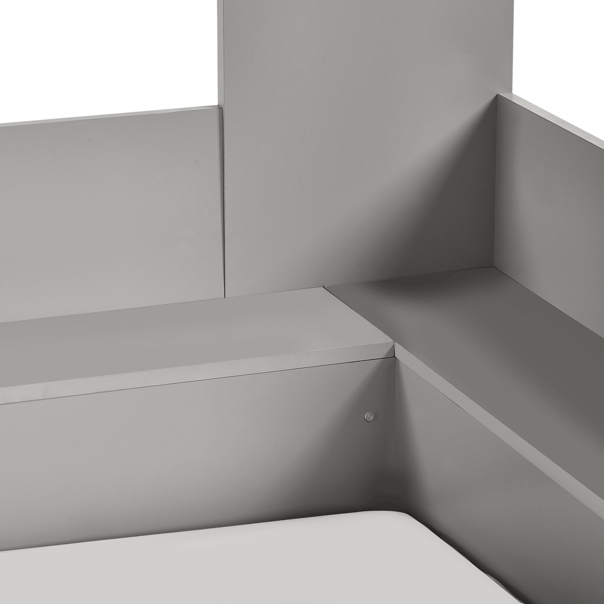 This bunk bed includes built-in shelving, offering a convenient space for storing books, toys, and other bedtime essentials within easy reach. The robust, angled ladder not only ensures safe access to the top bunk but also features glow-in-the-dark steps for added visibility and a touch of playful charm.