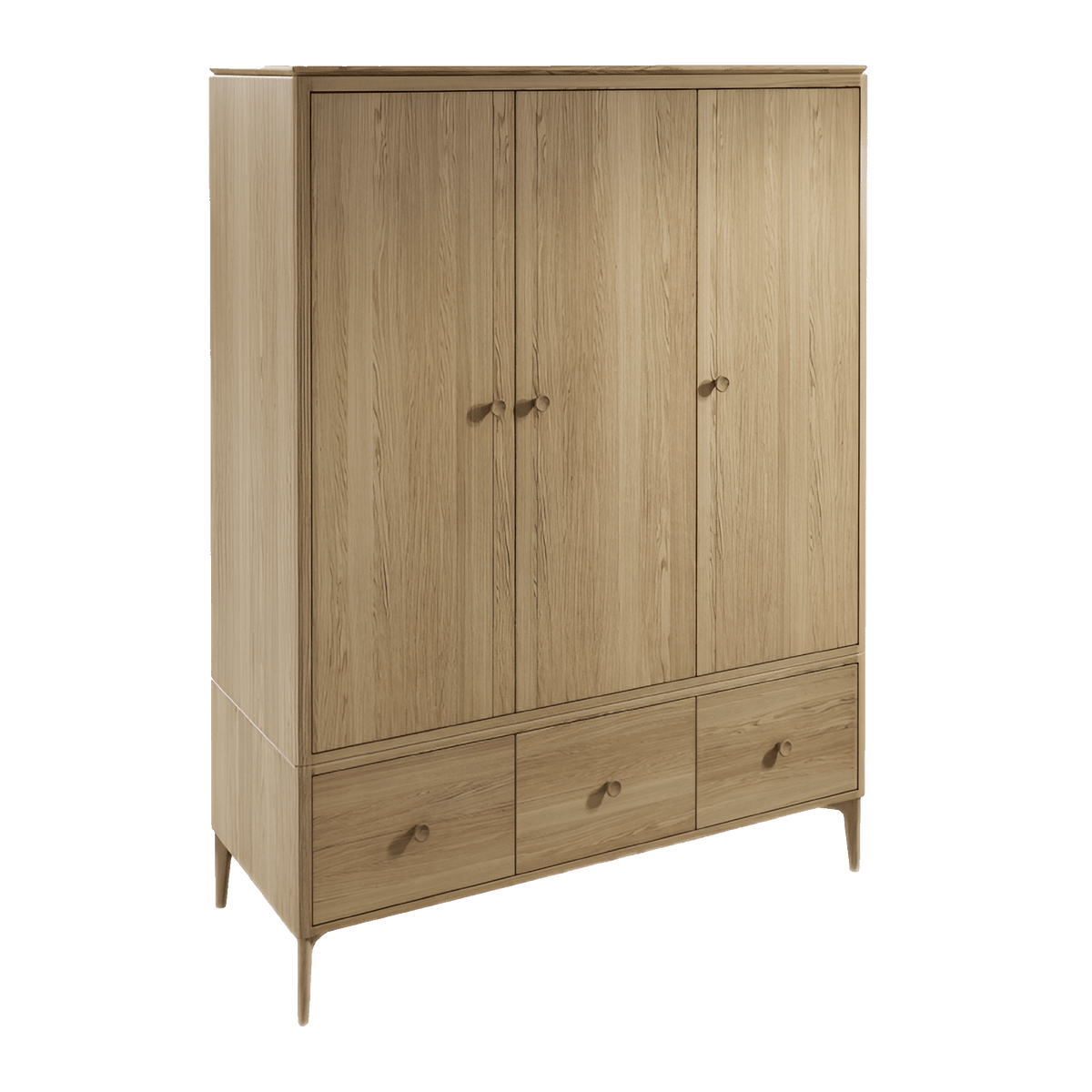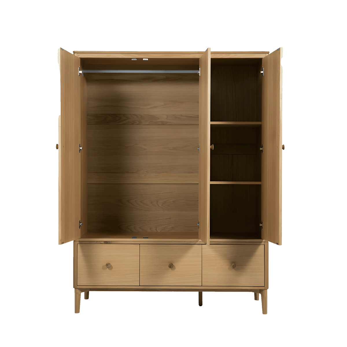 The Barnet 3 Door Wardrobe in Natural finish combines sleek contemporary design with functional storage. Crafted with a minimalist aesthetic, this wardrobe features clean lines and a smooth, natural wood grain that brings warmth and style to any modern bedroom. Its solid wooden legs elevate the piece, adding stability and a touch of sophistication.