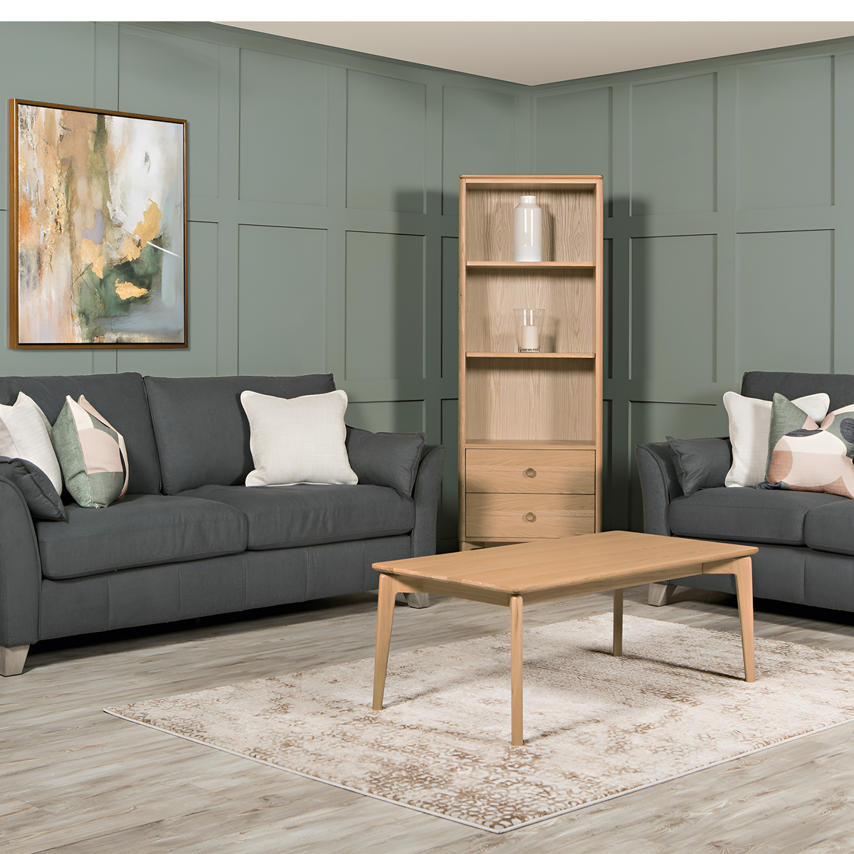 The Barnet Coffee Table is a stylish statement piece, designed to complement any interior decor. Crafted from beautiful Oak and Oak Veneer, this Scandi-inspired piece has curved edges for an elegant finish. The coffee table will become the focal point of your living space and its versatile design allows it to be used with any type of furnishing Whether you're looking for a minimalistic style or more of a classic look, the Barnet Coffee Table will provide the perfect addition to your home decor.