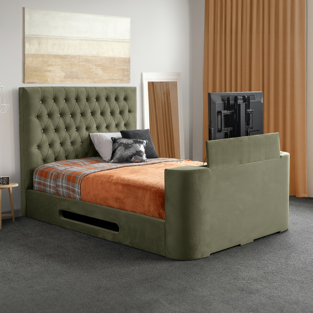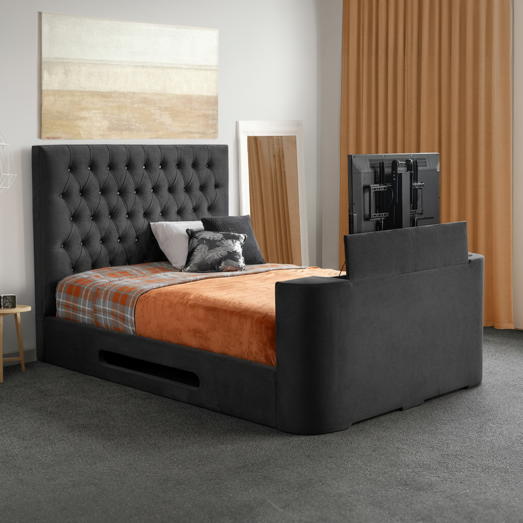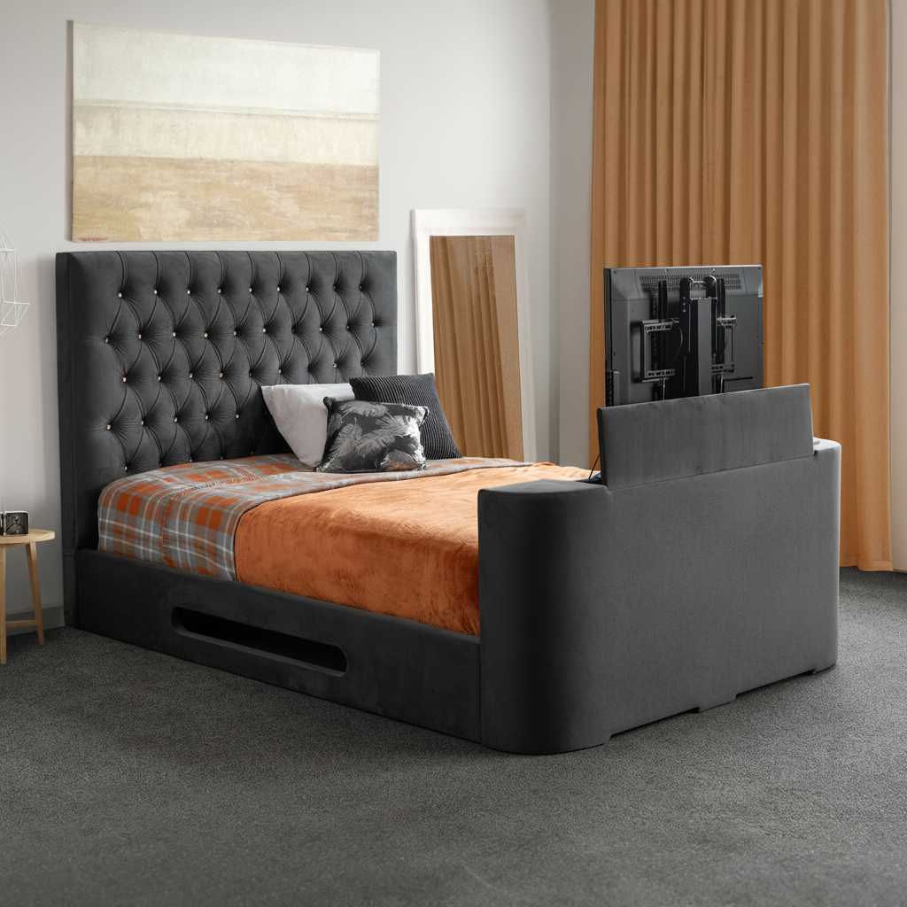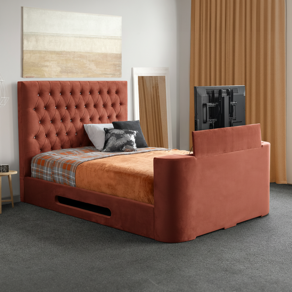 The Bethany Tv Bedframe seamlessly integrates entertainment into your bedroom with a built-in television mount accommodating screens up to 40 inches. Engineered with a compact 8 cm depth design, it maximizes space efficiency without compromising functionality. Choose from three frame sizes to suit your room dimensions, and select from 20 colour options to match your interior aesthetic. The sturdy construction provides reliable support for both sleeping and viewing comfort. Television not included.