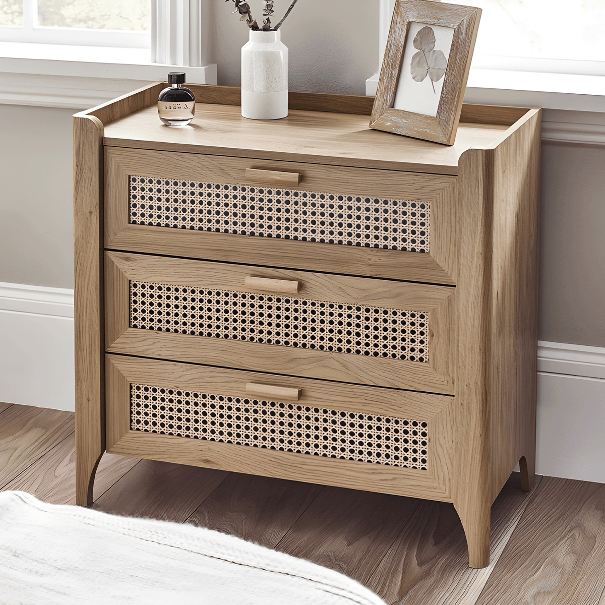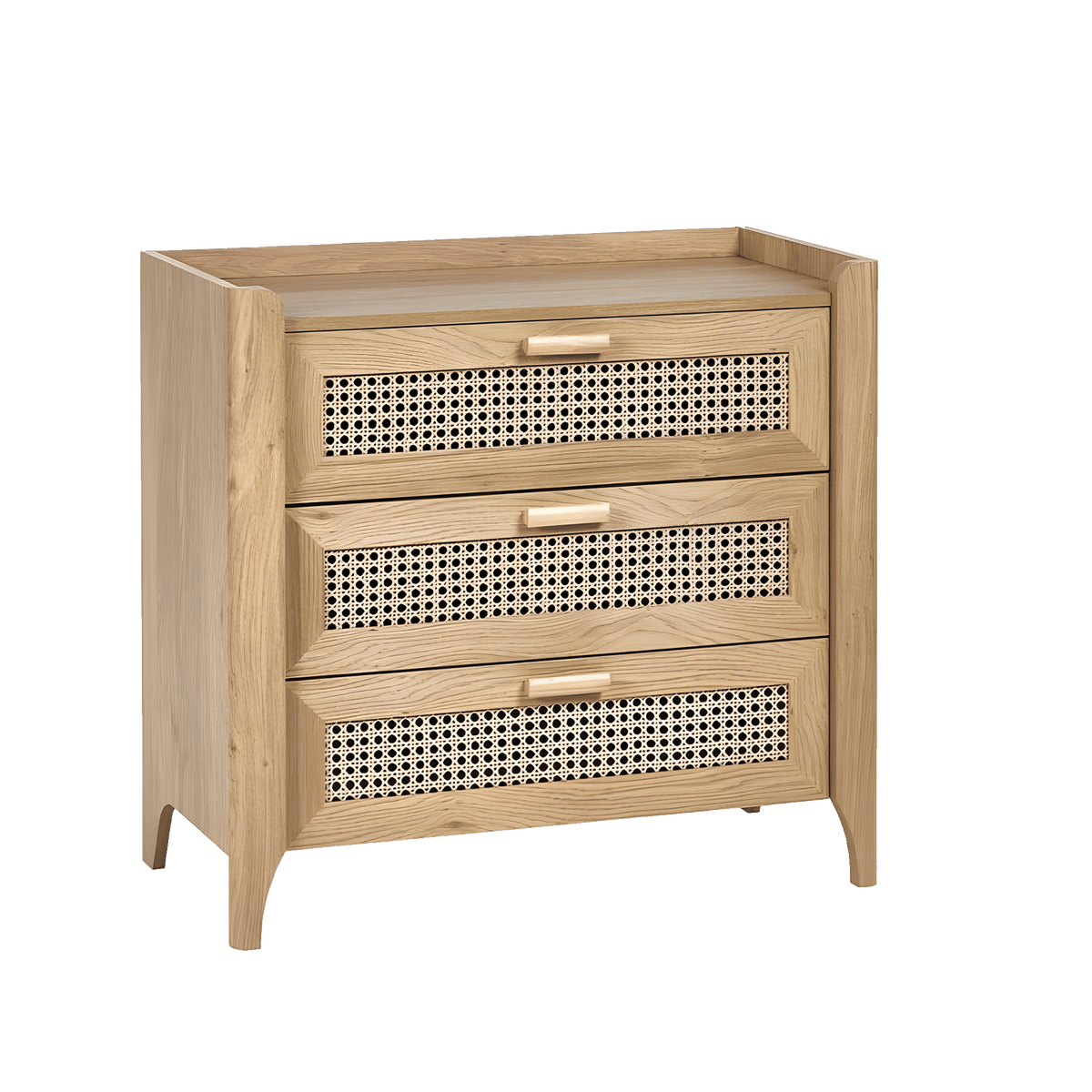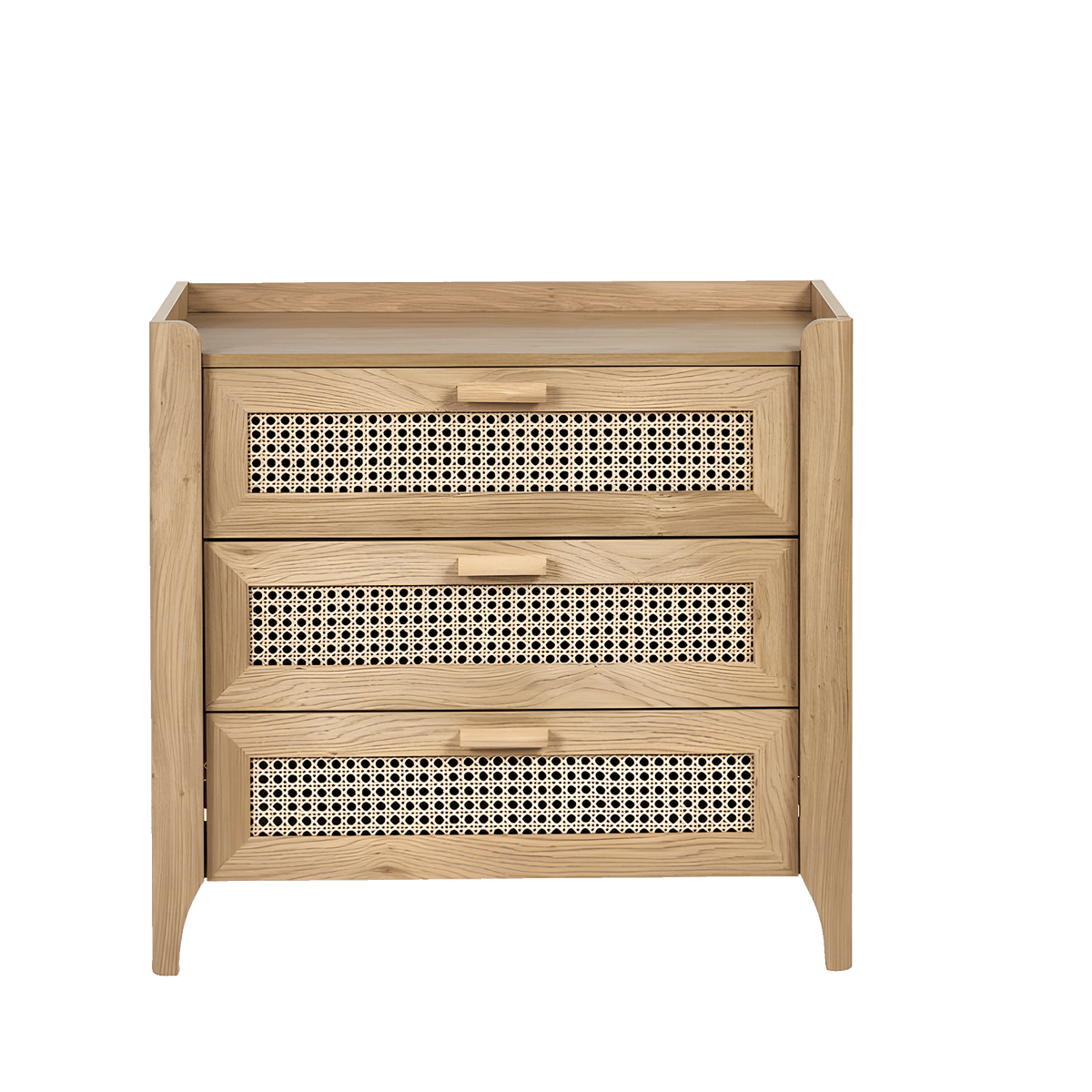 This beautifully crafted chest combines sleek, modern lines with a natural rattan-styled front, offering a refined yet earthy aesthetic. Each of the three drawers provides ample storage, making it both stylish and functional.