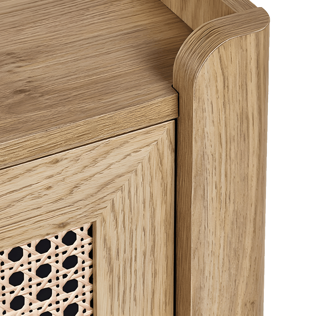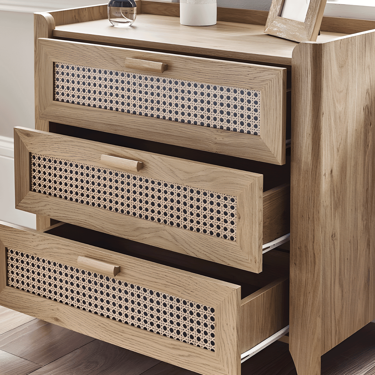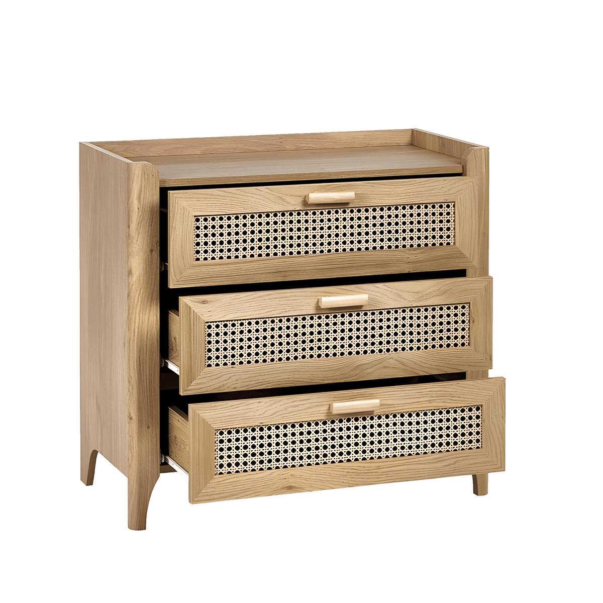 This beautifully crafted chest combines sleek, modern lines with a natural rattan-styled front, offering a refined yet earthy aesthetic. Each of the three drawers provides ample storage, making it both stylish and functional.