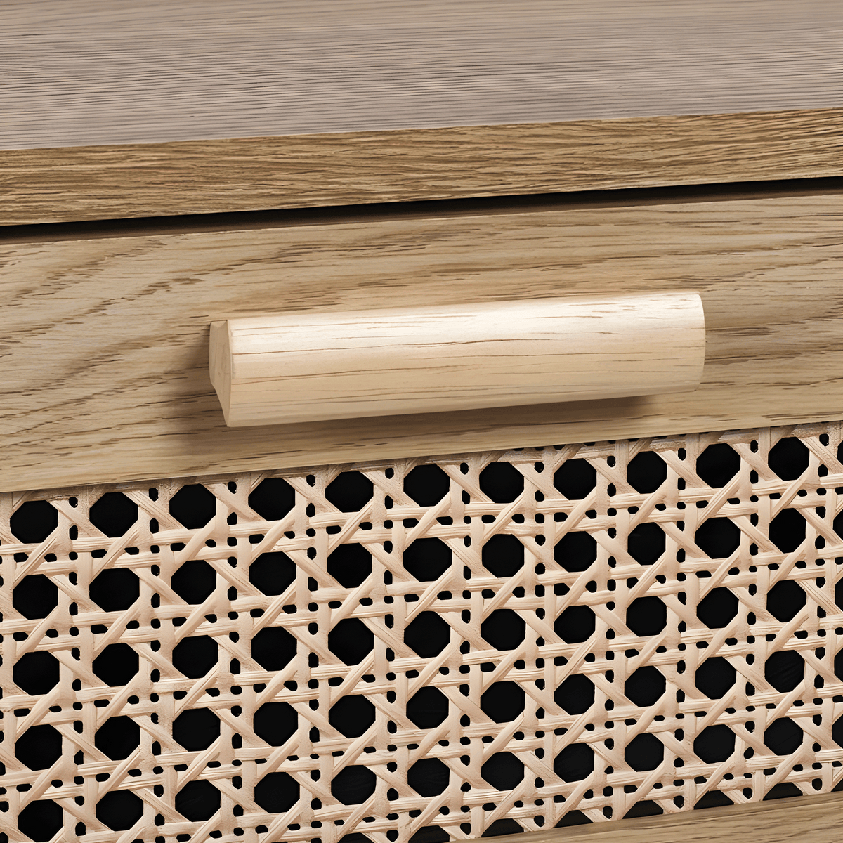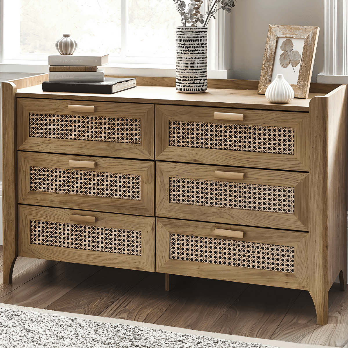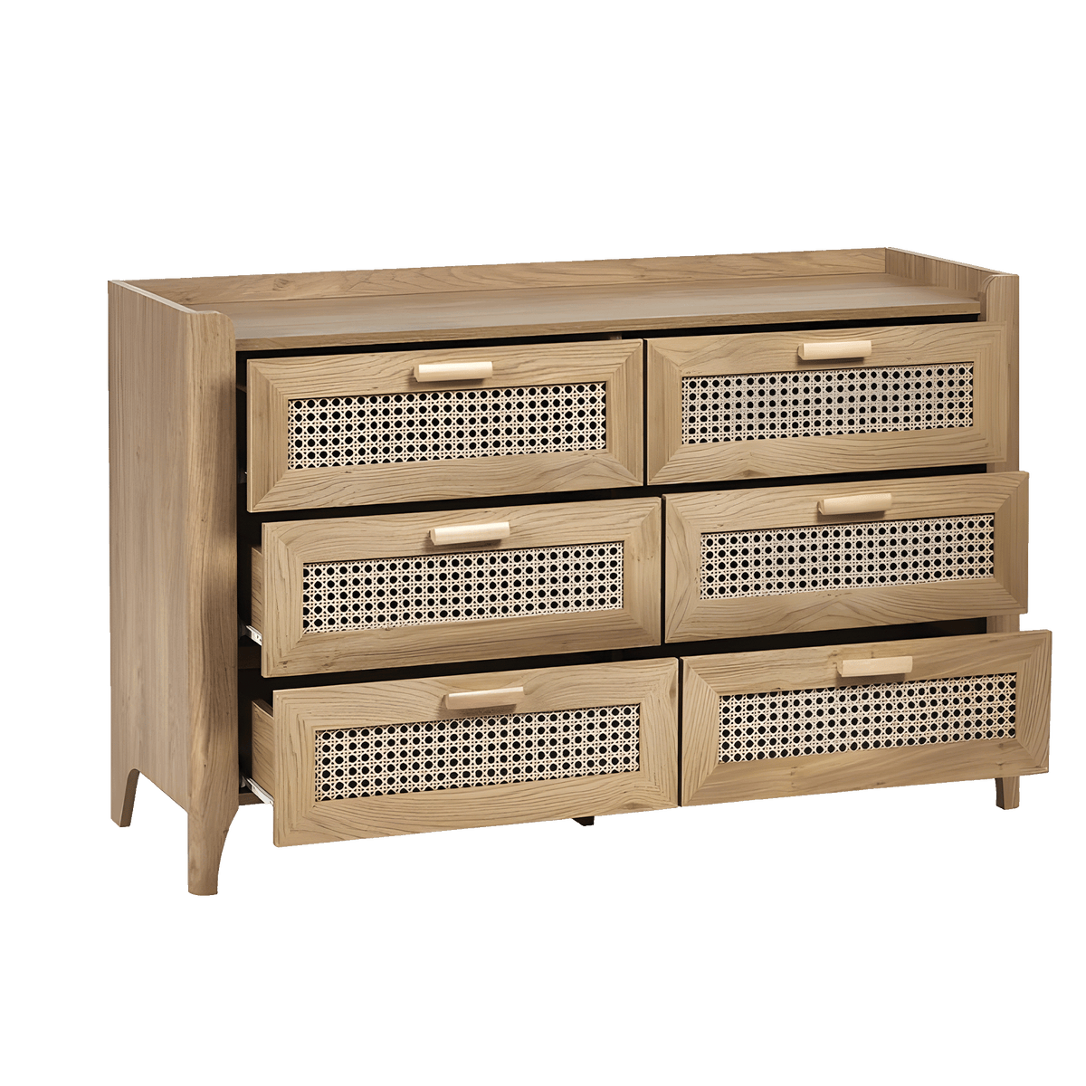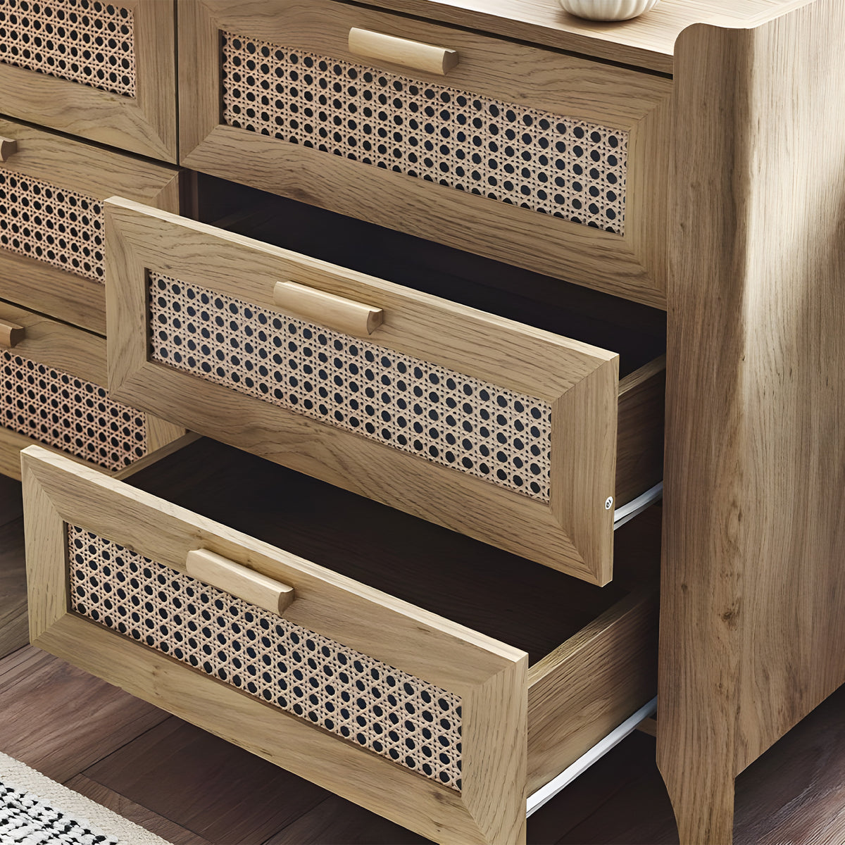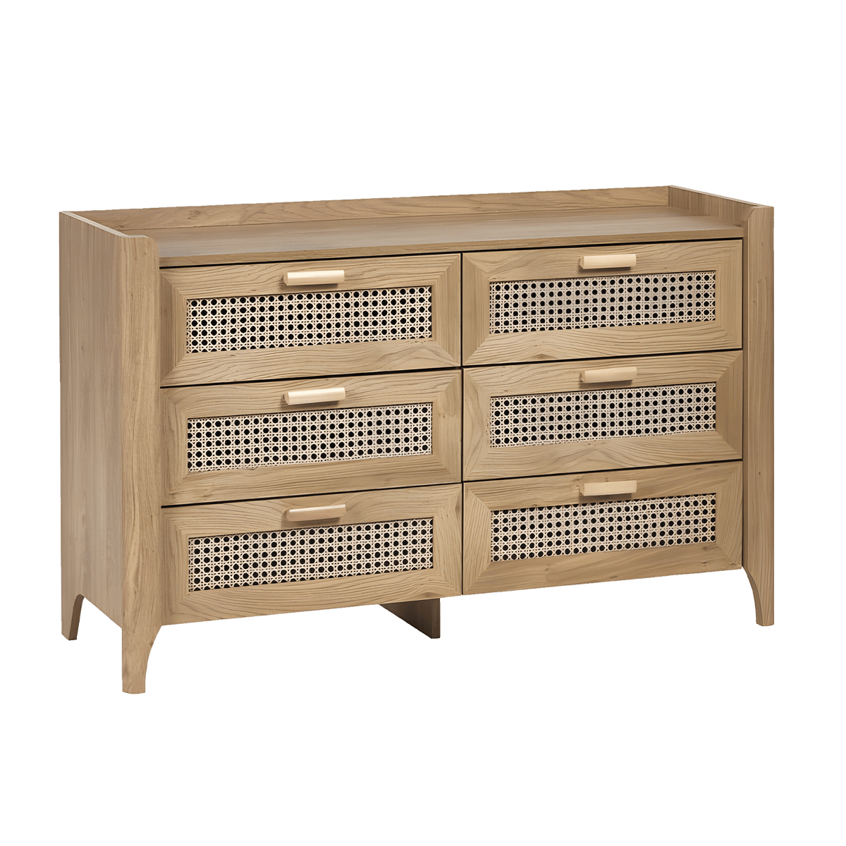 This beautifully crafted chest combines sleek, modern lines with a natural rattan-styled front, offering a refined yet earthy aesthetic. Each of the six drawers provides ample storage, making it both stylish and functional.