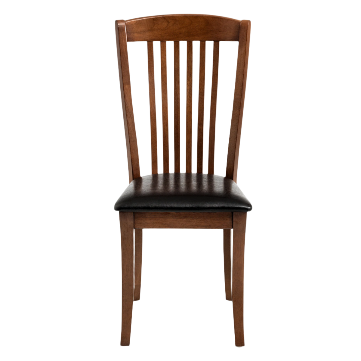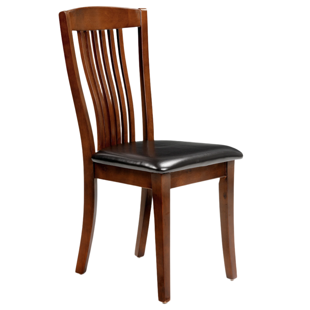 A traditional styled dining chair in a beautiful mahogany finish with a comfortable brown faux leather, padded seat. With a shaped back to adding extra comfort for your posture.