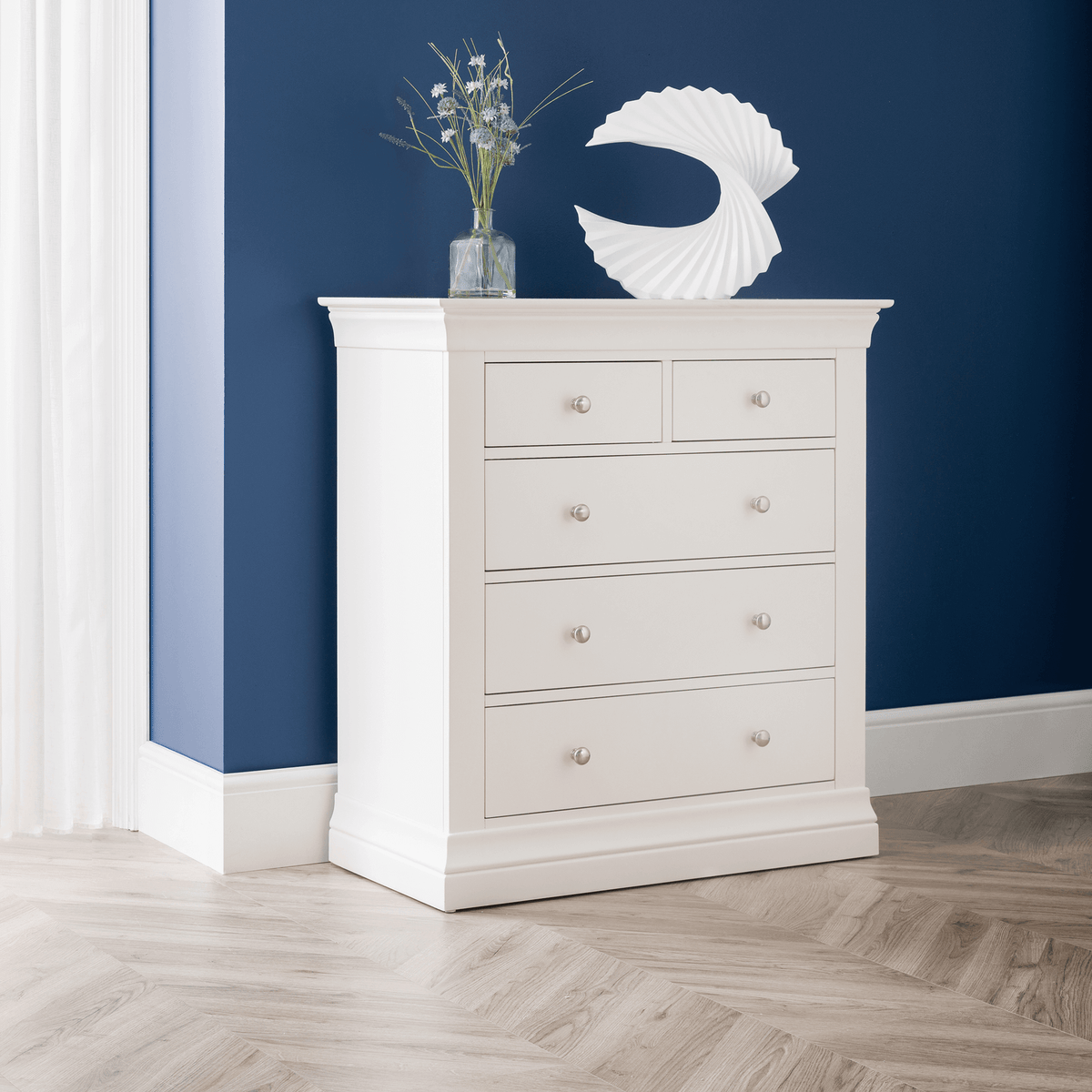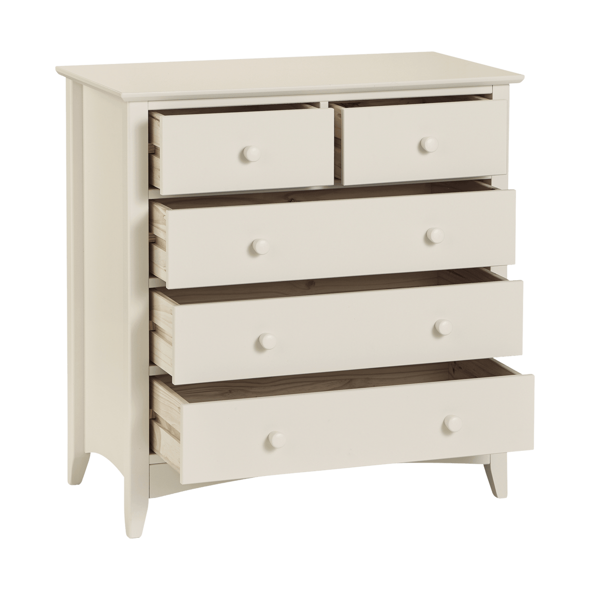 The Carmel 3+2 Chest is a luxurious choice for discerning homeowners. Its timeless shaker design is the perfect accompaniment to any interior style and is perfect for grown-up bedrooms and children's bedrooms alike. Solid pine frames ensure a sturdy and durable construction. The Carmel 3+2 chest offers a great storage solution with 2 small drawers and 3 large drawers. Available in a stylish nan finish, this Chest Of Drawers seamlessly blends beauty and utility.