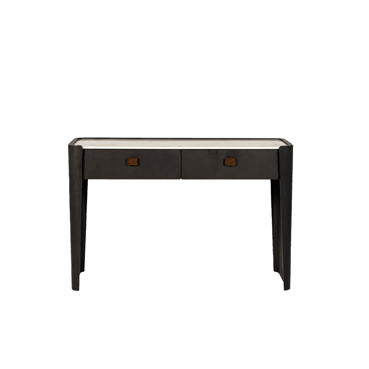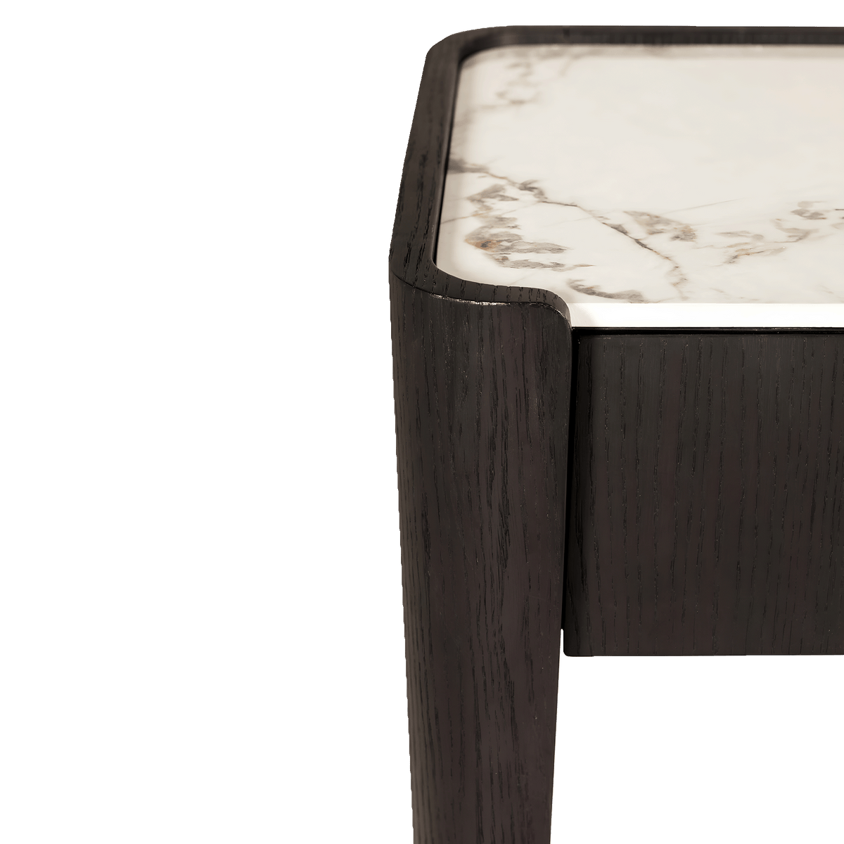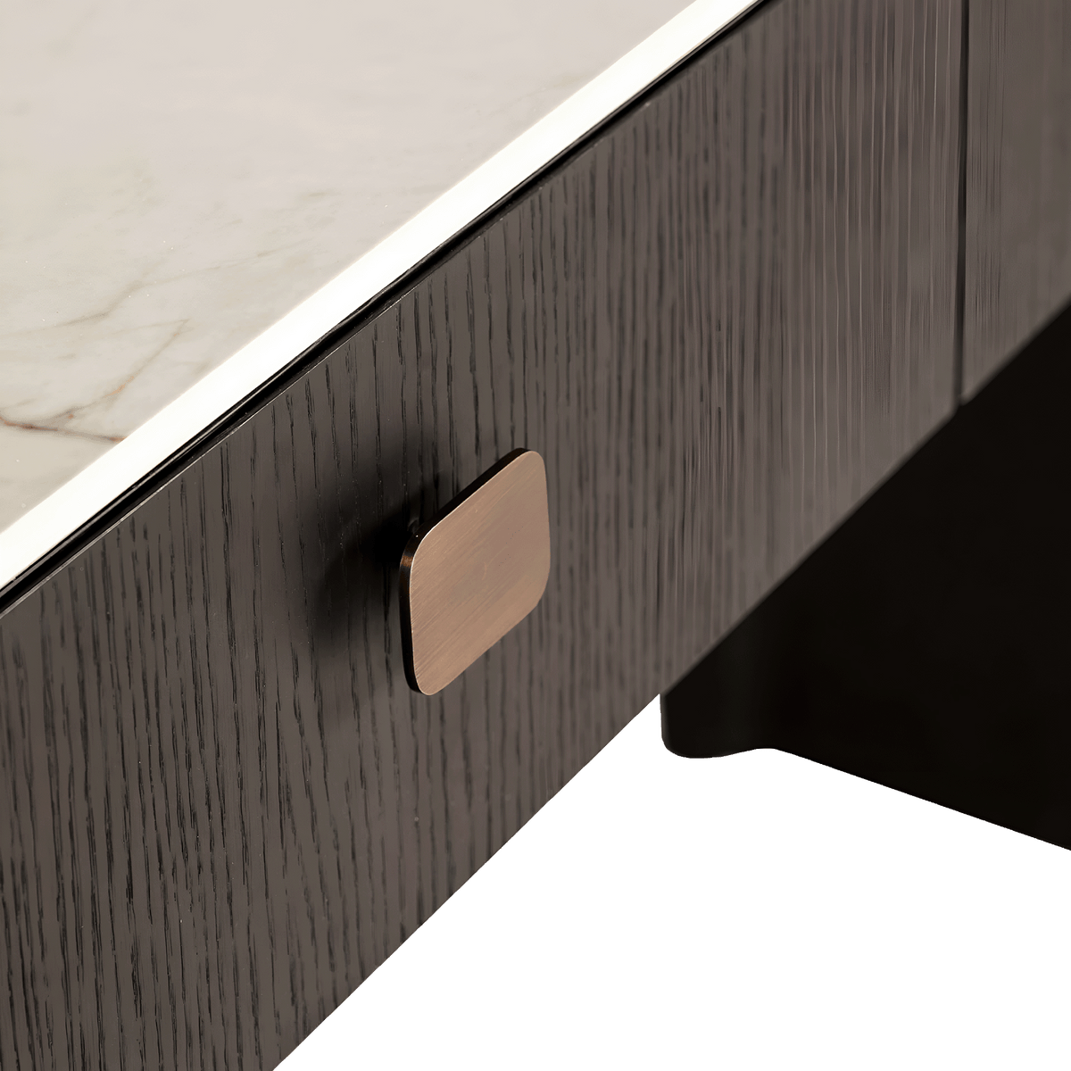 Cassandra 2 Drawer Chest of Drawers in Ebony—a pinnacle of high-end luxury and sophistication for your bedroom. Crafted with meticulous attention to detail, this bedside table exudes opulence with its sleek ebony finish and copper metal handles, adding a touch of contemporary design. Experience both style and durability with the sintered stone top, which is both stain and scratch-resistant, ensuring longevity and easy maintenance.