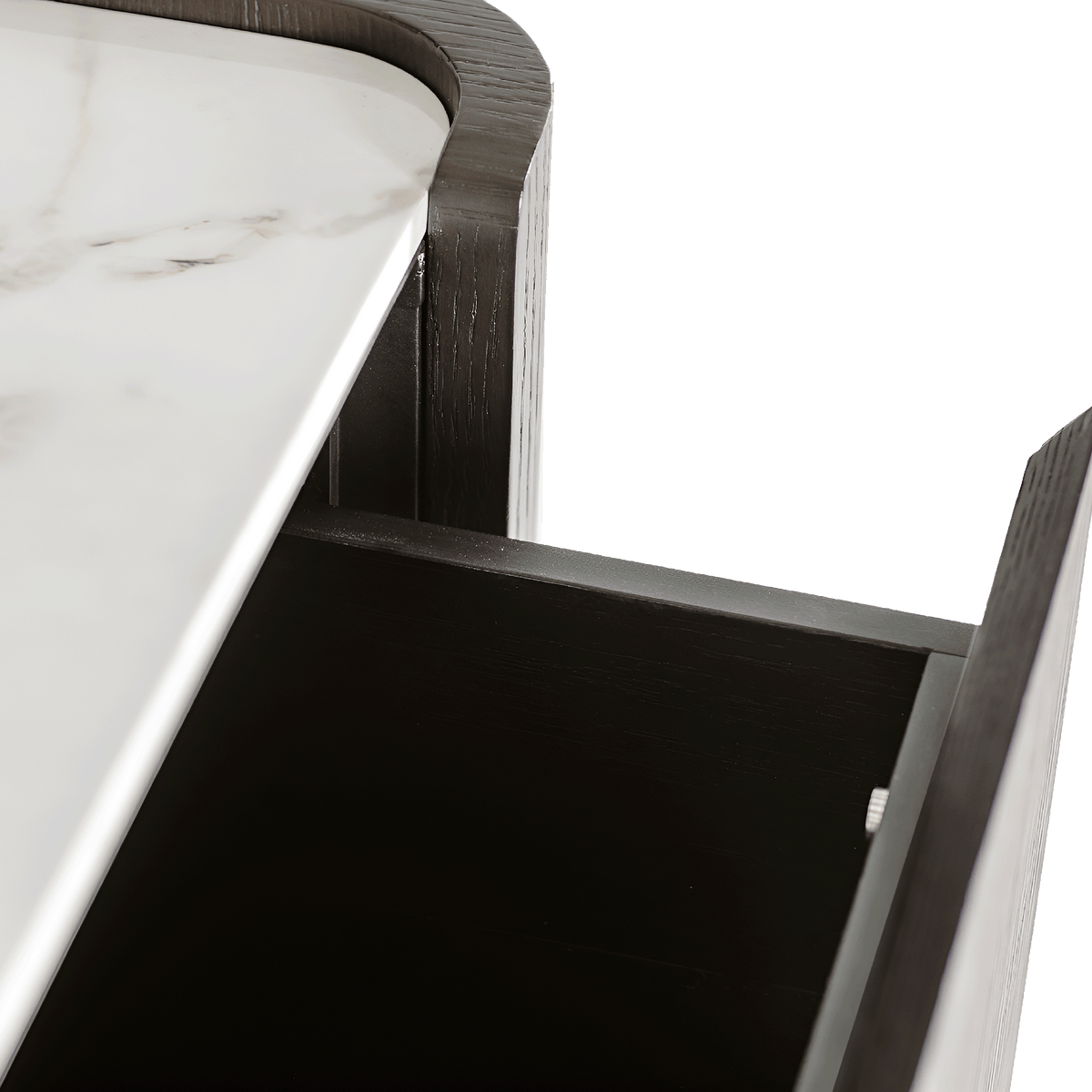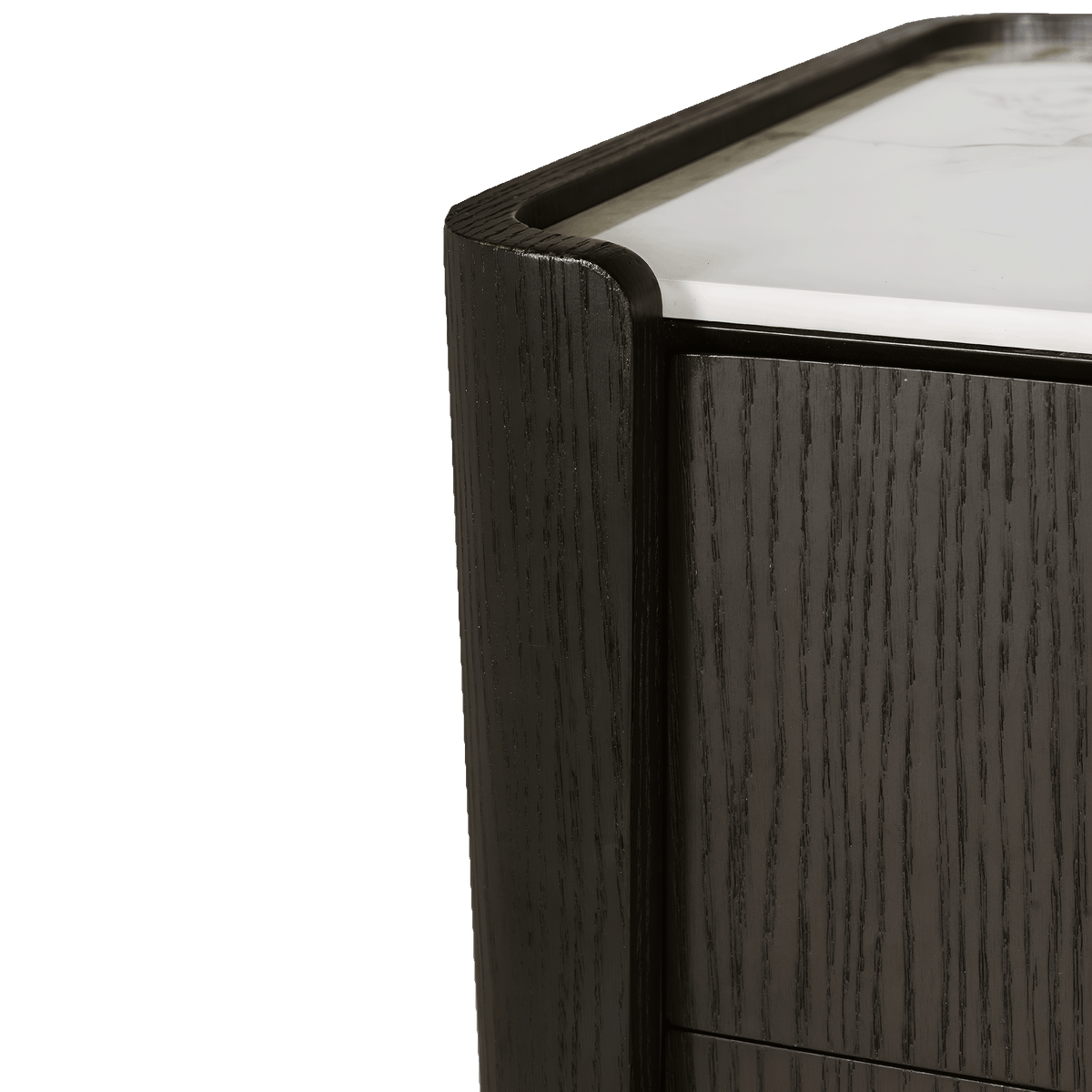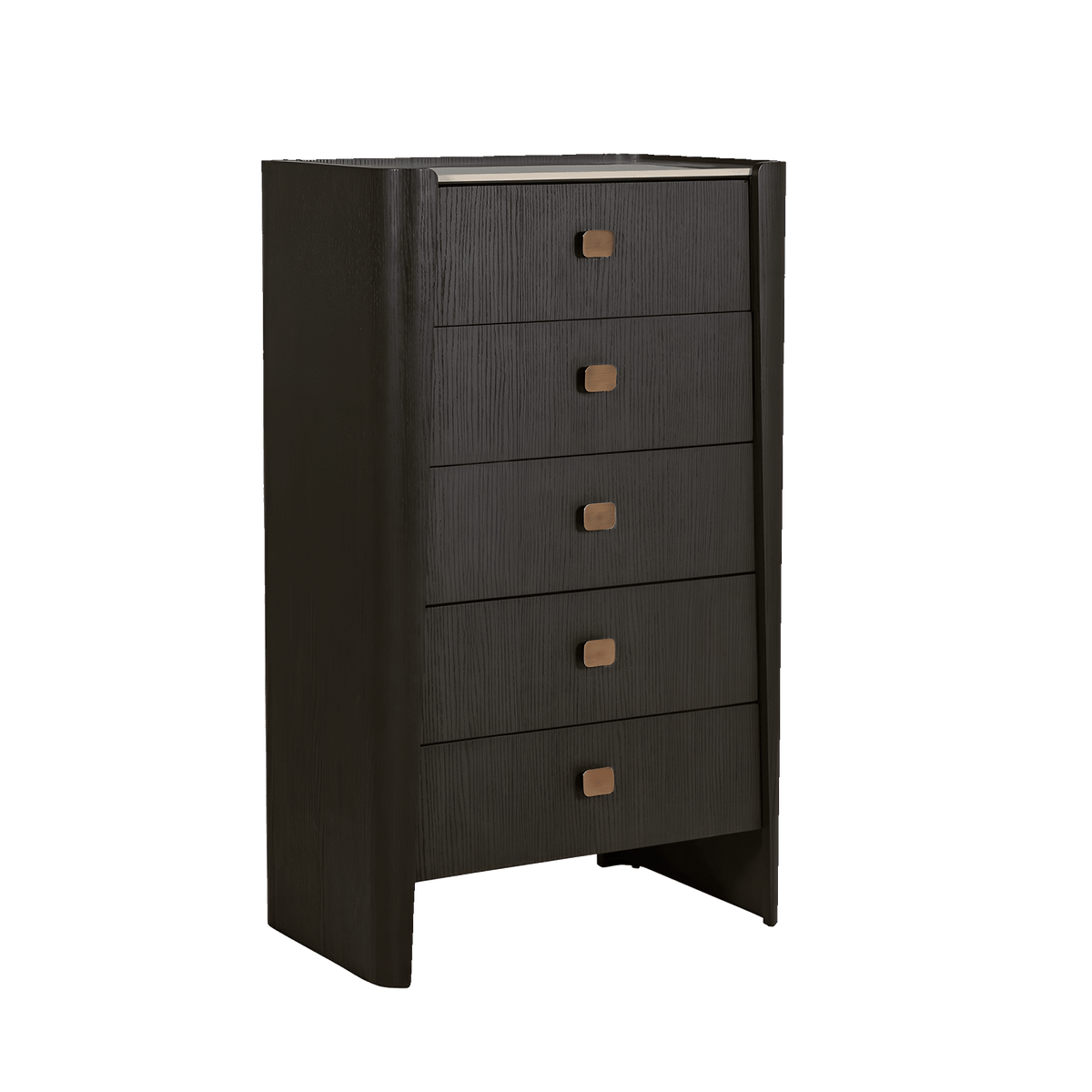 Cassandra 5 Drawer Chest of Drawers in Ebony—a pinnacle of high-end luxury and sophistication for your bedroom. Crafted with meticulous attention to detail, this bedside table exudes opulence with its sleek ebony finish and copper metal handles, adding a touch of contemporary design. Experience both style and durability with the sintered stone top, which is both stain and scratch-resistant, ensuring longevity and easy maintenance.