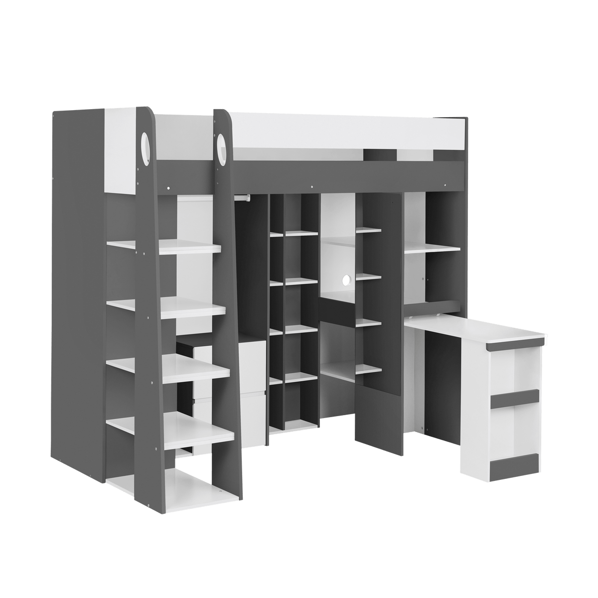 The Dawn High Sleeper is a perfect blend of style and functionality, designed to suit any bedroom décor with its clean and modern finish. Its space-saving design offers a smart solution for smaller rooms, providing everything you need in one compact unit. With ample storage, including drawers and shelves, you can keep your room tidy and organised, while the hanging rail ensures easy access to clothes. The pull-out desk creates a convenient workspace, perfect for studying.