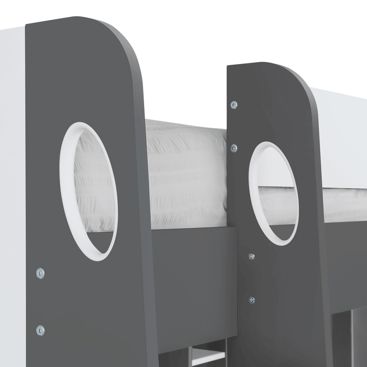 Adding a touch of practicality and style, the Dawn High Sleeper also features a tall mirror mounted on a panel beneath the bed, creating a functional vanity area. This bed is ideal for kids, teens, and even young adults who need a multifunctional space that grows with them. With its thoughtful design and quality craftsmanship, the Dawn High Sleeper is an excellent addition to any home, seamlessly blending style, storage, and functionality.