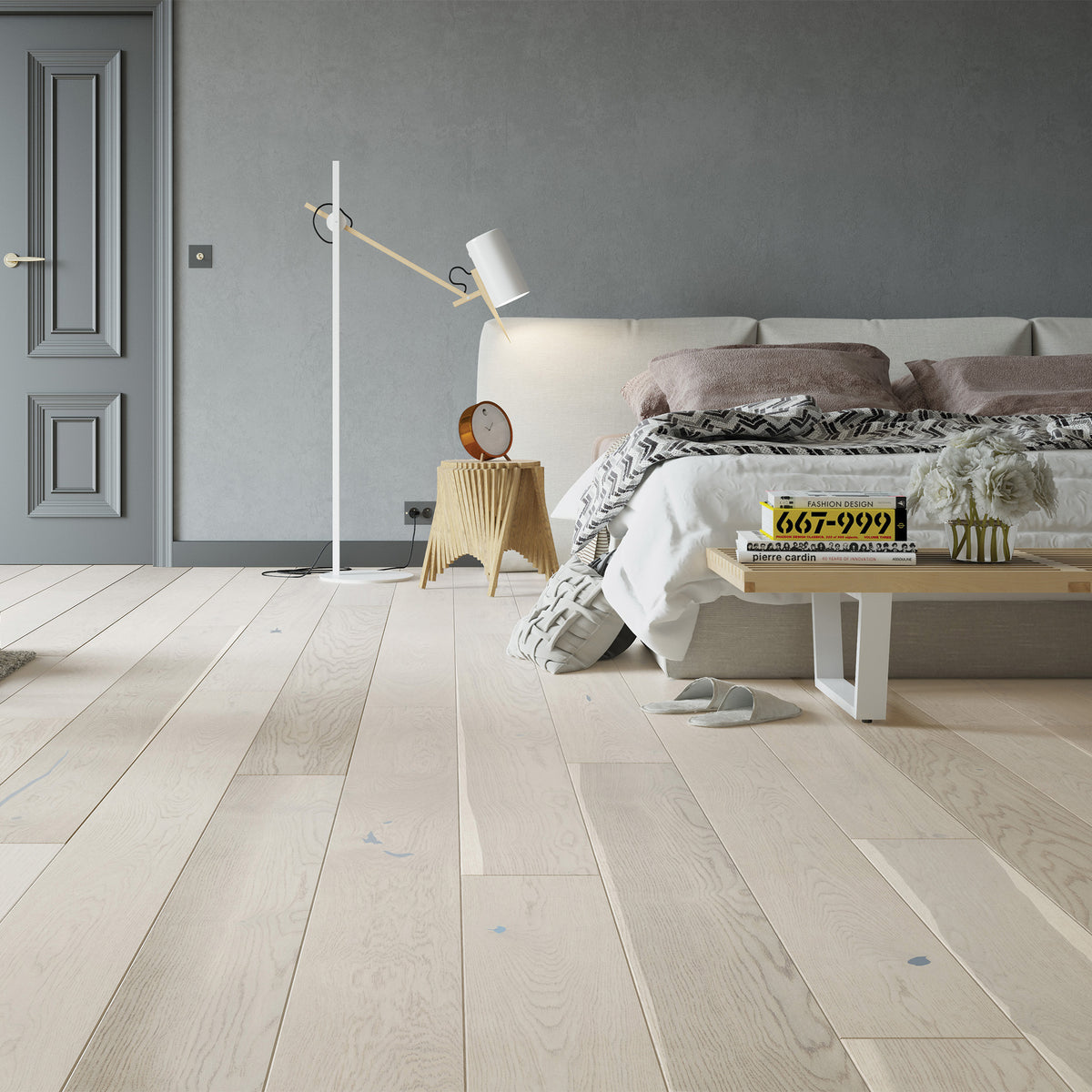 Enhance your living spaces with the timeless beauty of Barista Mocha Brushed Matt Lacquered Engineered Flooring. The brushed texture, combined with a durable matt lacquer finish, brings out the wood's natural character and charm. These 14mm thick oak planks provide excellent stability and resilience, suitable for both residential and commercial spaces. The sleek white finish adds a touch of modern elegance, seamlessly integrating with various interior styles and enhancing the overall aesthetic of your home.