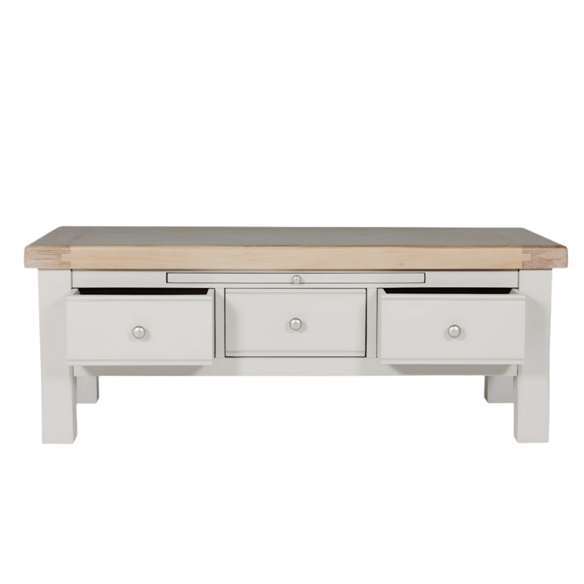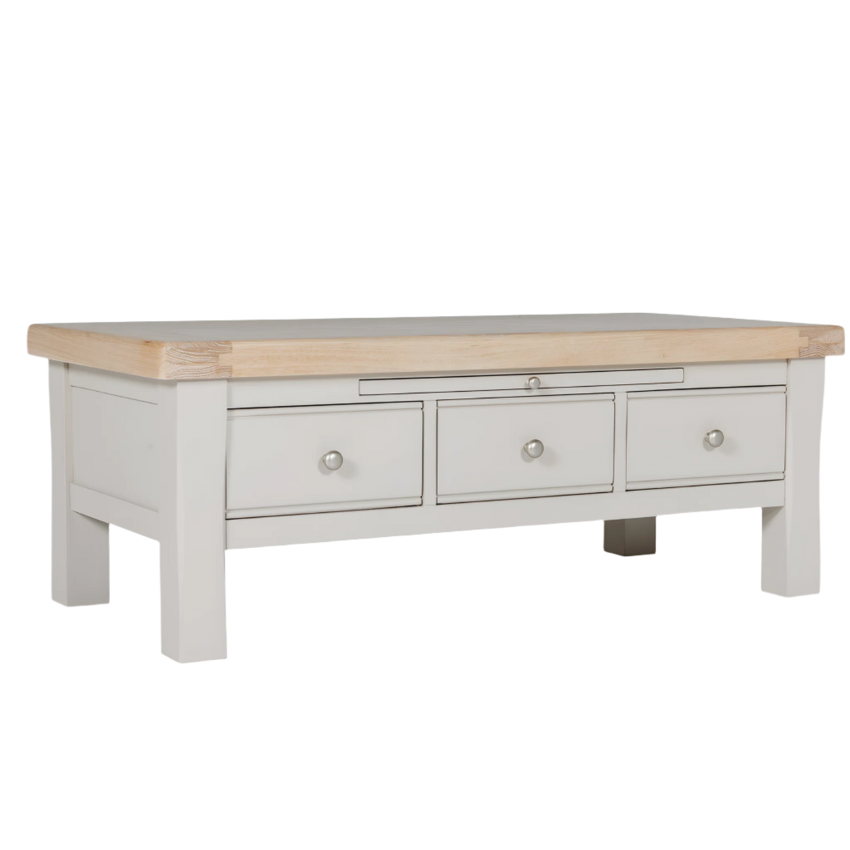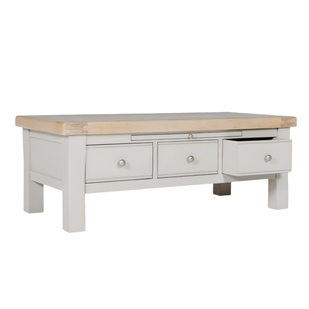 Dunne Coffee Table in Taupe. Featuring a versatile design, this coffee table boasts a painted finish complemented by an oak veneer top. It includes three small drawers with sleek metal handles, providing convenient storage for everyday essentials.