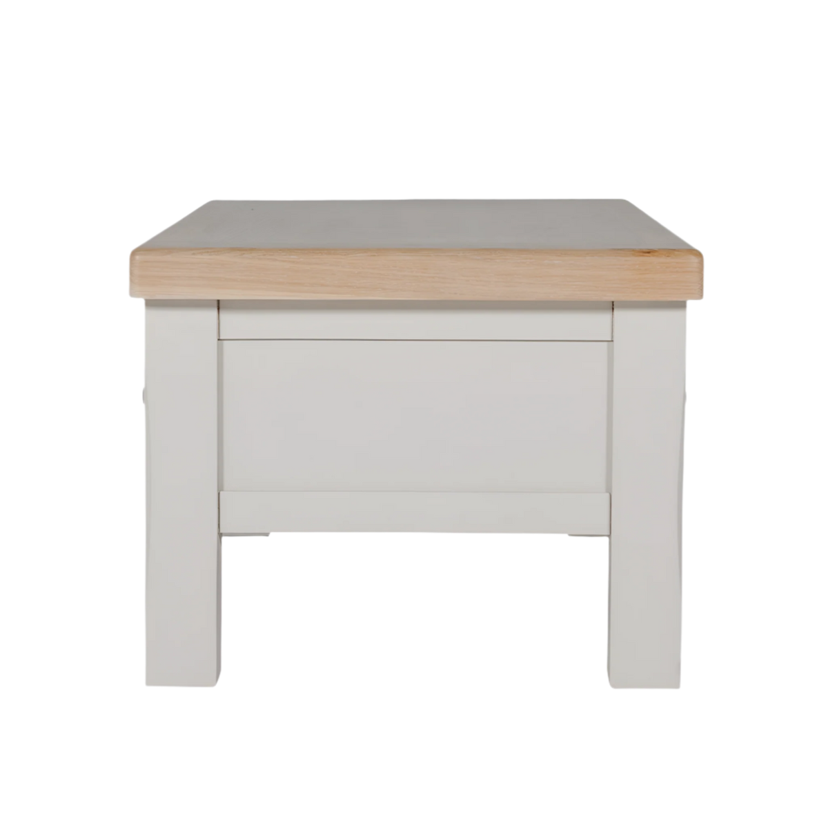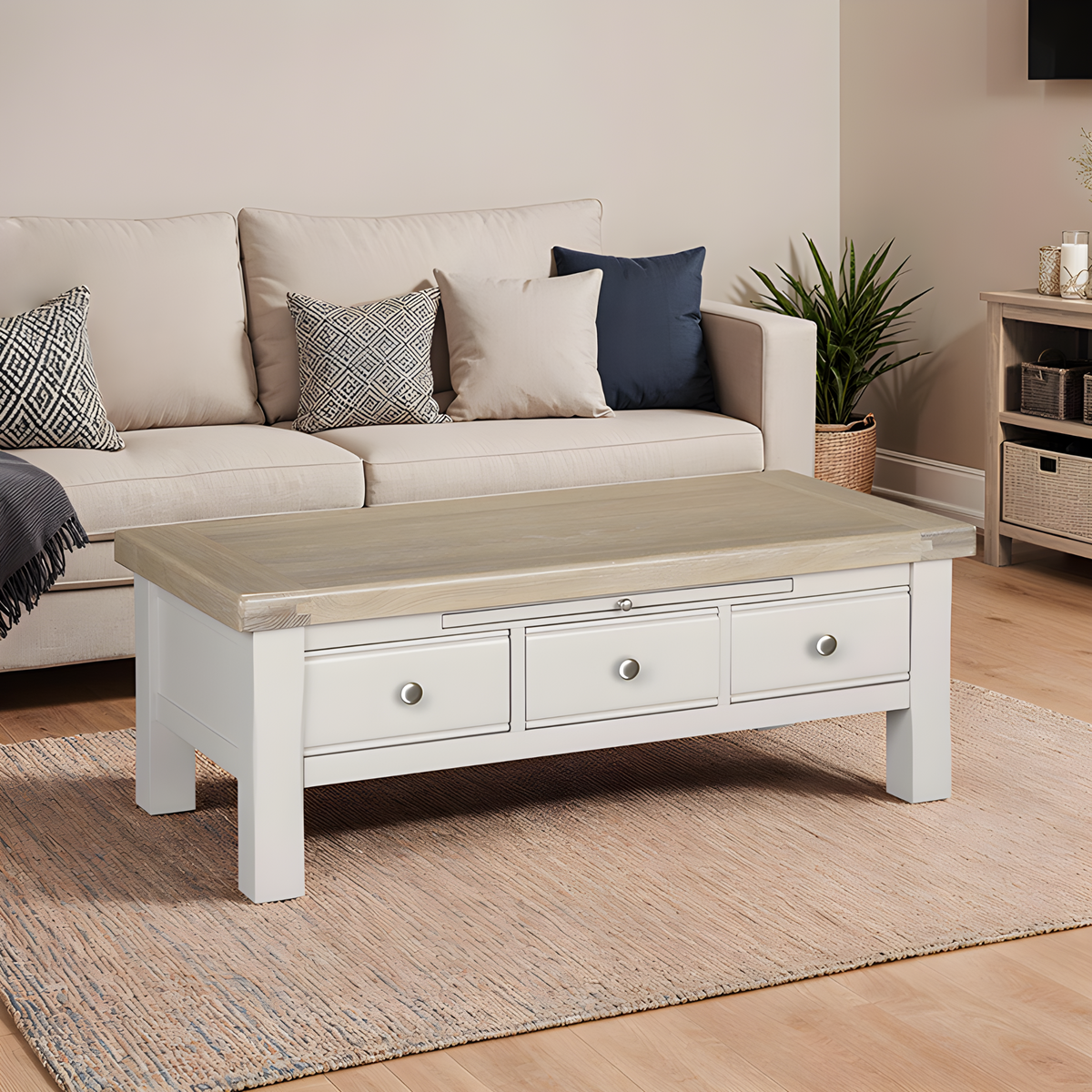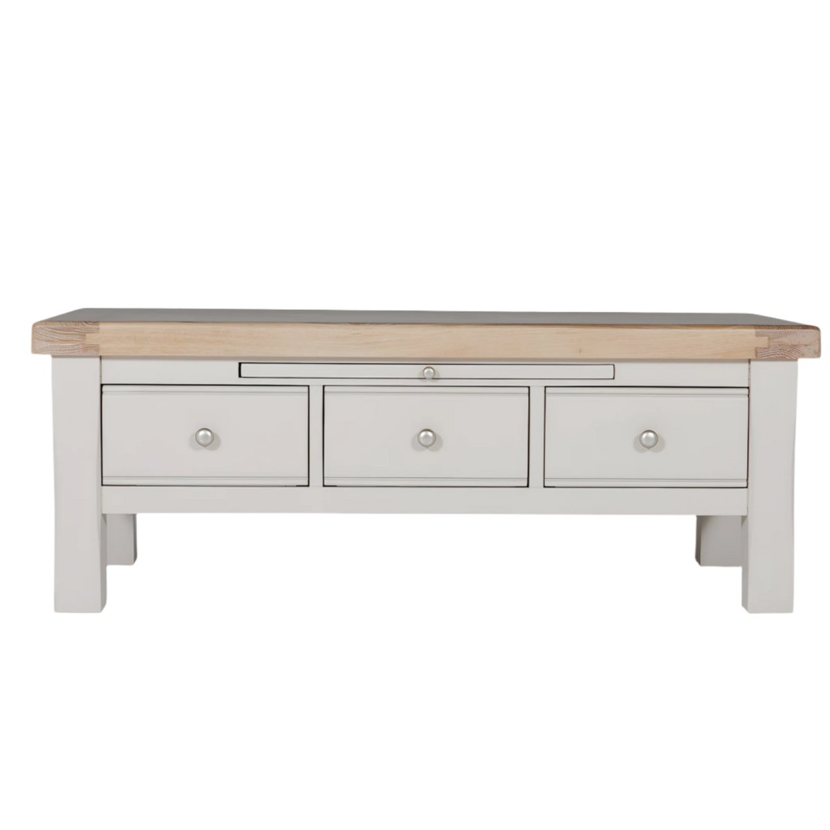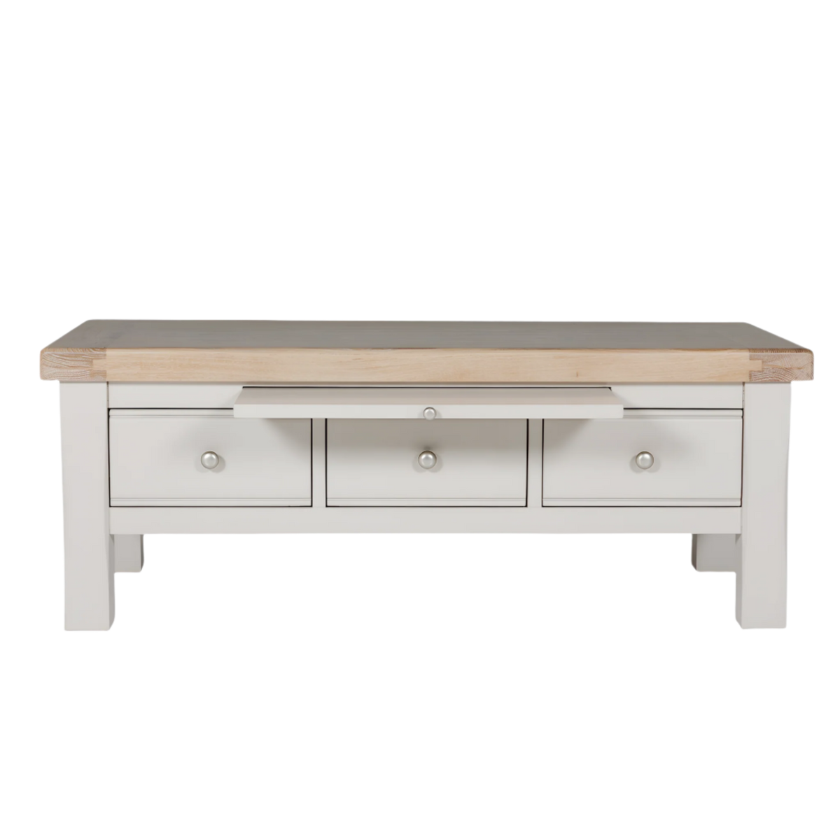 Dunne Coffee Table in Taupe. Featuring a versatile design, this coffee table boasts a painted finish complemented by an oak veneer top. It includes three small drawers with sleek metal handles, providing convenient storage for everyday essentials.