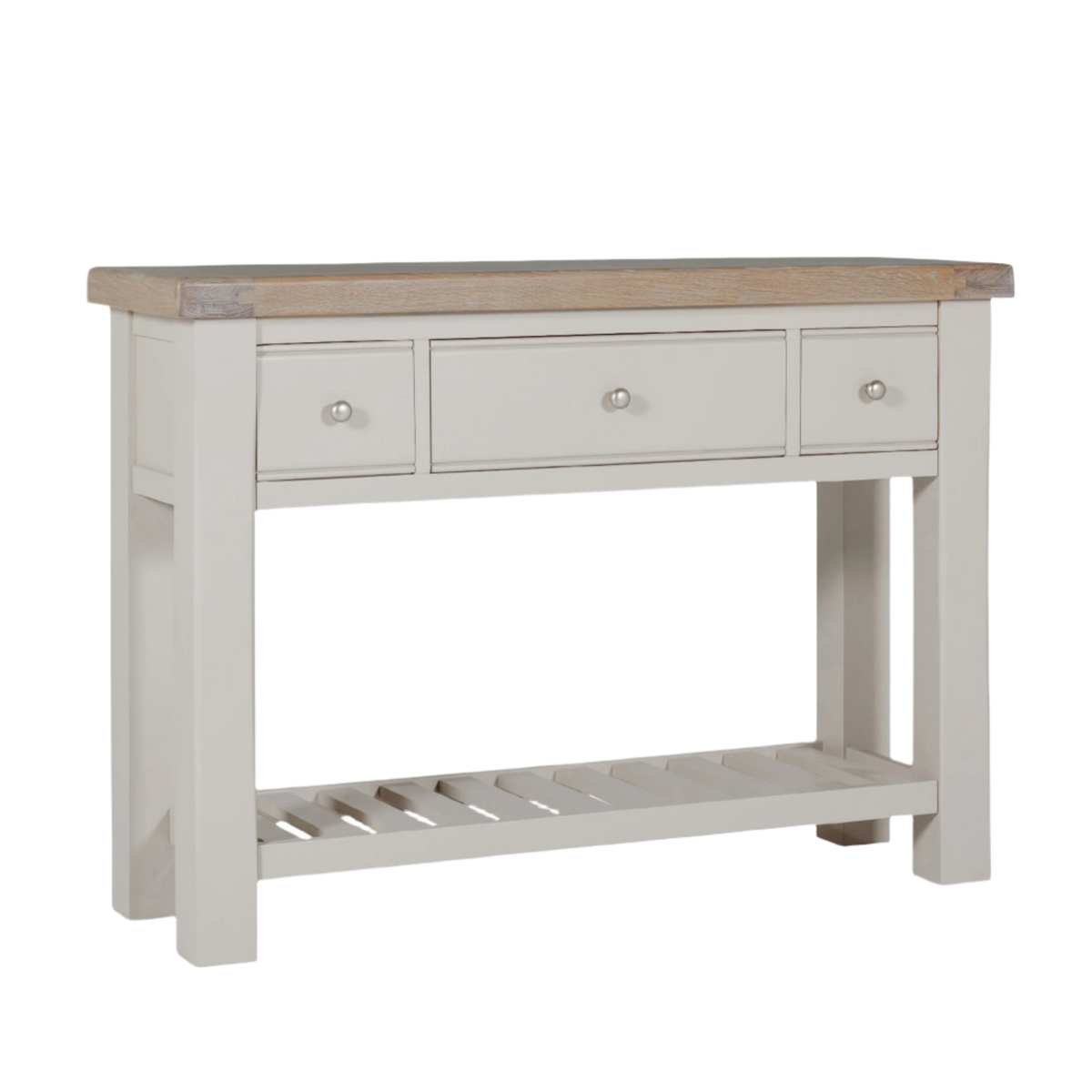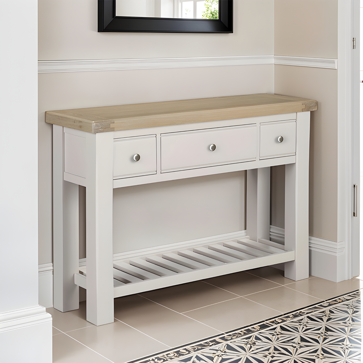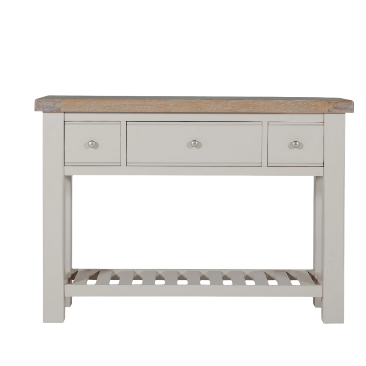 Dunne Console Table in Taupe. This versatile design features a sleek painted finish and includes three drawers with modern metal handles for convenient storage. The lower slatted shelving unit offers additional space for decorative items or essentials. Combining style and functionality, the Dunne Console Table is a chic addition to any room.