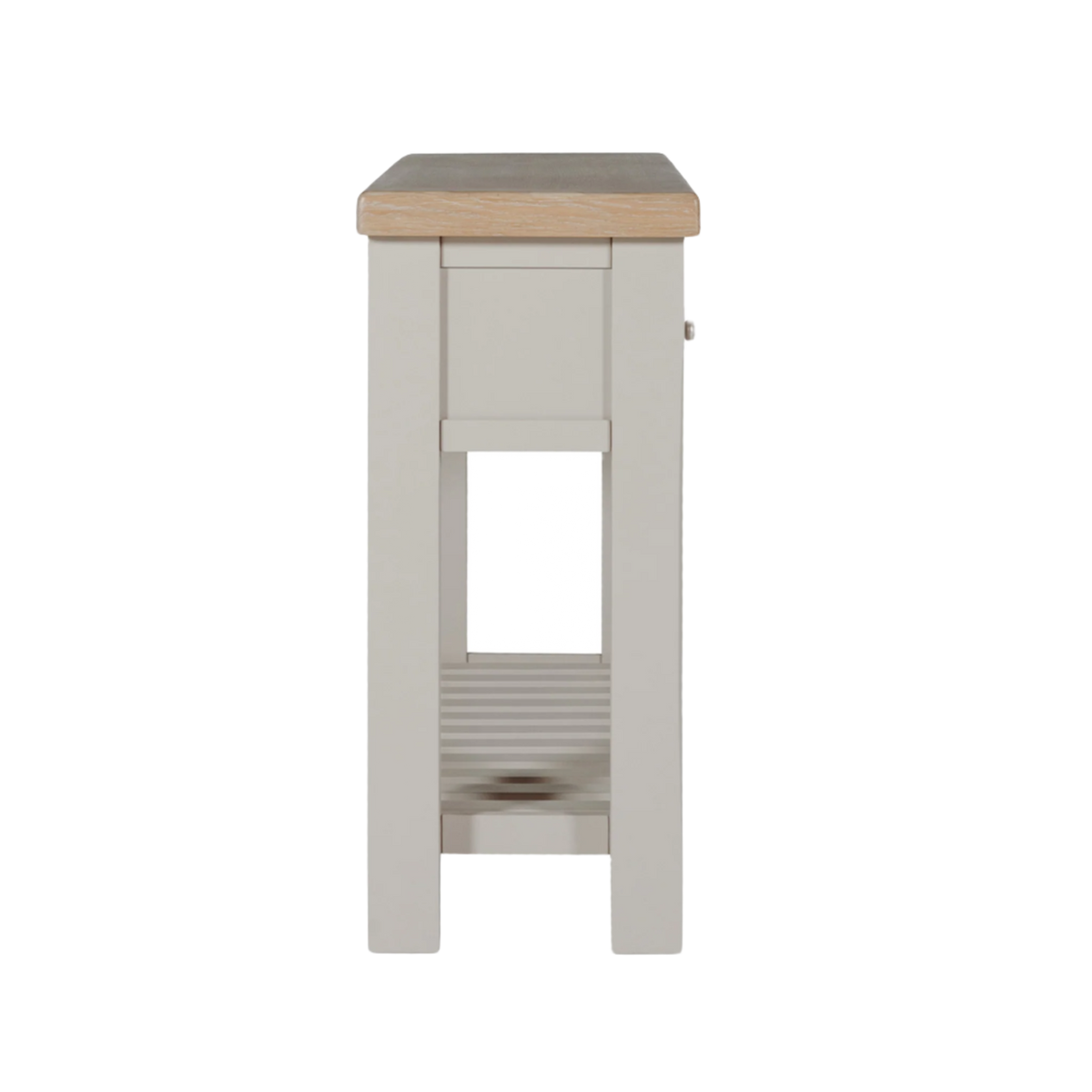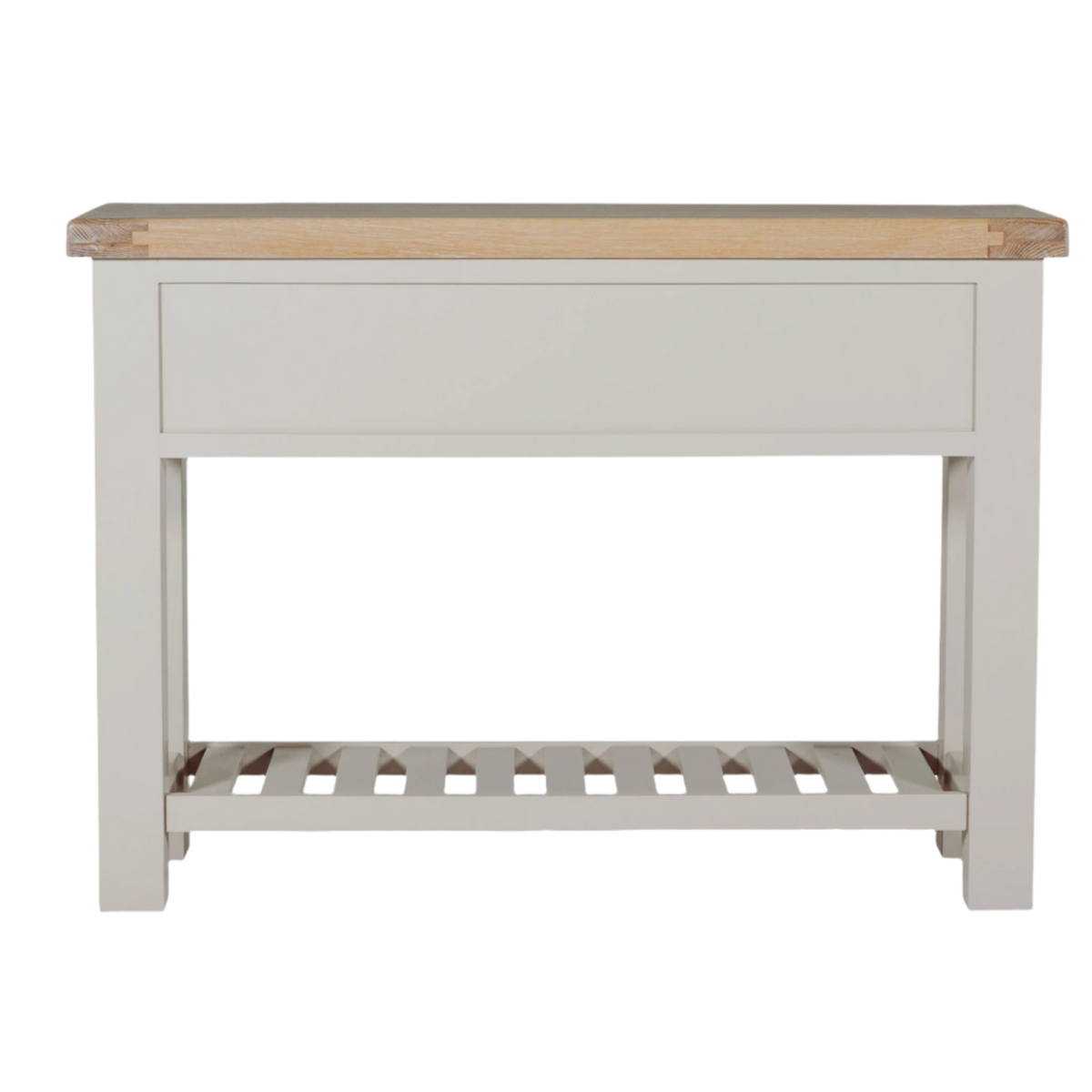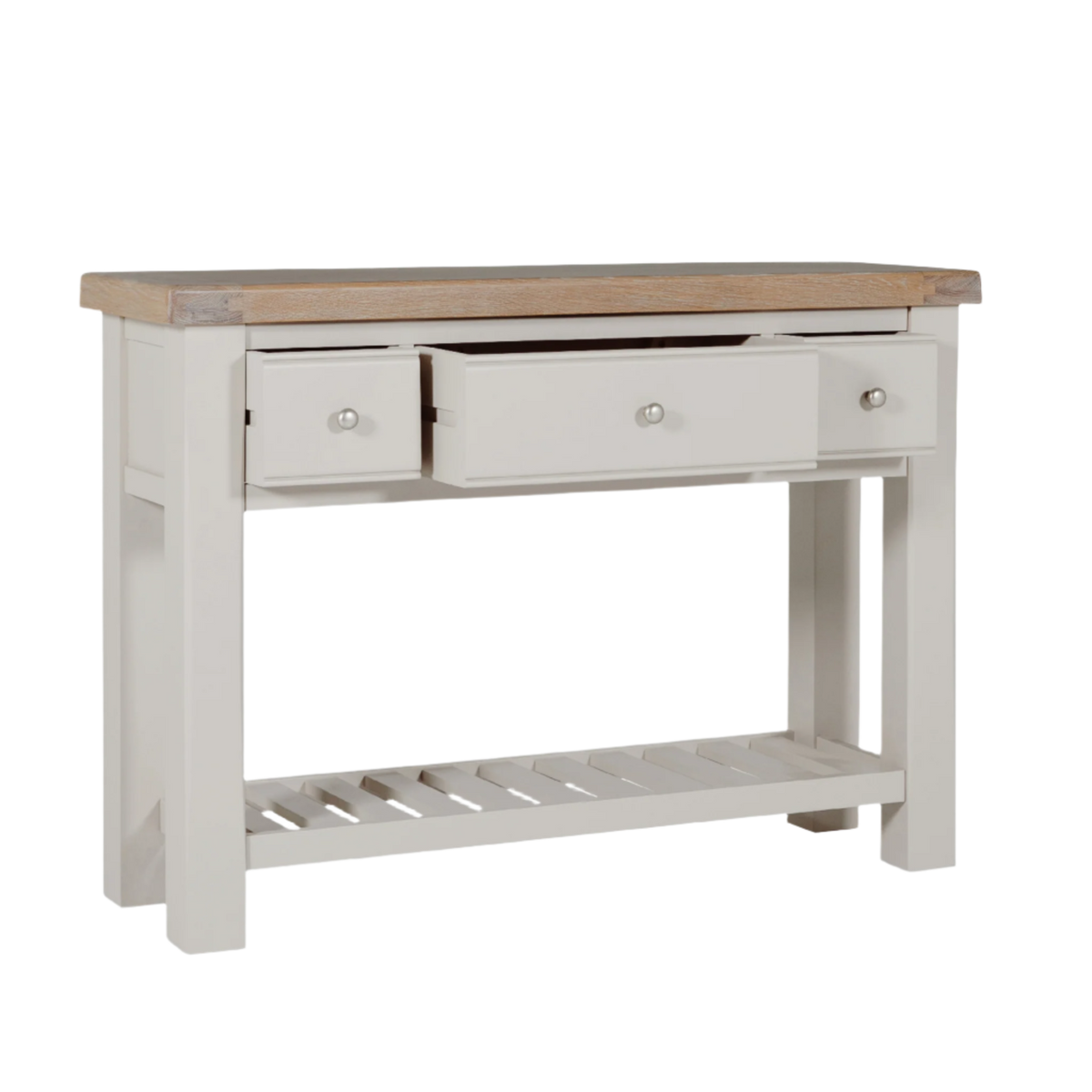 Dunne Console Table in Taupe. This versatile design features a sleek painted finish and includes three drawers with modern metal handles for convenient storage. The lower slatted shelving unit offers additional space for decorative items or essentials. Combining style and functionality, the Dunne Console Table is a chic addition to any room.