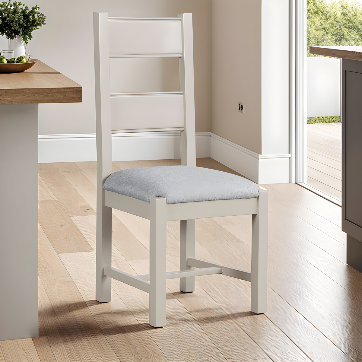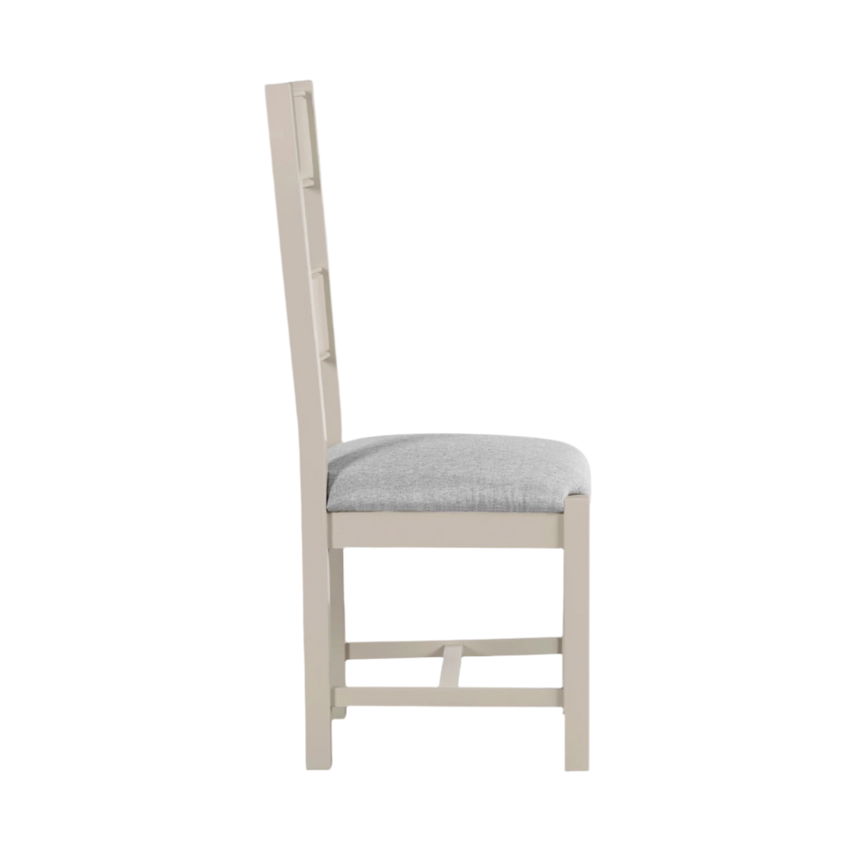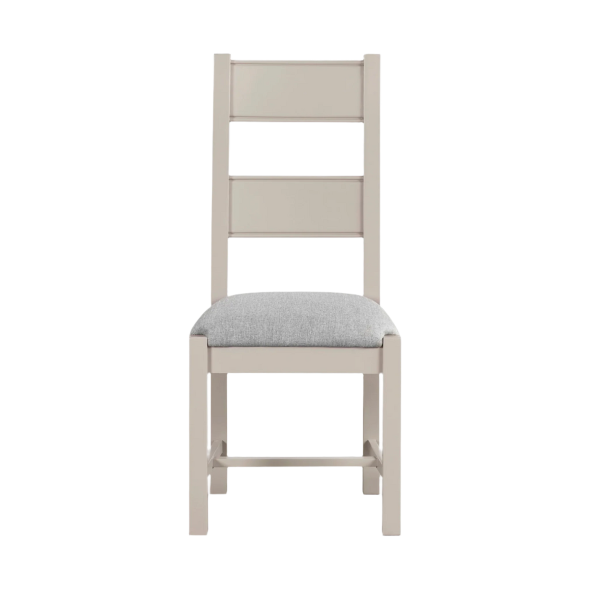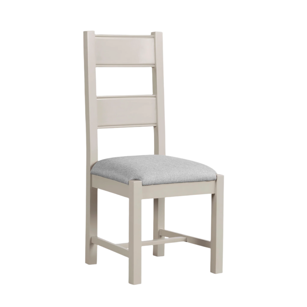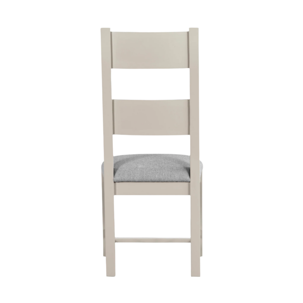 Dunne Dining Chair in Grey. Featuring a versatile tall back design, this chair combines a chic painted finish with a plush padded seat cushion covered in soft fabric. Its stylish and comfortable design makes it a perfect addition to any dining room, offering both elegance and practicality