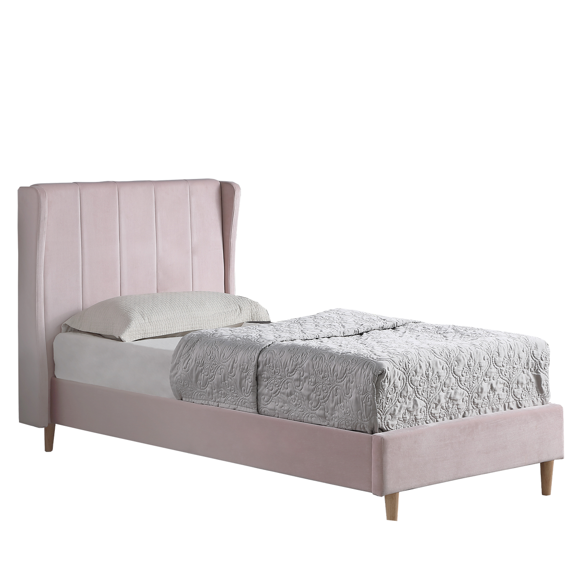 The vertically stitched headboard offers a plush, comfortable backrest. While streamlined silhouette and soft pastel upholstery complement a range of decors and create a cosy atmosphere.