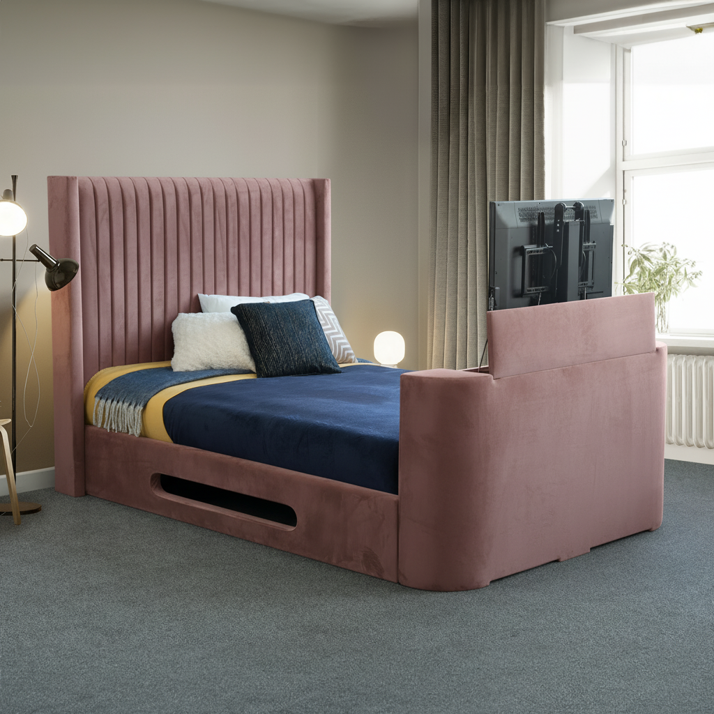 The Felix Tv Bedframe seamlessly integrates entertainment into your bedroom with a built-in television mount accommodating screens up to 40 inches. Engineered with a compact 8 cm depth design, it maximizes space efficiency without compromising functionality. Choose from three frame sizes to suit your room dimensions, and select from 20 colour options to match your interior aesthetic. The sturdy construction provides reliable support for both sleeping and viewing comfort. Television not included.