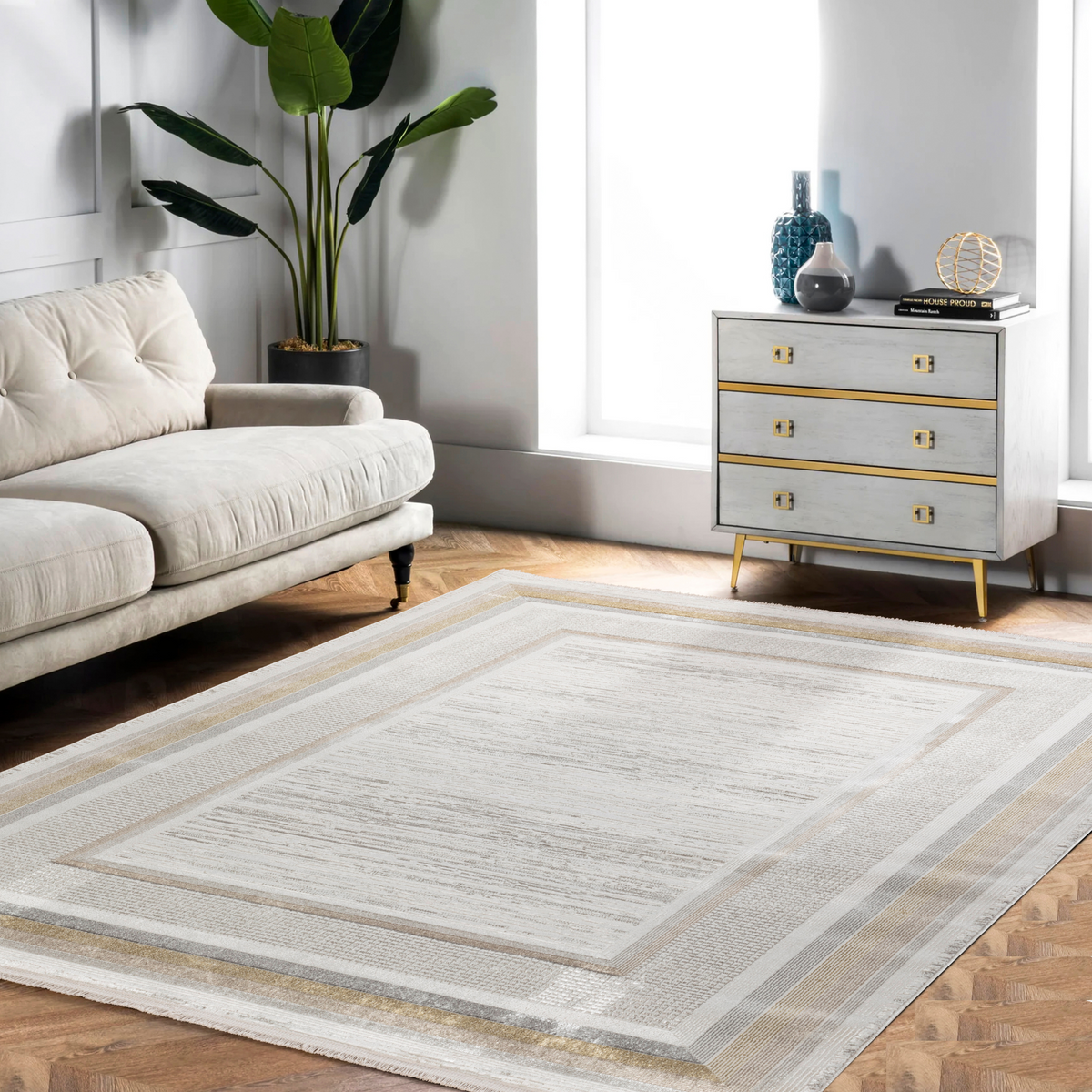 The Fiesta Roman Gold rug features a sophisticated blend of gold, white, and grey tones, designed to complement a variety of interior styles. Available in five sizes, it offers versatile options to suit different spaces, from cozy corners to larger living areas. Crafted with attention to detail, this rug adds a refined touch while providing durable comfort underfoot. Ideal for enhancing both modern and classic décors, it balances elegance with practicality.