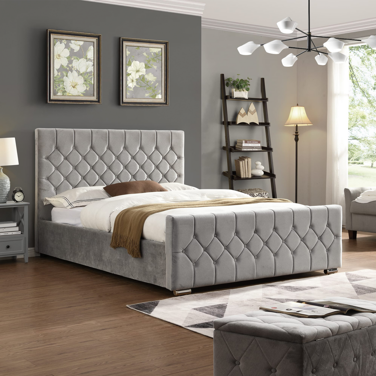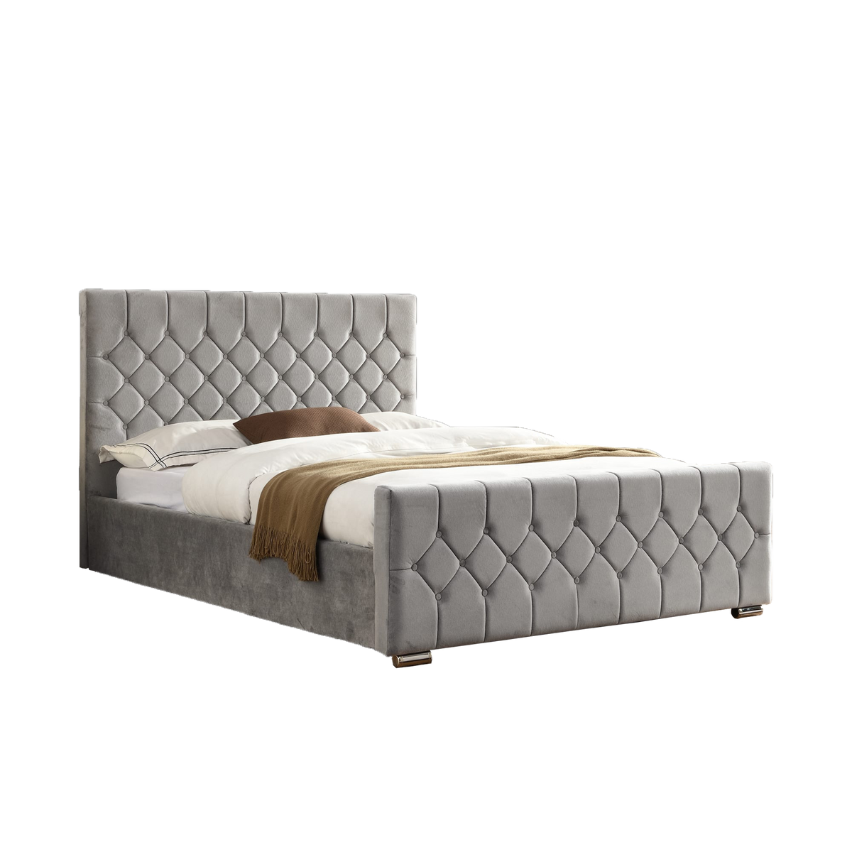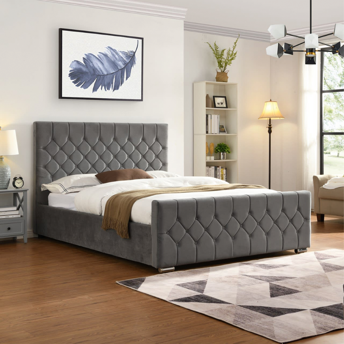 Upholstered in soft, high-quality chenille fabric the Gemma Bedframe provides a soft, plush feel. The headboard and footboard are adorned with a sophisticated diamond-stitched design and feature a button-tufted back headboard, adding a touch of luxury to your room.
