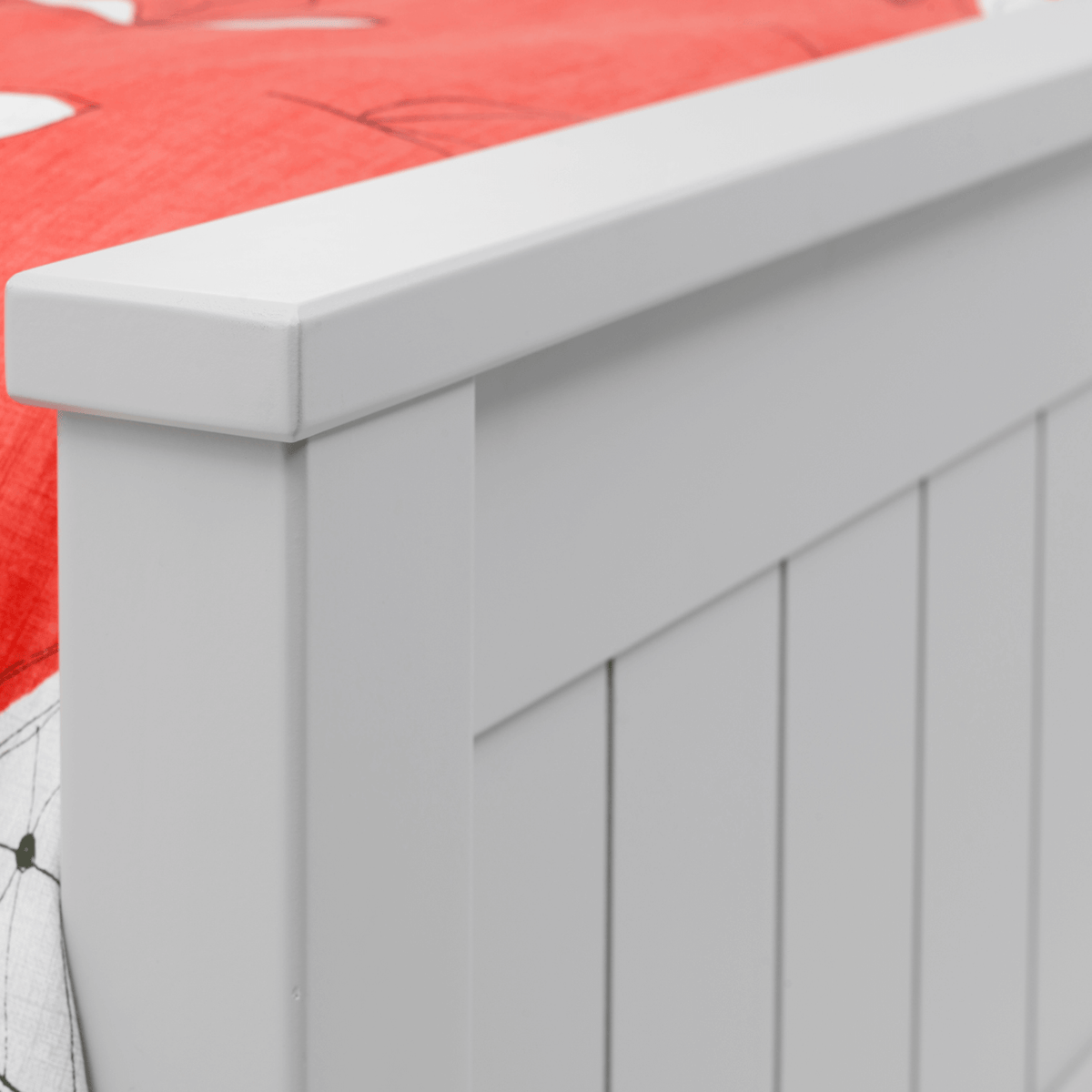 The headboard features a convenient shelf, perfect for keeping books, decor items, or bedtime essentials within arm's reach, offering both practicality and style.