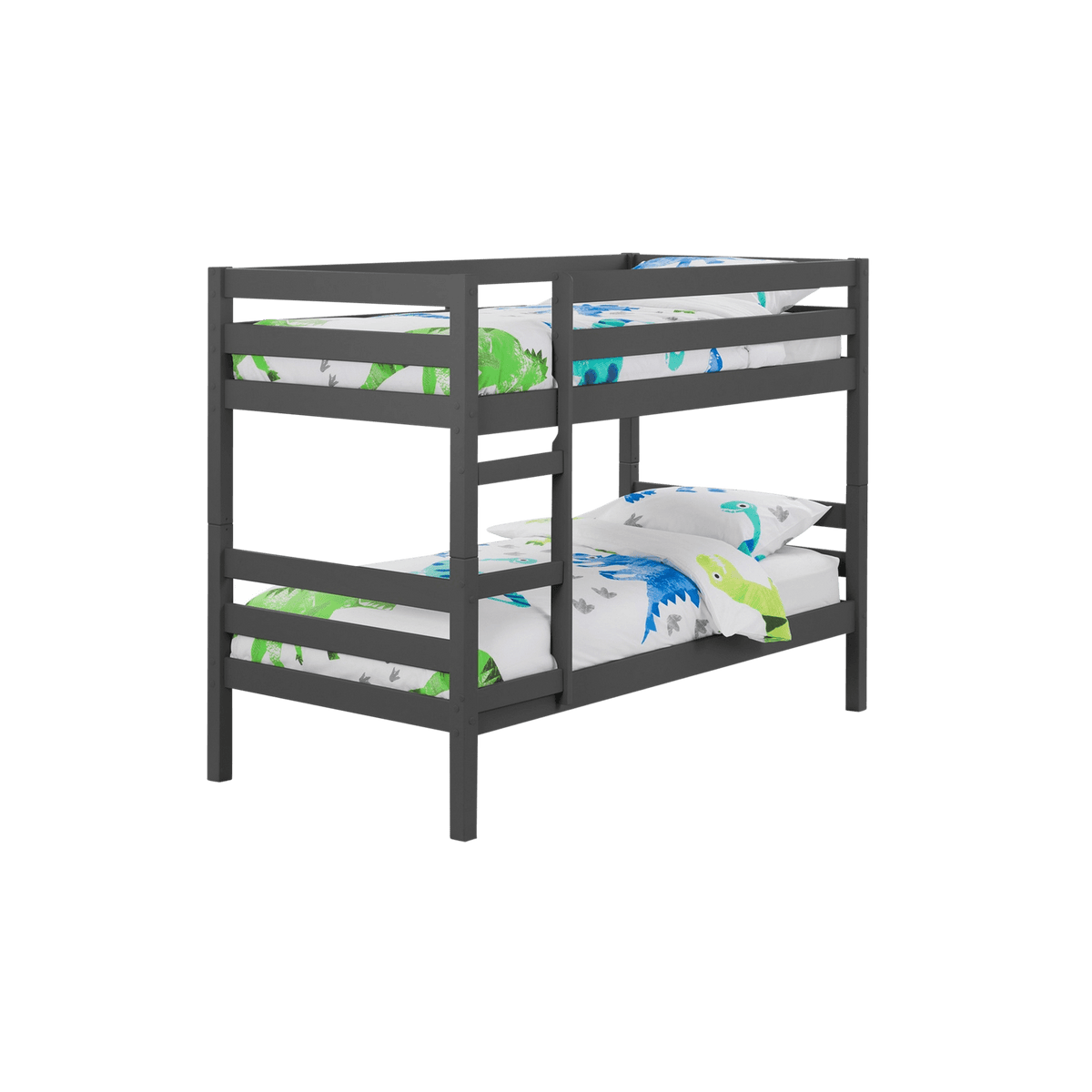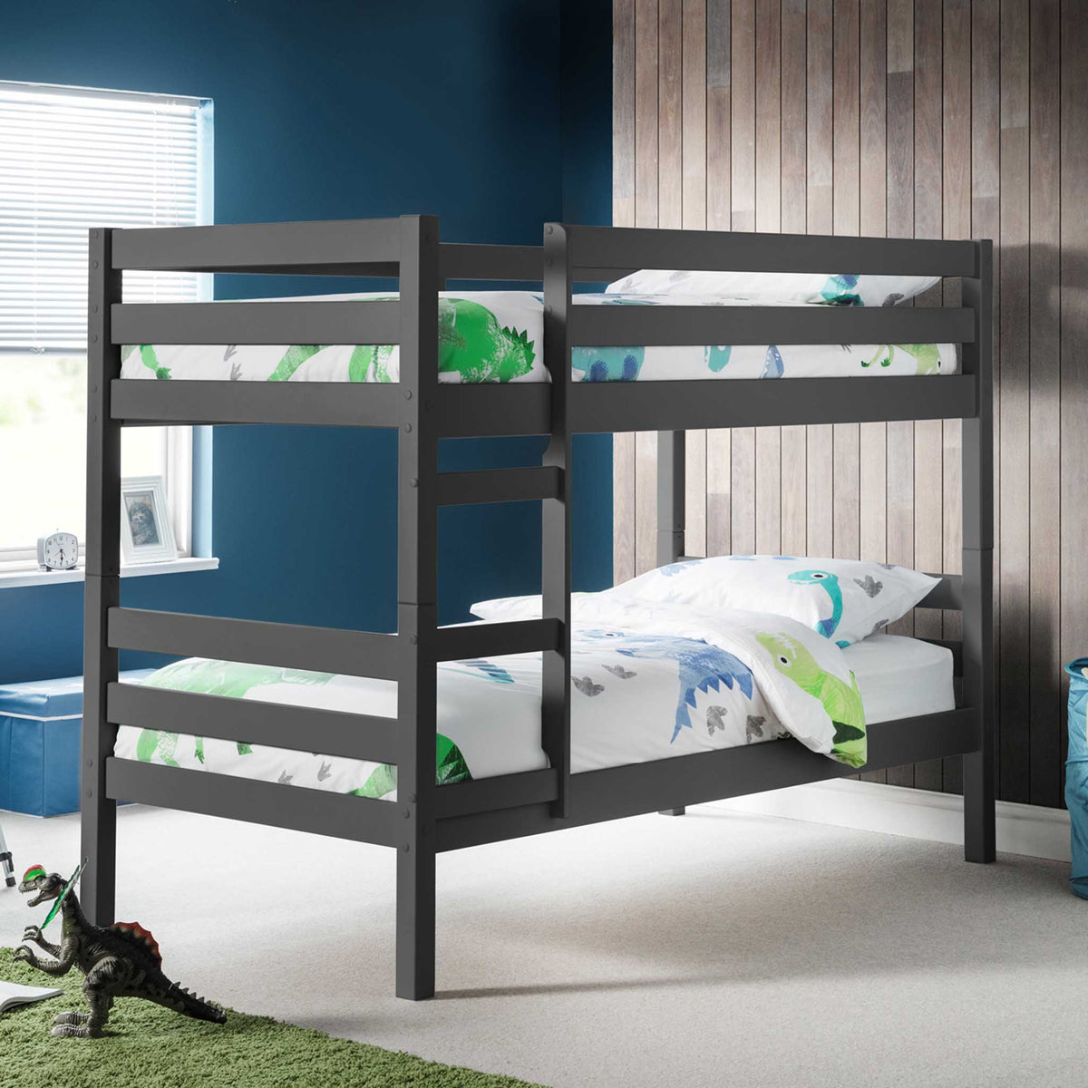 Its sleek, modern design with a dark grey finish ensures it fits well in any contemporary bedroom. The bed's robust wooden frame is designed to withstand active use while maintaining its aesthetic appeal. It features a safe and secure ladder for easy access to the top bunk, with guardrails on the top bunk for added safety.