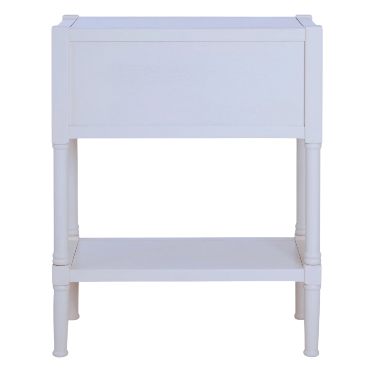 This sustainably sourced console table in a clean hand carved design creates a classically inspired aesthetic. Accented in pearl white finish, the table has three drawers complemented with handles in a sleek black finish. An additional shelf at the bottom provides open storage.