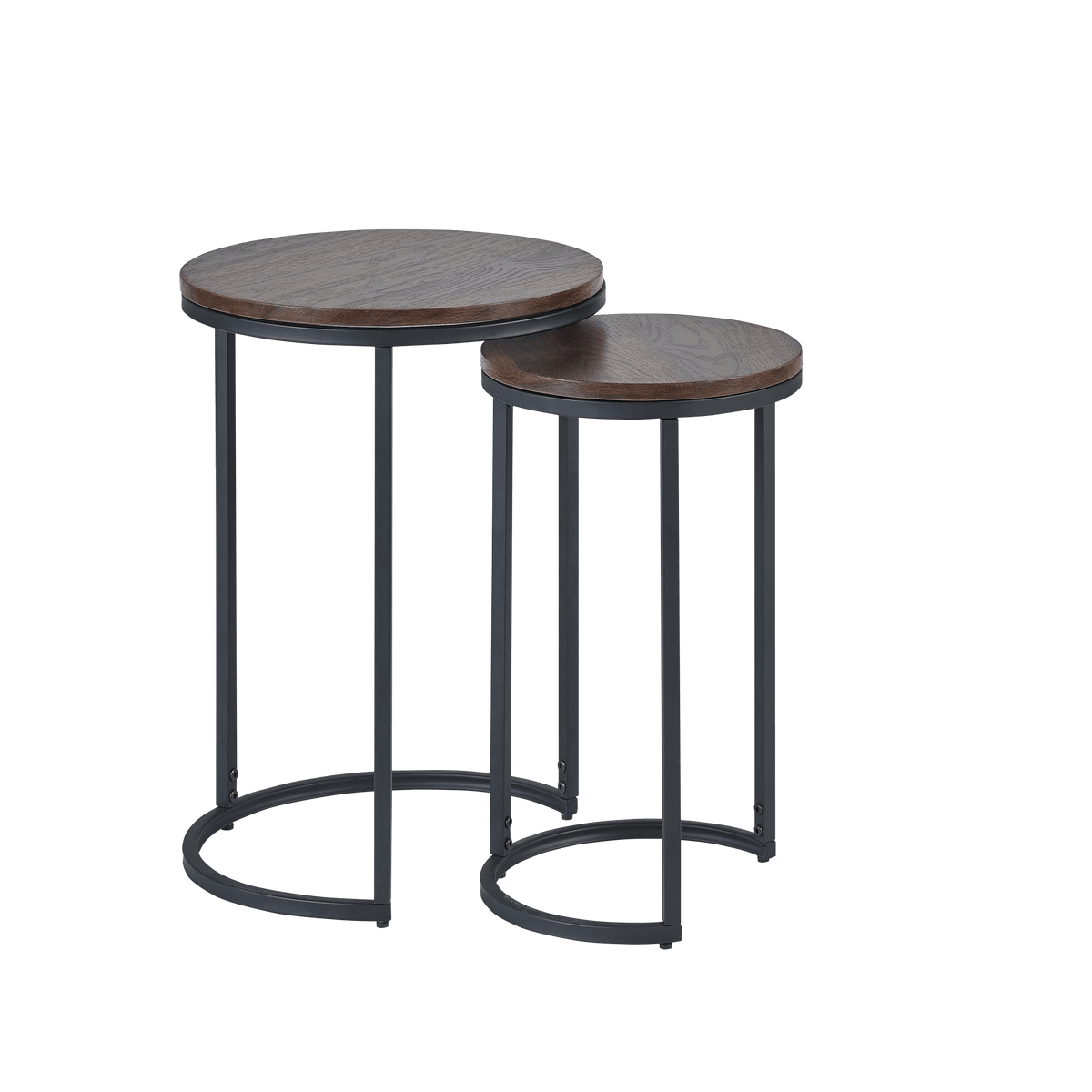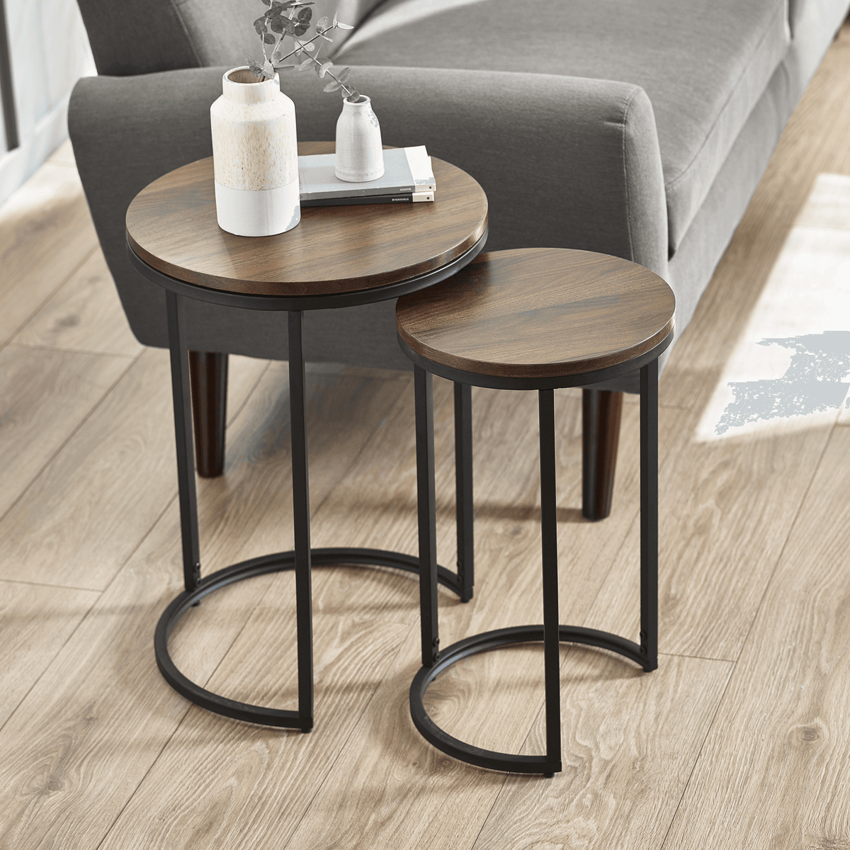 Enhance your living space with our elegant Hugo round nesting side tables, available in Sonoma Oak and Walnut finishes. These versatile tables feature a sleek design with sturdy metal legs, perfect for modern and contemporary interiors. Ideal for maximizing space, they can be used together or separately to suit your decor needs.