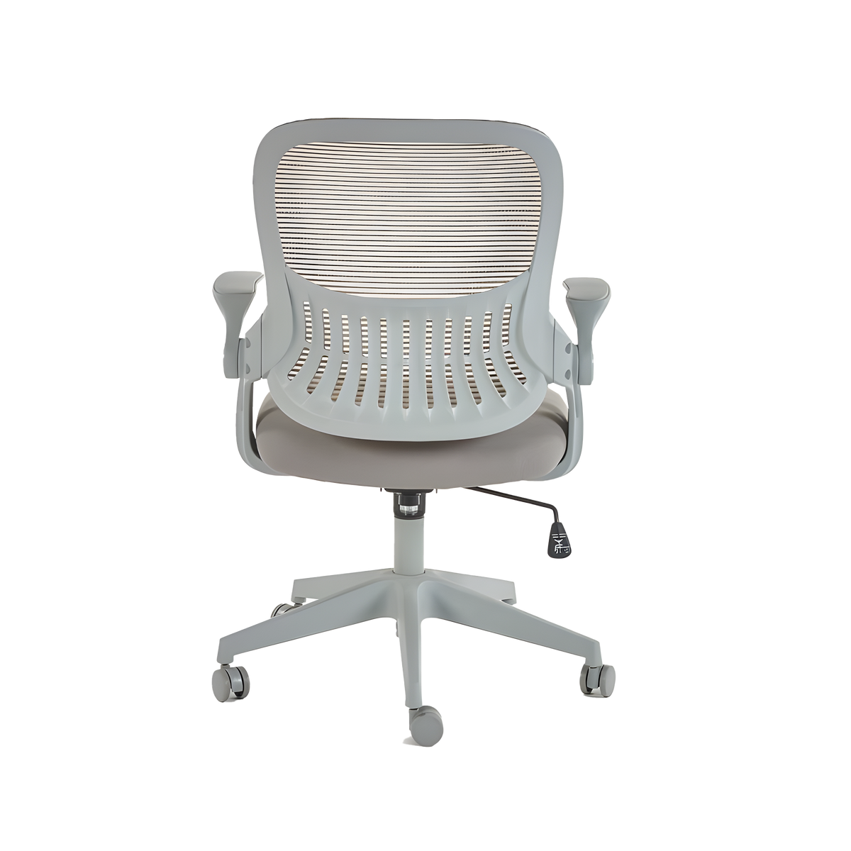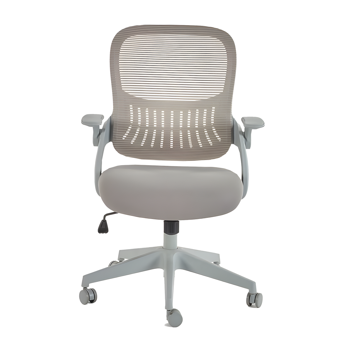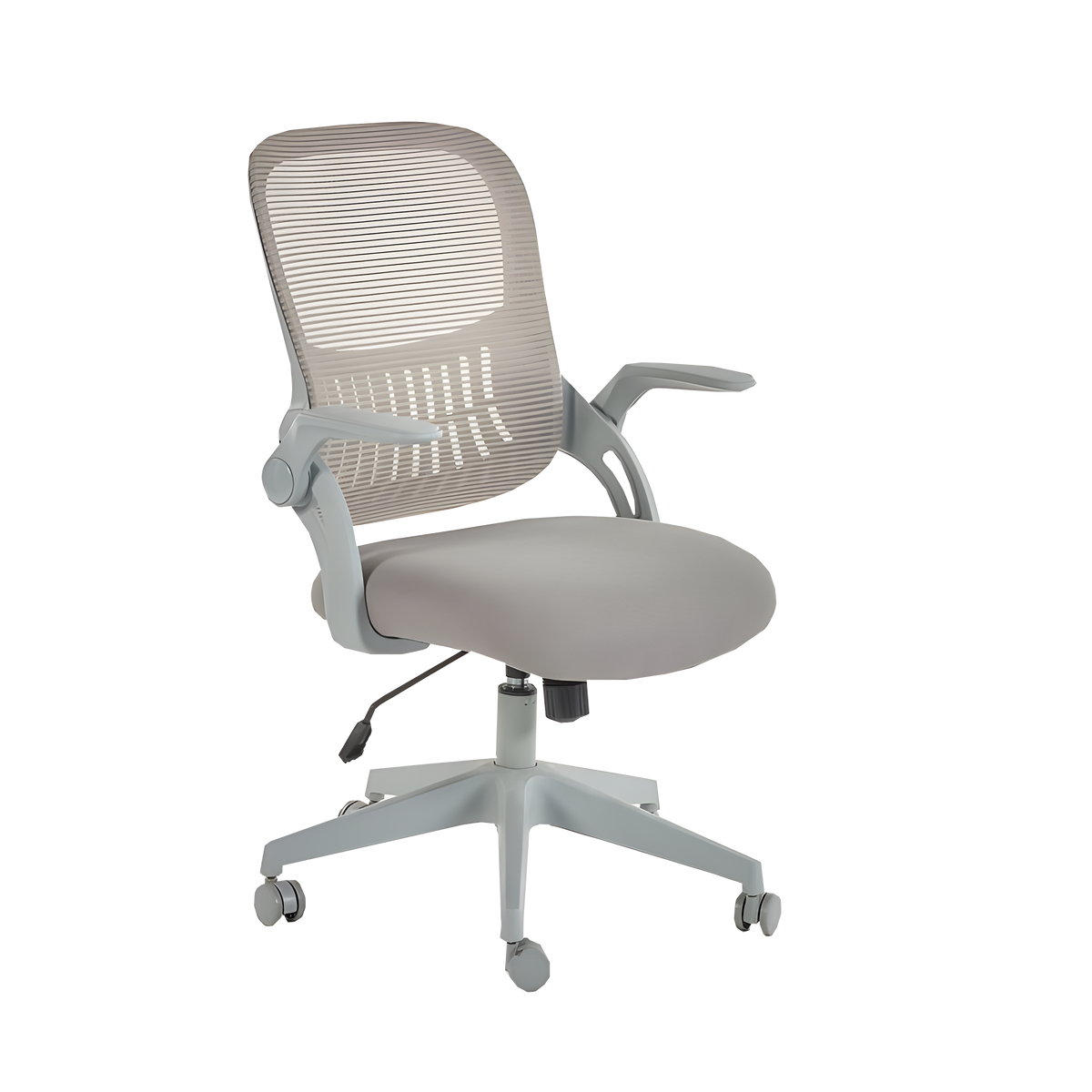 Featuring a curved grey mesh back, this chair ensures optimal support and breathability, keeping you cool and comfortable throughout your workday. Customise your seating experience with the adjustable height and tilt mechanism, allowing you to find the perfect position for productivity. The flip-up armrests offer versatility, letting you switch between extra support and a space-saving design.