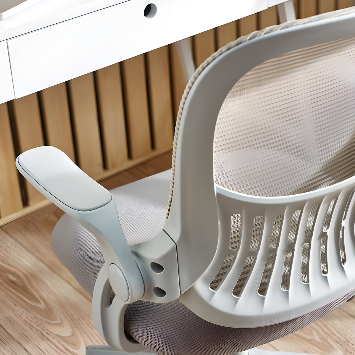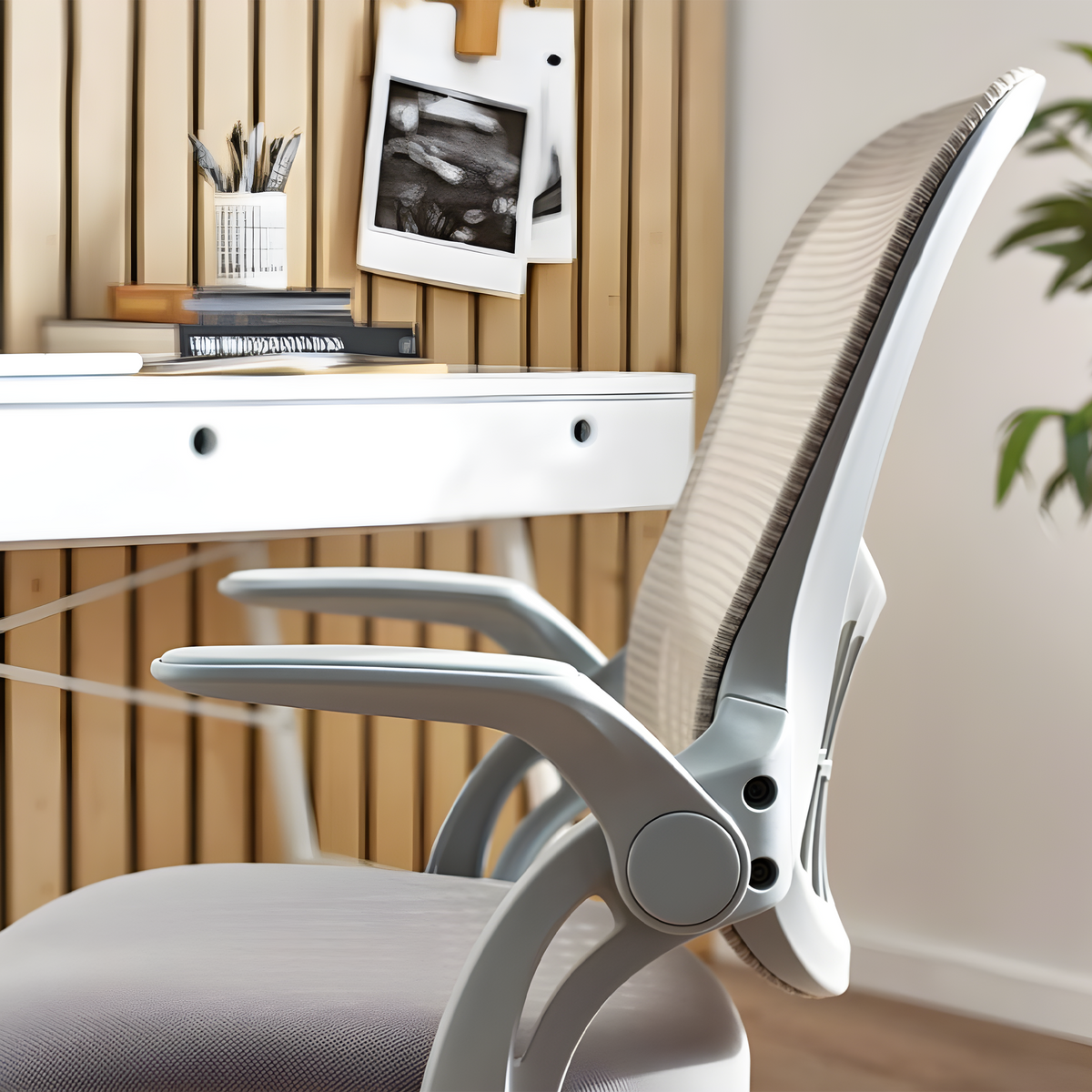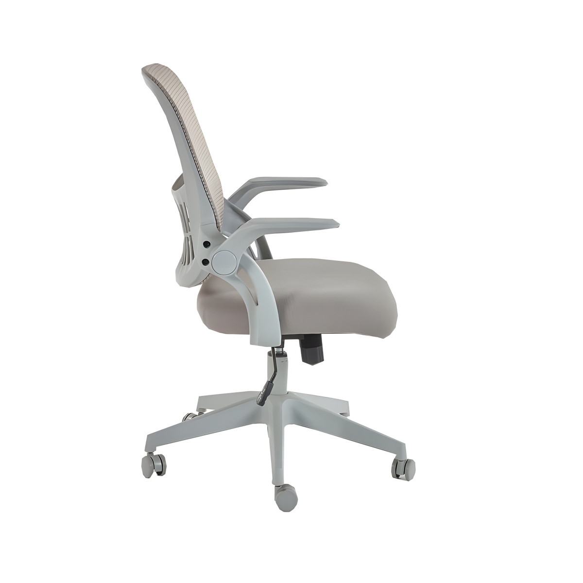 Featuring a curved grey mesh back, this chair ensures optimal support and breathability, keeping you cool and comfortable throughout your workday. Customise your seating experience with the adjustable height and tilt mechanism, allowing you to find the perfect position for productivity. The flip-up armrests offer versatility, letting you switch between extra support and a space-saving design.
