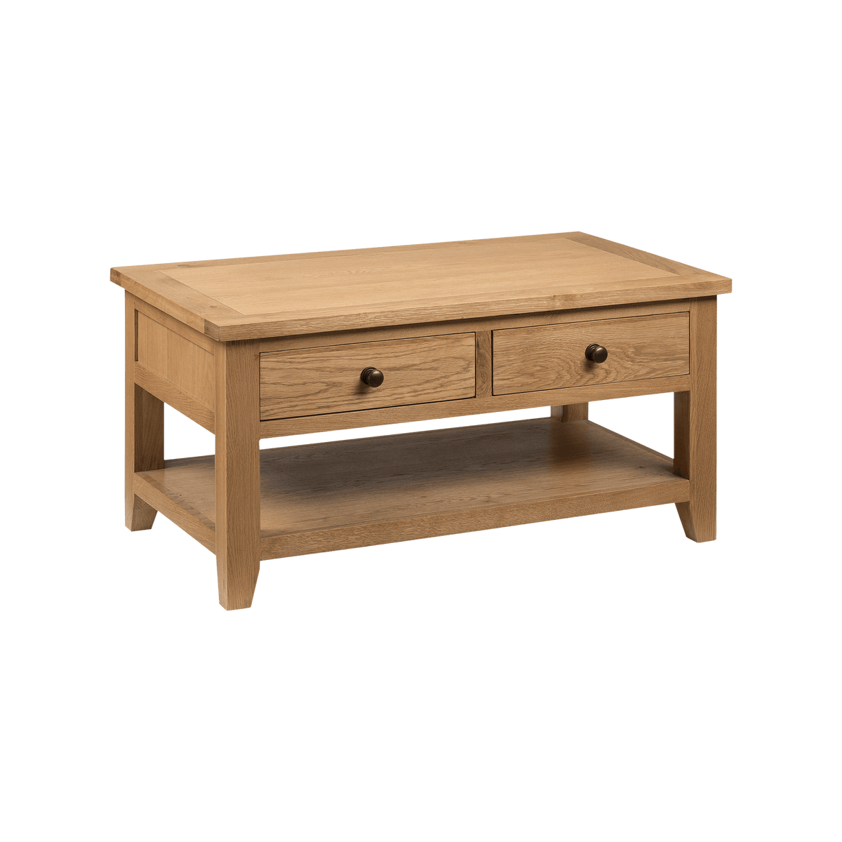This Josie coffee table, crafted with a Waxed Oak Finish, offers a versatile look that complements both modern and period surroundings. It features a handy storage shelf and two full-depth drawers, accessible from either side, providing ample space for your essentials. Ideal for adding a touch of elegance and functionality to your living space.