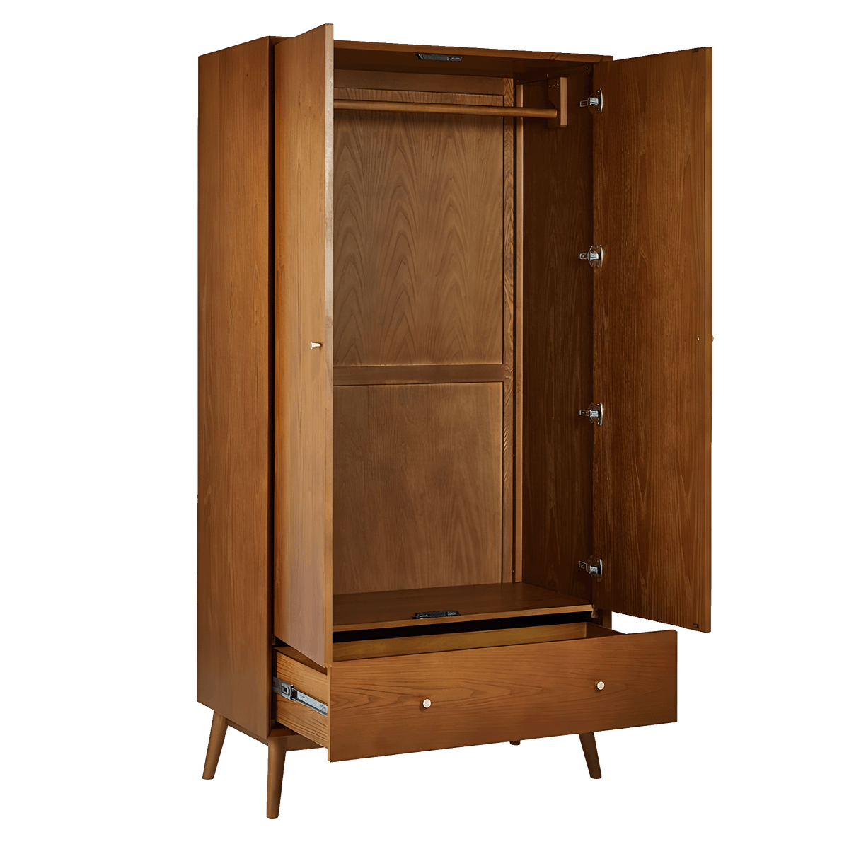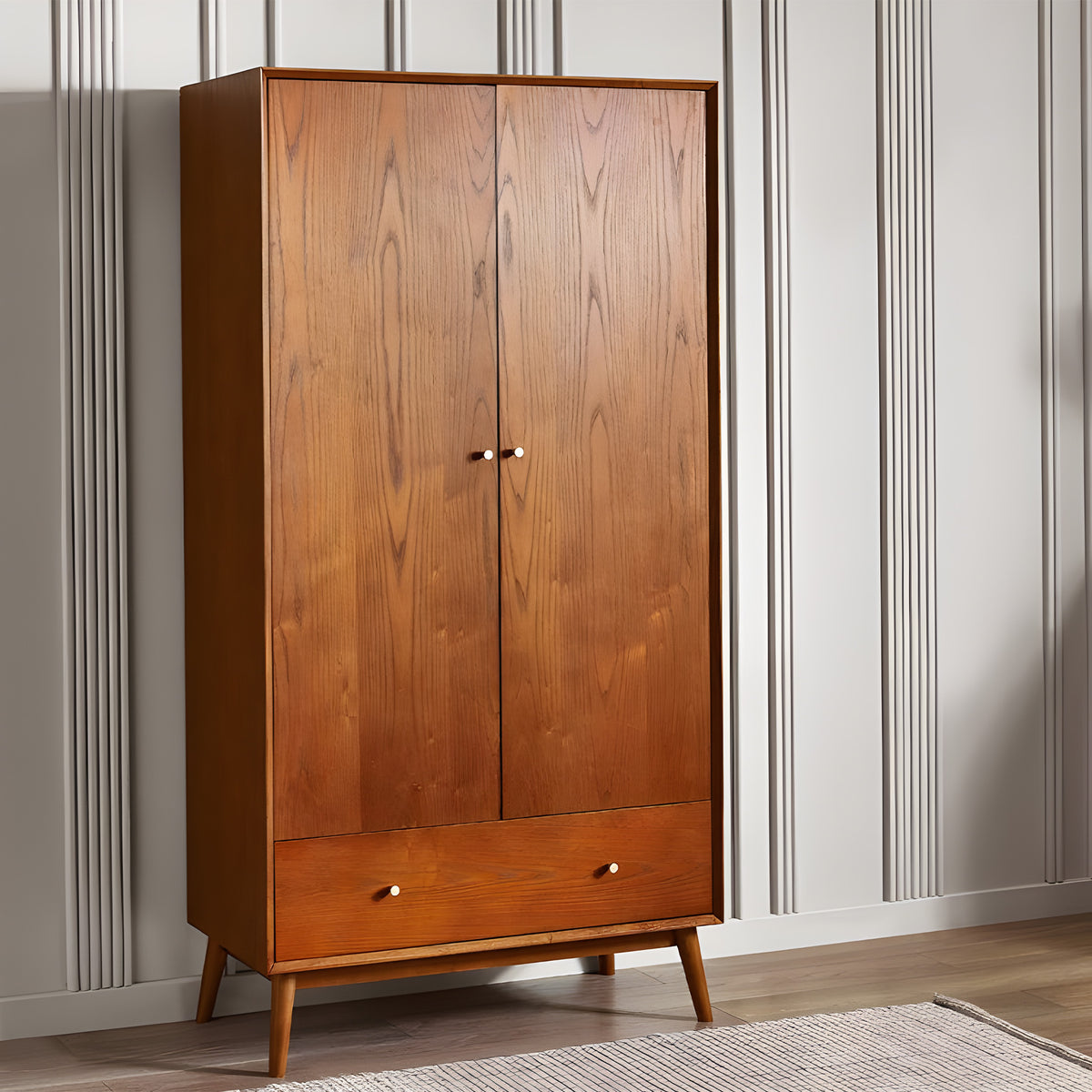 Crafted from exquisite cherry ash wood veneer, this wardrobe brings warmth and sophistication to your space. The design features soft-touch doors, providing effortless access to ample storage space. With a spacious drawer and plenty of hanging room inside, it meets all your storage needs.